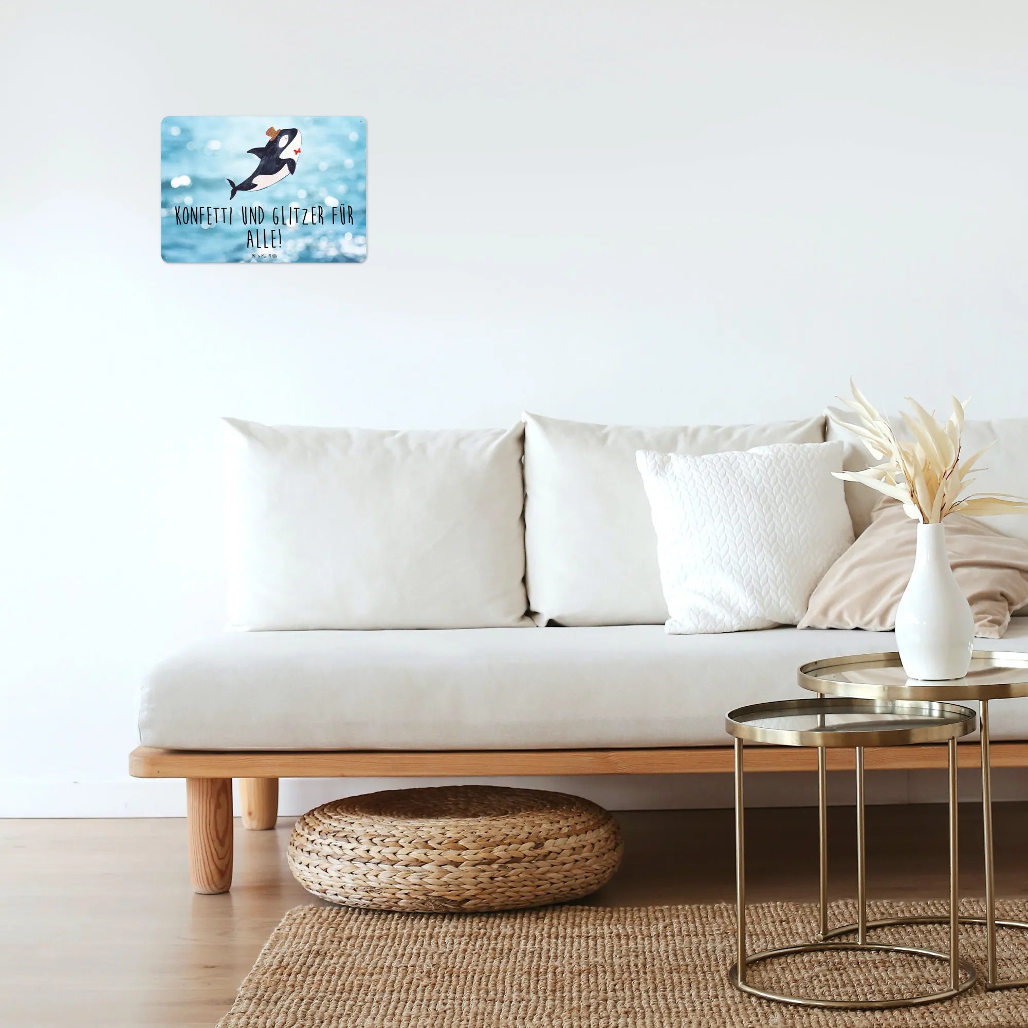 Ein wunderschönes und edles Blechschild von Mr. & Mrs. Panda, das das Herz eines jeden Meerestiere-Liebhabers höher schlagen lässt! Mit einem charmanten Motiv eines Orcas, der einen Zylinder trägt und verspielten Glitzer-Elementen, zieht dieses Schild alle Blicke auf sich.
