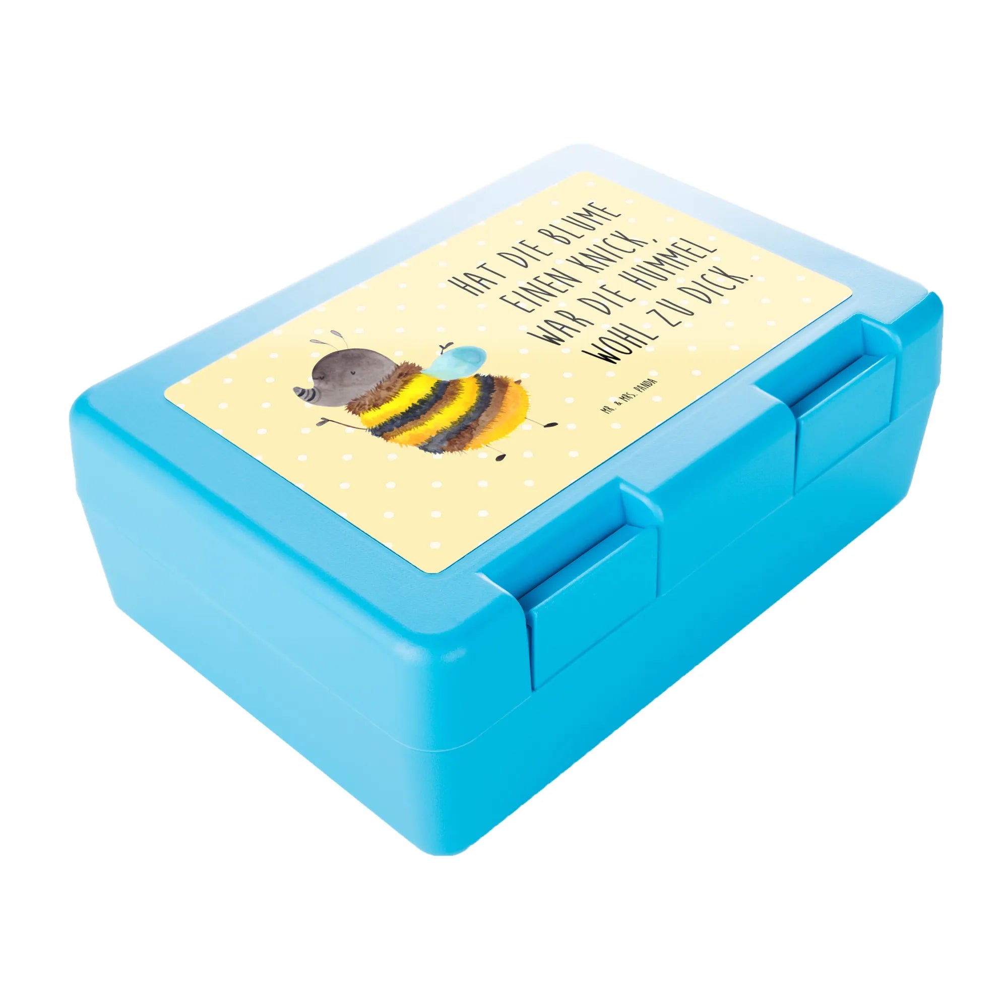 Unsere niedliche Brotdose mit der flauschigen Hummel ist ein echter Gute-Laune-Bringer. Das liebevoll von Mrs. Panda aquarellierte Motiv strahlt in warmem Gelb und Schwarz und trägt den frechen Spruch: „Hat die Blume einen Knick, war die Hummel wohl zu dick.“ Ein perfekter Begleiter für Schule, Arbeit und Picknick.