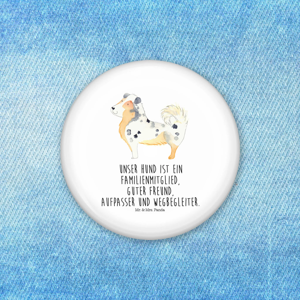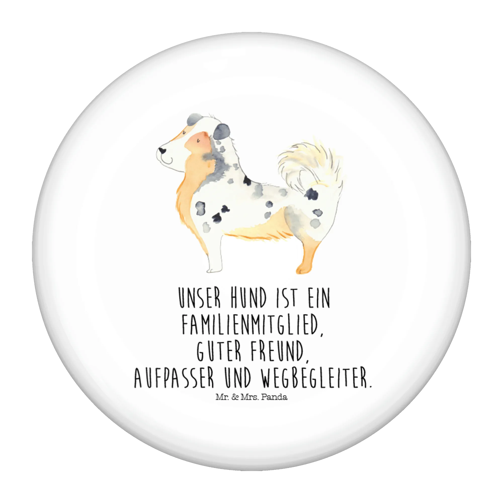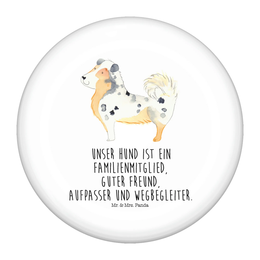 Der 50mm Button mit dem bezaubernden Motiv des Australien Shepherds von Mr. & Mrs. Panda ist das perfekte Geschenk für alle Hundeliebhaber! Dieser Anstecker zeigt nicht nur einen knuffigen Australian Shepherd, sondern trägt auch den liebevollen Spruch: "Unser Hund ist ein Familienmitglied, guter Freund, Aufpasser und Wegbegleiter." Ob für dich selbst oder als wunderschönes Geschenk für Freunde und Familie - dieser Button bringt Hundeliebe in jedes Outfit!