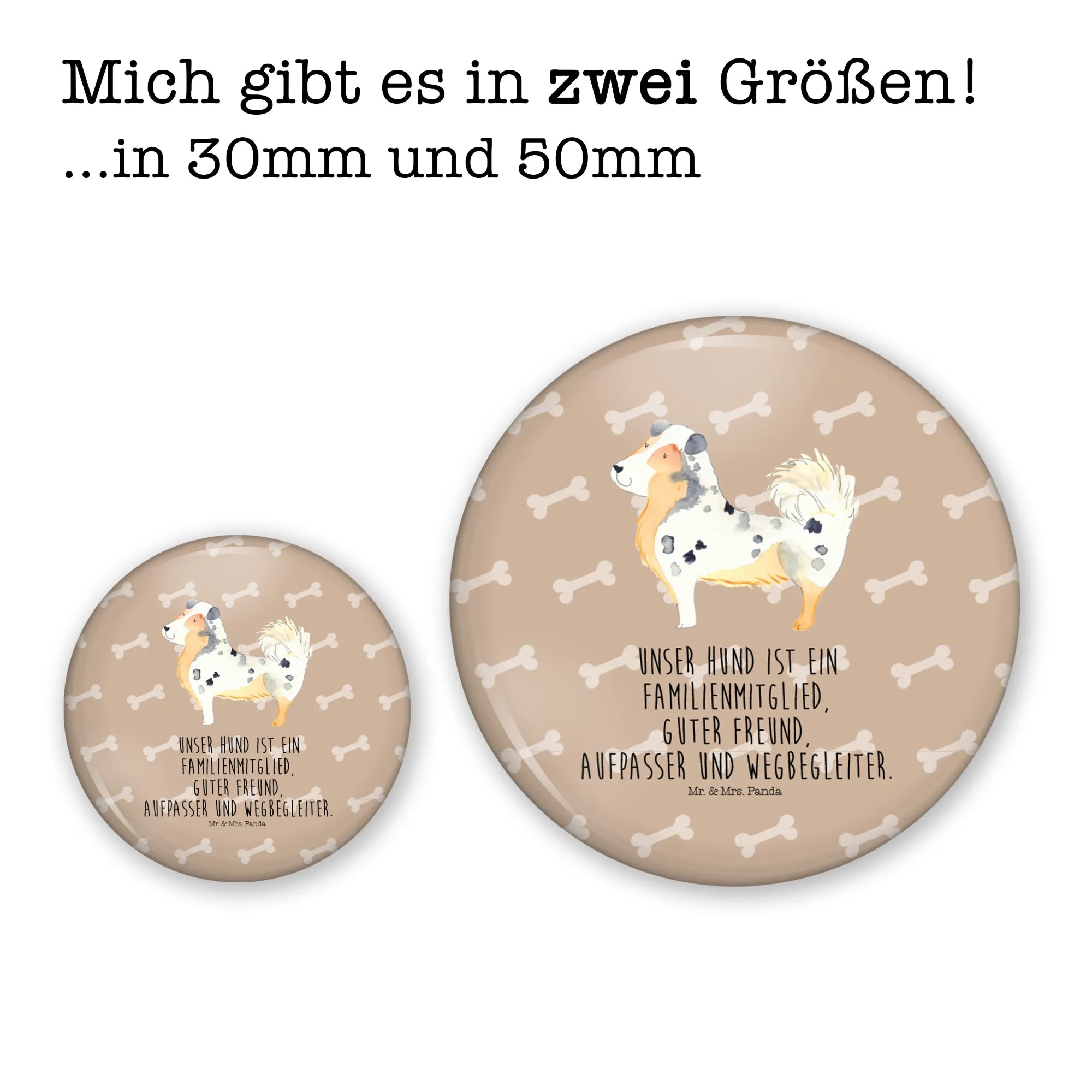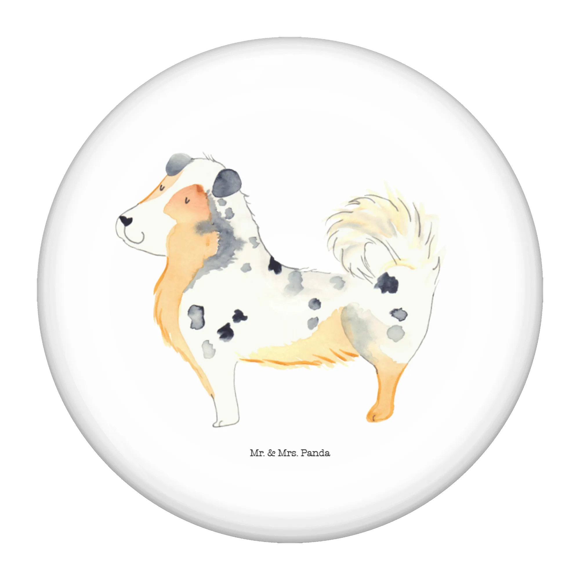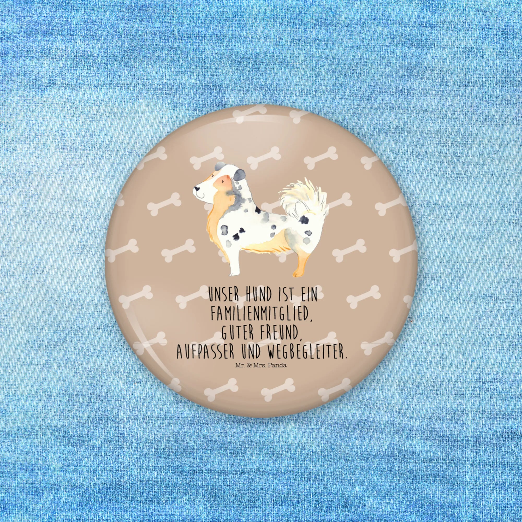 Der 50mm Button mit dem bezaubernden Motiv des Australien Shepherds von Mr. & Mrs. Panda ist das perfekte Geschenk für alle Hundeliebhaber! Dieser Anstecker zeigt nicht nur einen knuffigen Australian Shepherd, sondern trägt auch den liebevollen Spruch: "Unser Hund ist ein Familienmitglied, guter Freund, Aufpasser und Wegbegleiter." Ob für dich selbst oder als wunderschönes Geschenk für Freunde und Familie - dieser Button bringt Hundeliebe in jedes Outfit!