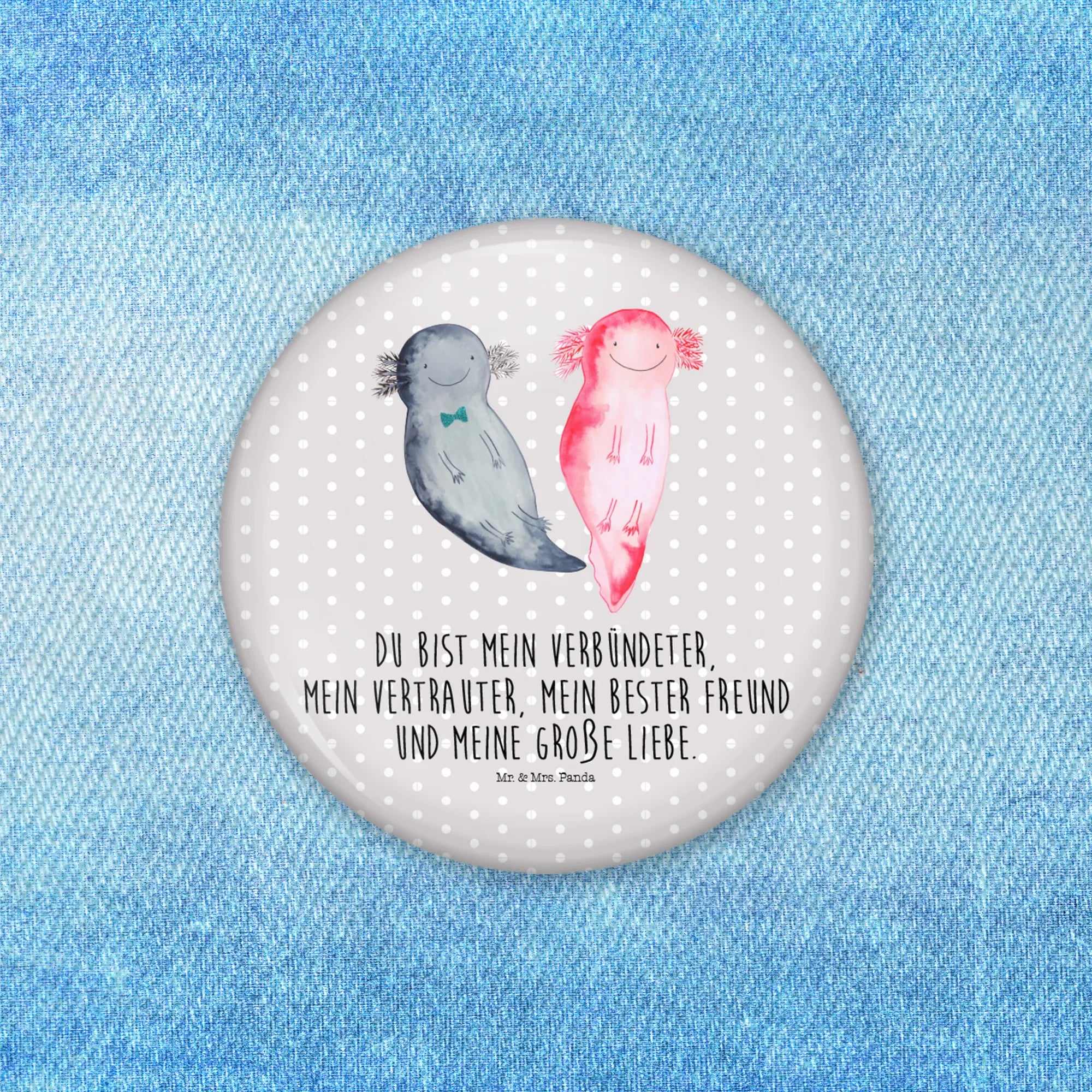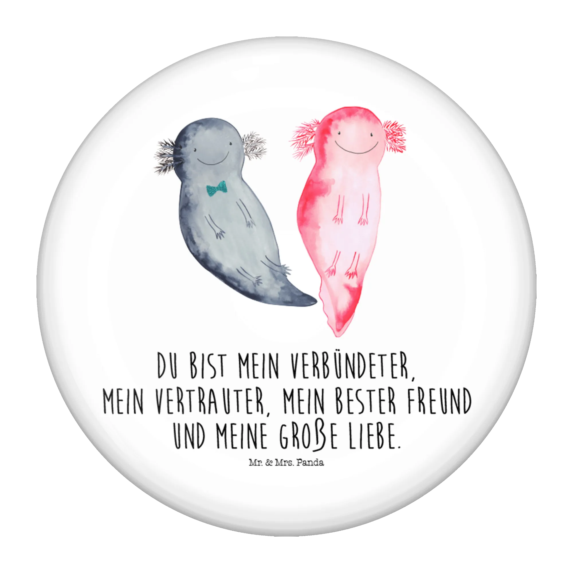Überrasche Deinen Partner mit einem Liebesbeweis, der von Herzen kommt! Die Axolotl Kollektion von Mr. & Mrs. Panda bietet Dir nicht nur diesen Button, sondern auch viele weitere Produkte, die die süßen Lurche in den Mittelpunkt stellen. Jeder Button wurde mit viel Liebe von Mrs. Panda gestaltet und bringt Freude in den Alltag.