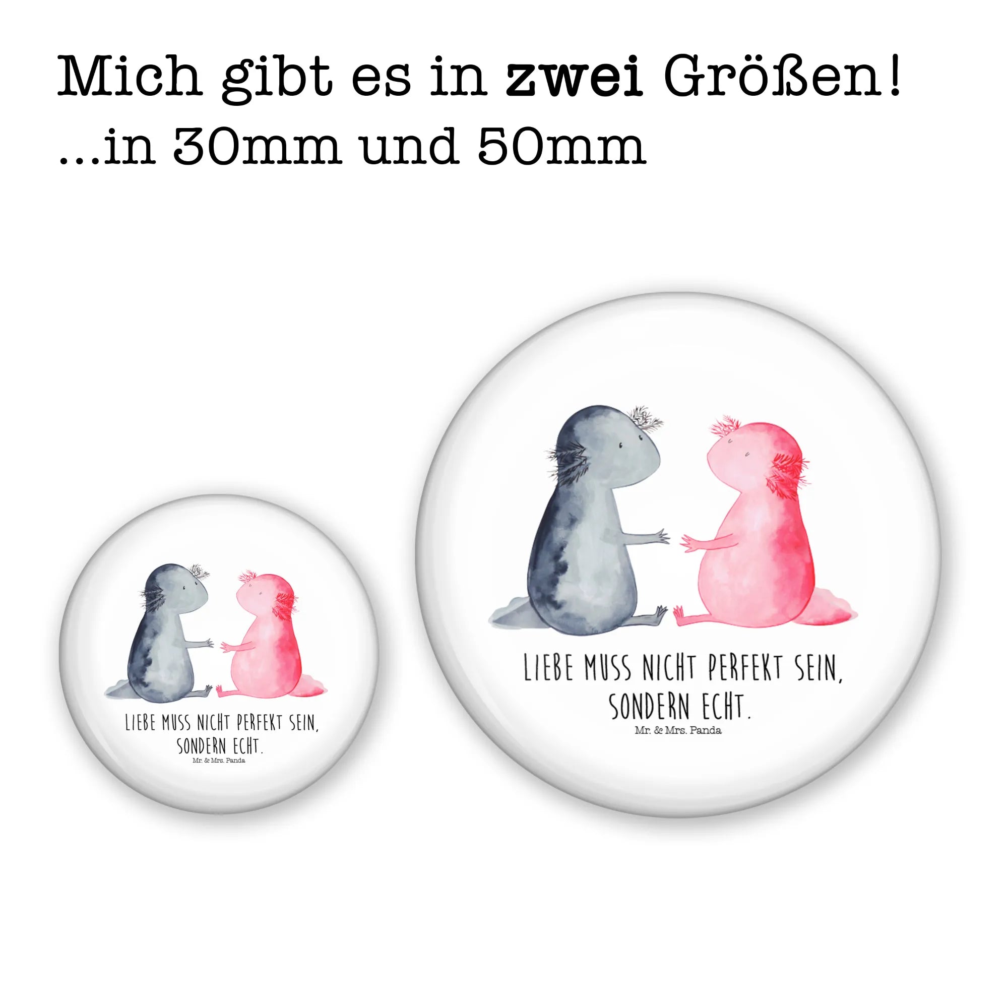 Axolotl Liebe – Mit Text – ein zauberhafter 50mm Button von Mr. & Mrs. Panda, der Herzen höherschlagen lässt. Zwei niedliche Axolotl sitzen sich gegenüber, halten Händchen und werden von dem warmen Spruch „Liebe muss nicht perfekt sein, sondern echt.“ begleitet. Dieses Motiv ist handgezeichnet von Mrs. Panda und strahlt liebevolle Details sowie einen Hauch Aquarell-Charme aus.