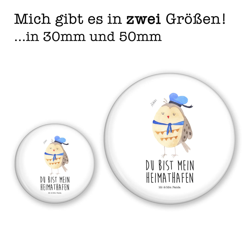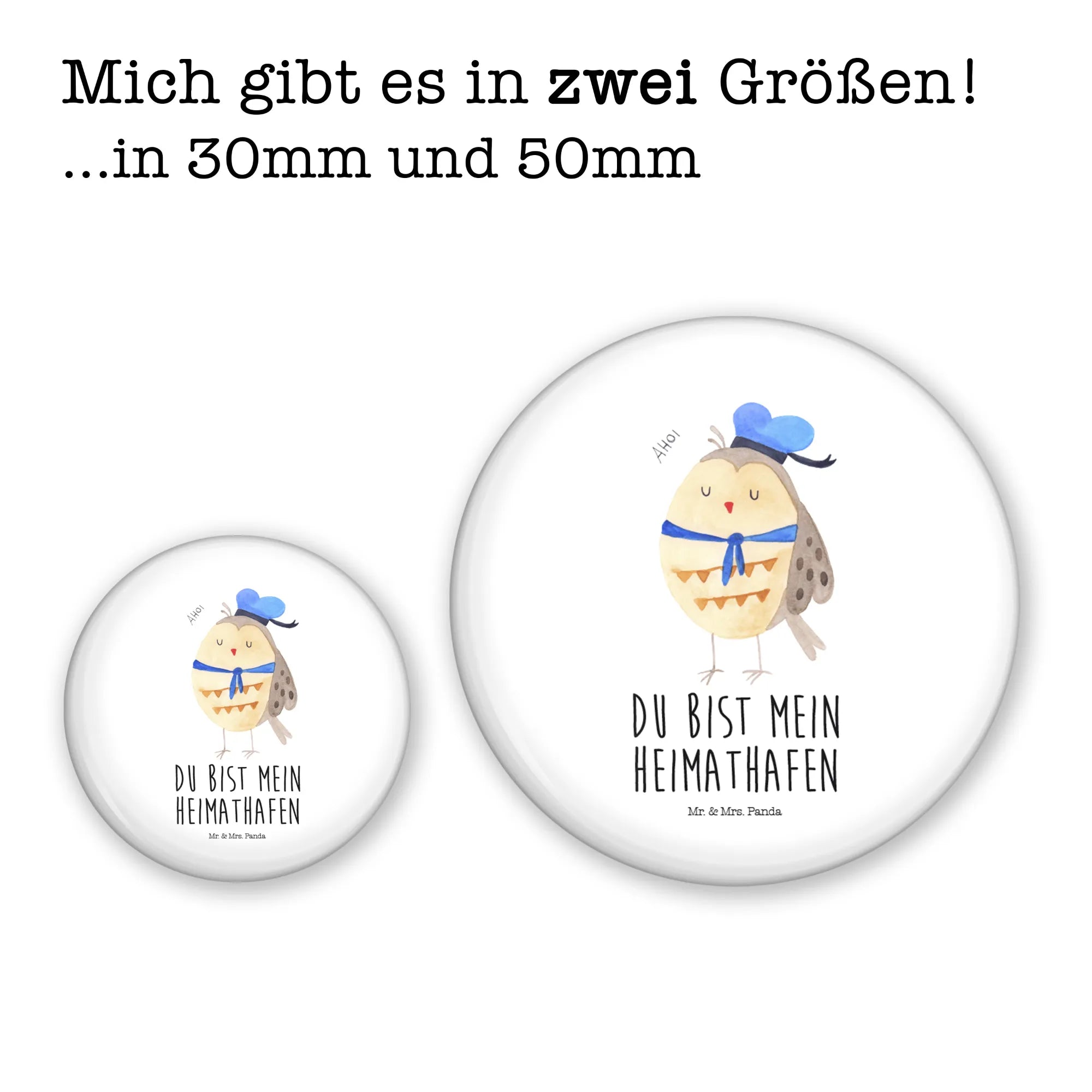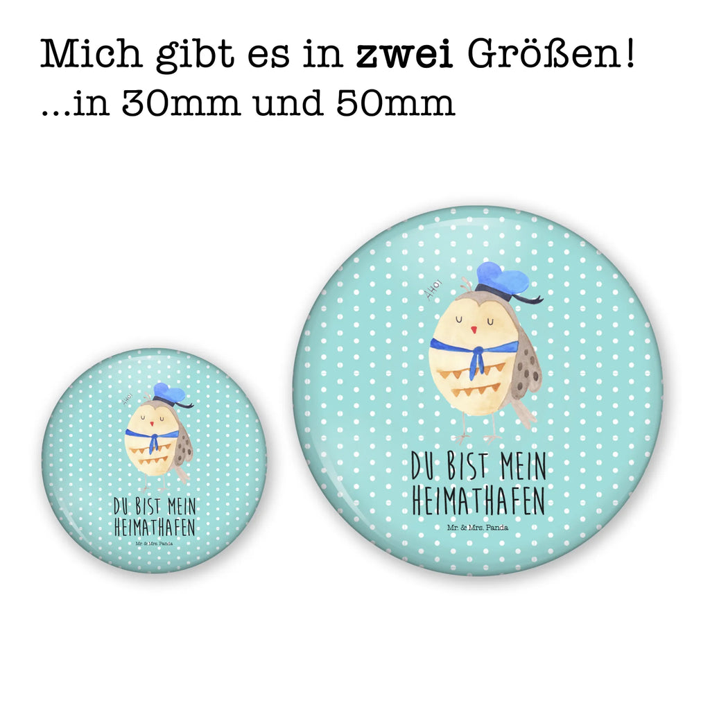 Bist du auf der Suche nach dem perfekten Geschenk für deine Freundin oder für den Ehepartner? Dann ist der 50mm Button "Eule Matrosen" aus der beliebten Eulen-Kollektion von Mr. & Mrs. Panda genau das Richtige! Mit dem liebevoll gestalteten Motiv einer süßen Eule im Matrosenhut ist dieser Anstecker nicht nur ein toller Hingucker, sondern bringt auch jede Menge Freude. Der Slogan "Du bist mein Heimathafen" macht diesen Button zu einem ganz besonderen und persönlichen Geschenk, das zu besonderen Anlässen wie dem Hochzeitstag oder für einen romantischen Abend perfekt passt. Ob für eine Seemannsliebe oder einfach, um jemandem zu zeigen, wie wichtig er dir ist, dieser Button spricht von Herzen.