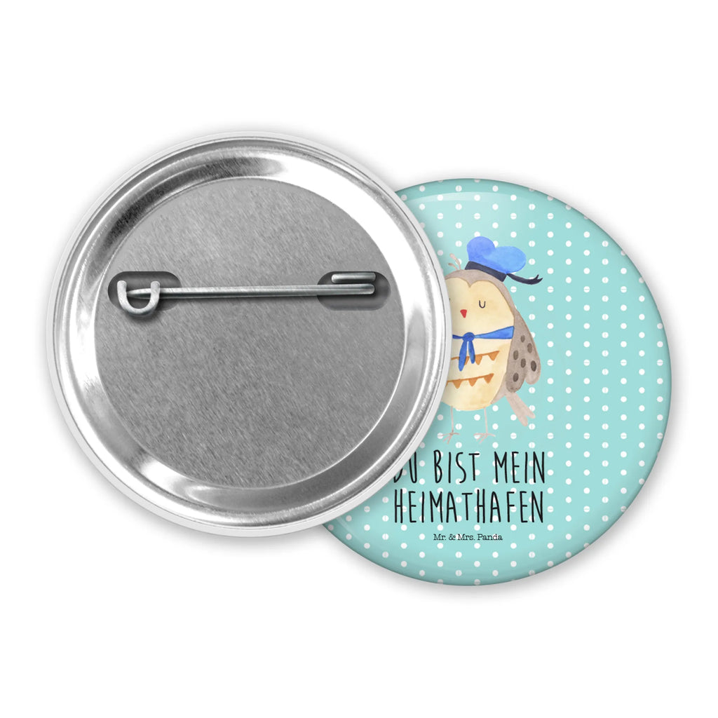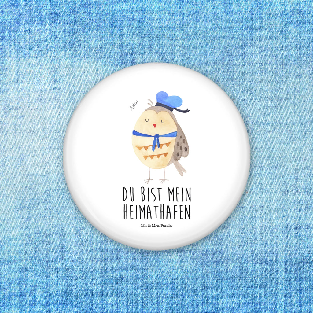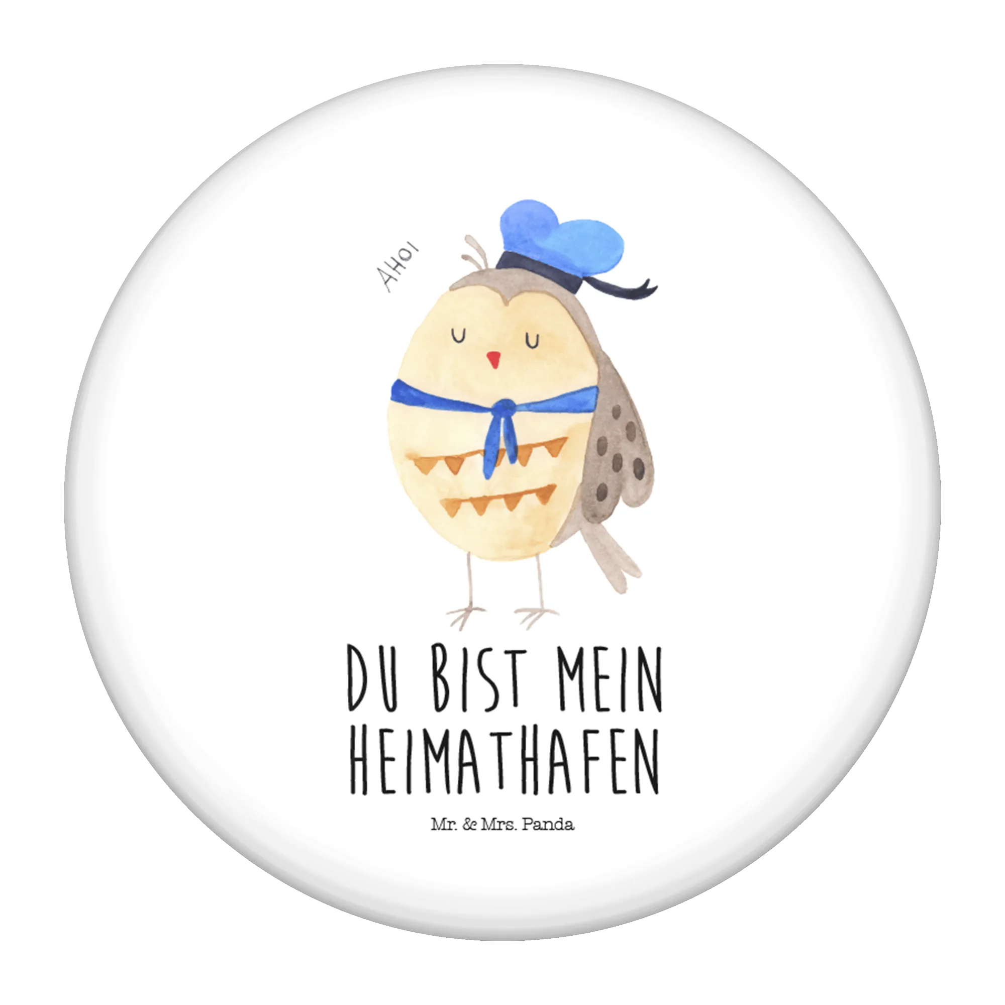 Bist du auf der Suche nach dem perfekten Geschenk für deine Freundin oder für den Ehepartner? Dann ist der 50mm Button "Eule Matrosen" aus der beliebten Eulen-Kollektion von Mr. & Mrs. Panda genau das Richtige! Mit dem liebevoll gestalteten Motiv einer süßen Eule im Matrosenhut ist dieser Anstecker nicht nur ein toller Hingucker, sondern bringt auch jede Menge Freude. Der Slogan "Du bist mein Heimathafen" macht diesen Button zu einem ganz besonderen und persönlichen Geschenk, das zu besonderen Anlässen wie dem Hochzeitstag oder für einen romantischen Abend perfekt passt. Ob für eine Seemannsliebe oder einfach, um jemandem zu zeigen, wie wichtig er dir ist, dieser Button spricht von Herzen.