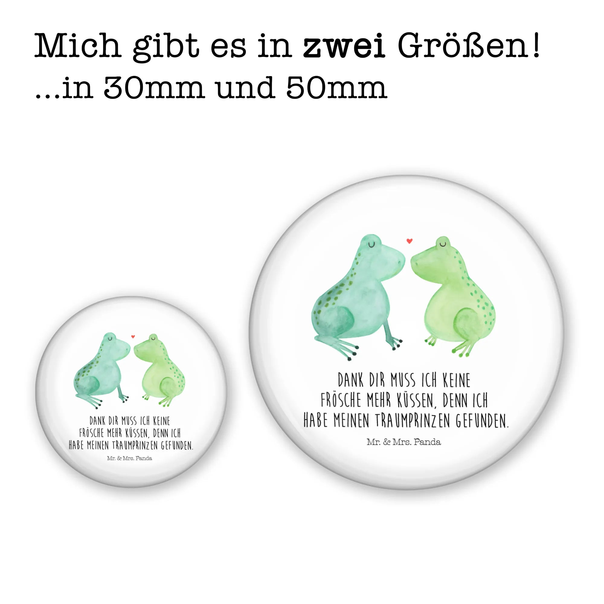 Bist du auf der Suche nach dem perfekten Geschenk, das Liebe, Freude und ein bisschen Magie ausstrahlt? Dann ist unser 50mm Button mit dem süßen Motiv "Frosch Liebe" aus der schönen Liebe Kollektion von Mr. & Mrs. Panda genau das Richtige für dich! Dieser zauberhafte Button zeigt zwei niedliche Frösche, die sich verliebt gegenüberstehen, während über ihren Köpfen ein rotes Herz schwebt. Damit spricht er alle Verliebten, frisch Verlobten und Hochzeitspaare an. Egal ob zum Jahrestag, Hochzeitstag oder einfach nur als kleines Liebesgeschenk – dieser Button ist ein wahrer Liebesbeweis!