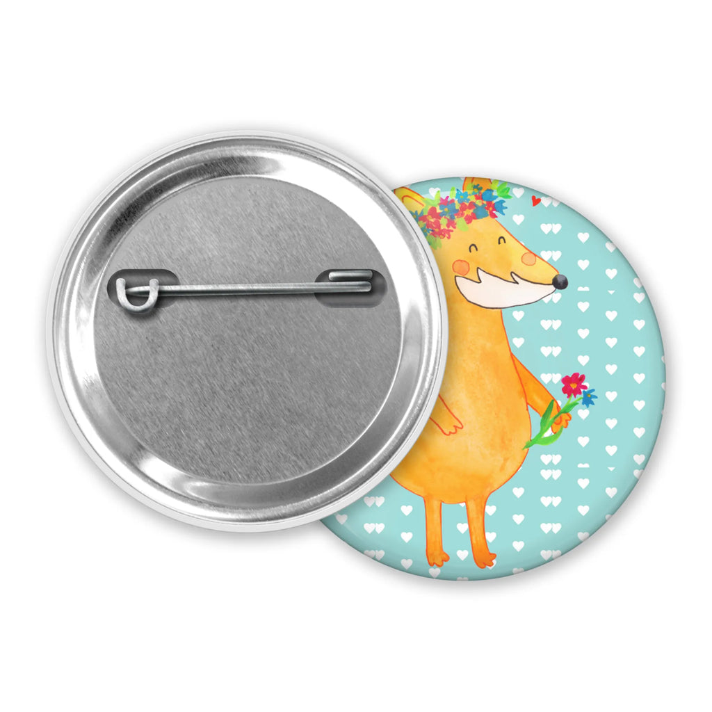 Entdecke den bezaubernden 50mm Button mit dem einzigartigen Motiv "Fuchs Blumenliebe" aus der besonderen Fuchs-Kollektion von Mr. & Mrs. Panda!