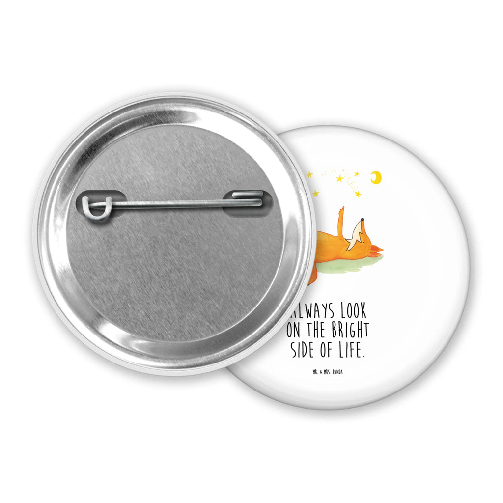 Der Fuchs auf dem Button liegt entspannt auf dem Rücken und blickt verträumt zu den funkelnden Sternen empor – ein Bild, das zum Träumen anregt und die Vorstellungskraft anregt.