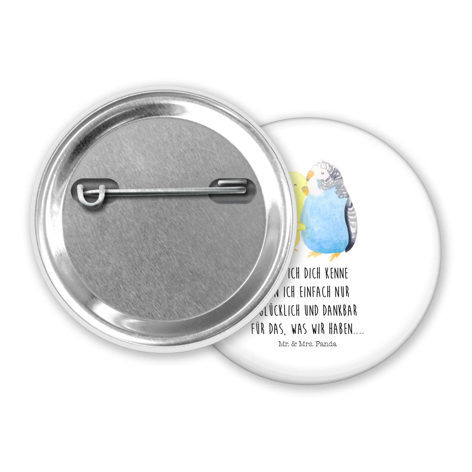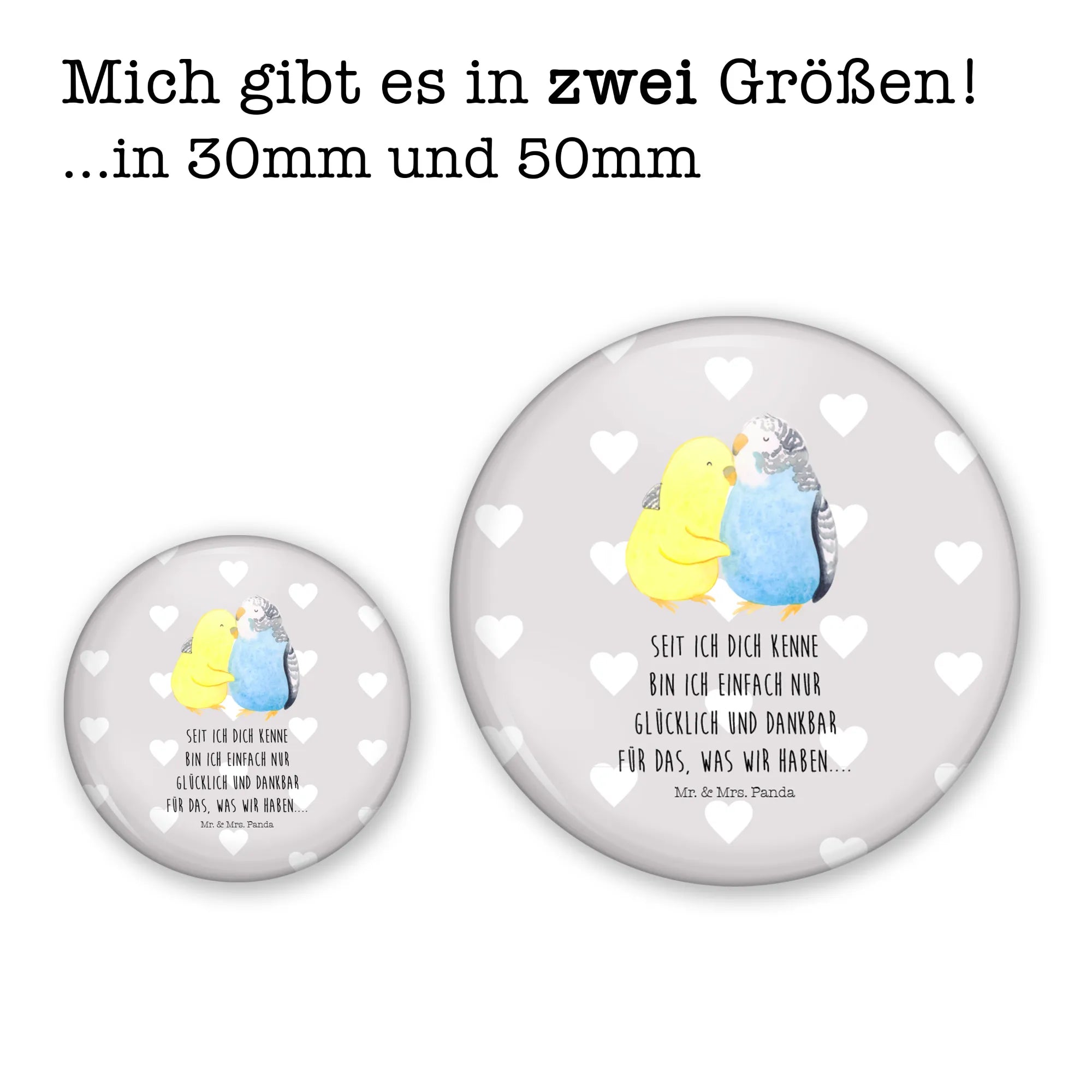 Wenn du nach einem einzigartigen und liebevollen Geschenk suchst, das das Herz deines Lieblings zum Schmelzen bringt, dann ist der 50mm Button "Wellensittich Liebe" aus der Kollektion Liebe von Mr. & Mrs. Panda genau das Richtige für dich! Dieser zarte Anstecker zeigt ein Paar süßer Wellensittiche, die sich liebevoll aneinander kuscheln – ein Symbol für Nähe, Vertrauen und unendliche Zuneigung.