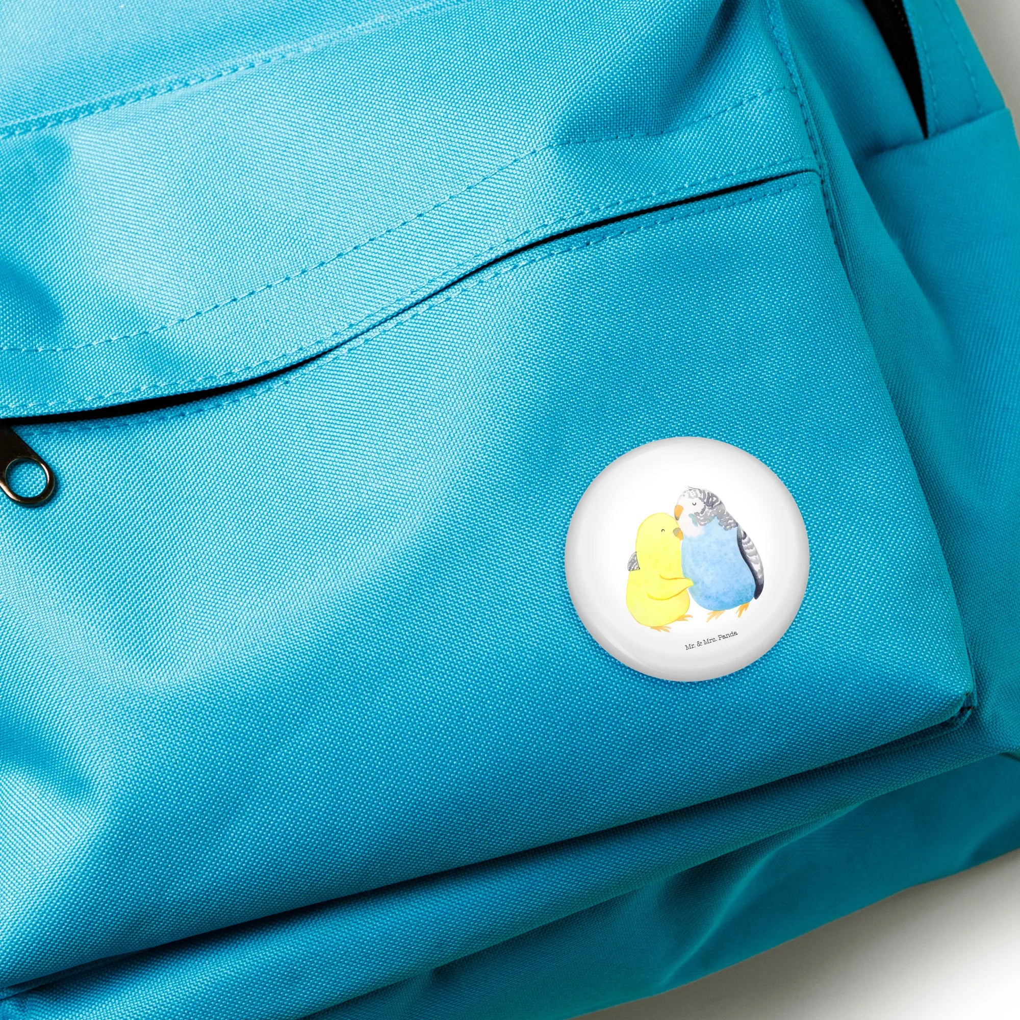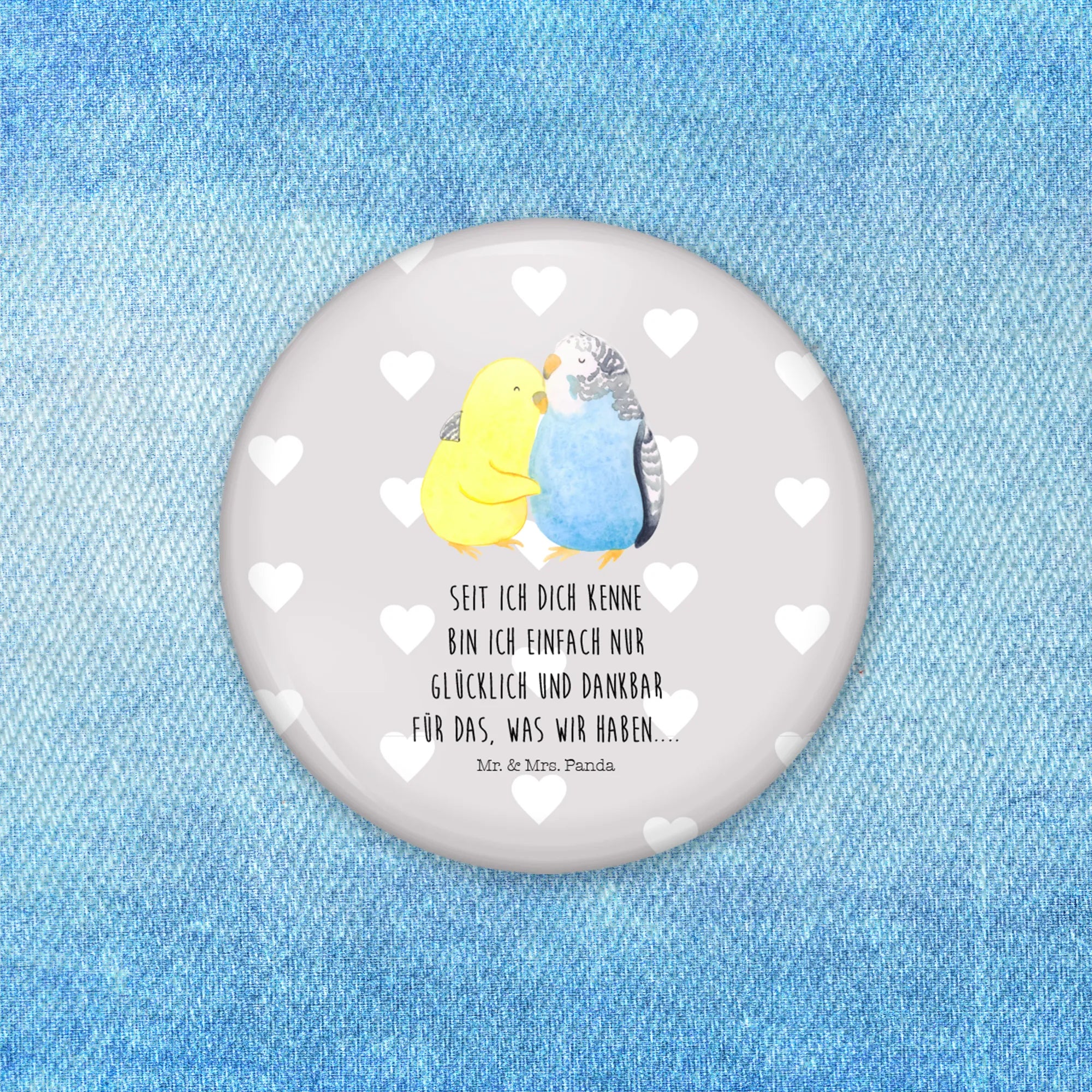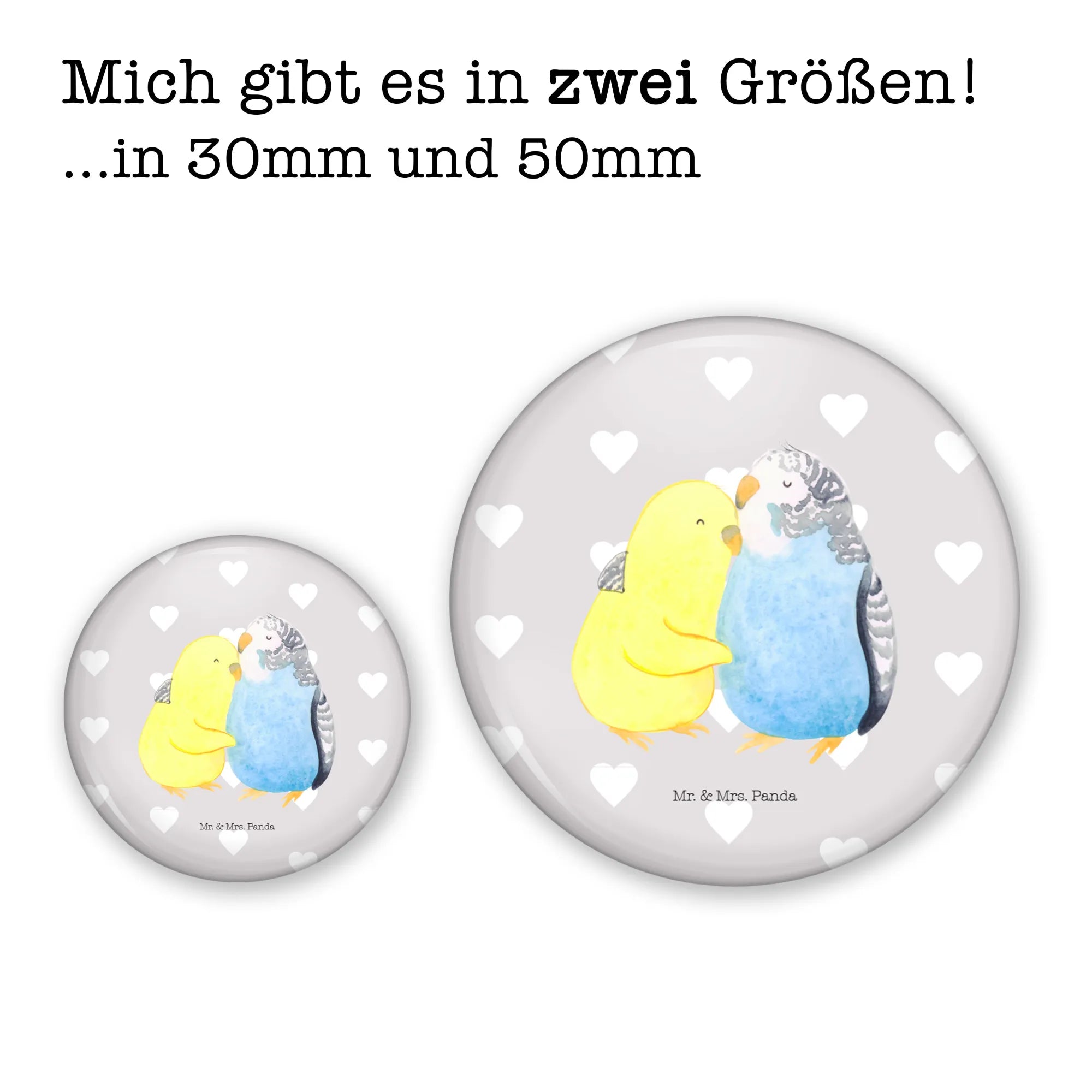 Der 50mm Button "Wellensittich Liebe" aus der bezaubernden Liebe Kollektion von Mr. & Mrs. Panda ist das perfekte Geschenk für alle Verliebten und Vogelliebhaber! Dieses charmante Accessoire ziert ein wunderschönes Motiv von zwei kuschelnden Wellensittichen, die innig miteinander verbunden sind.