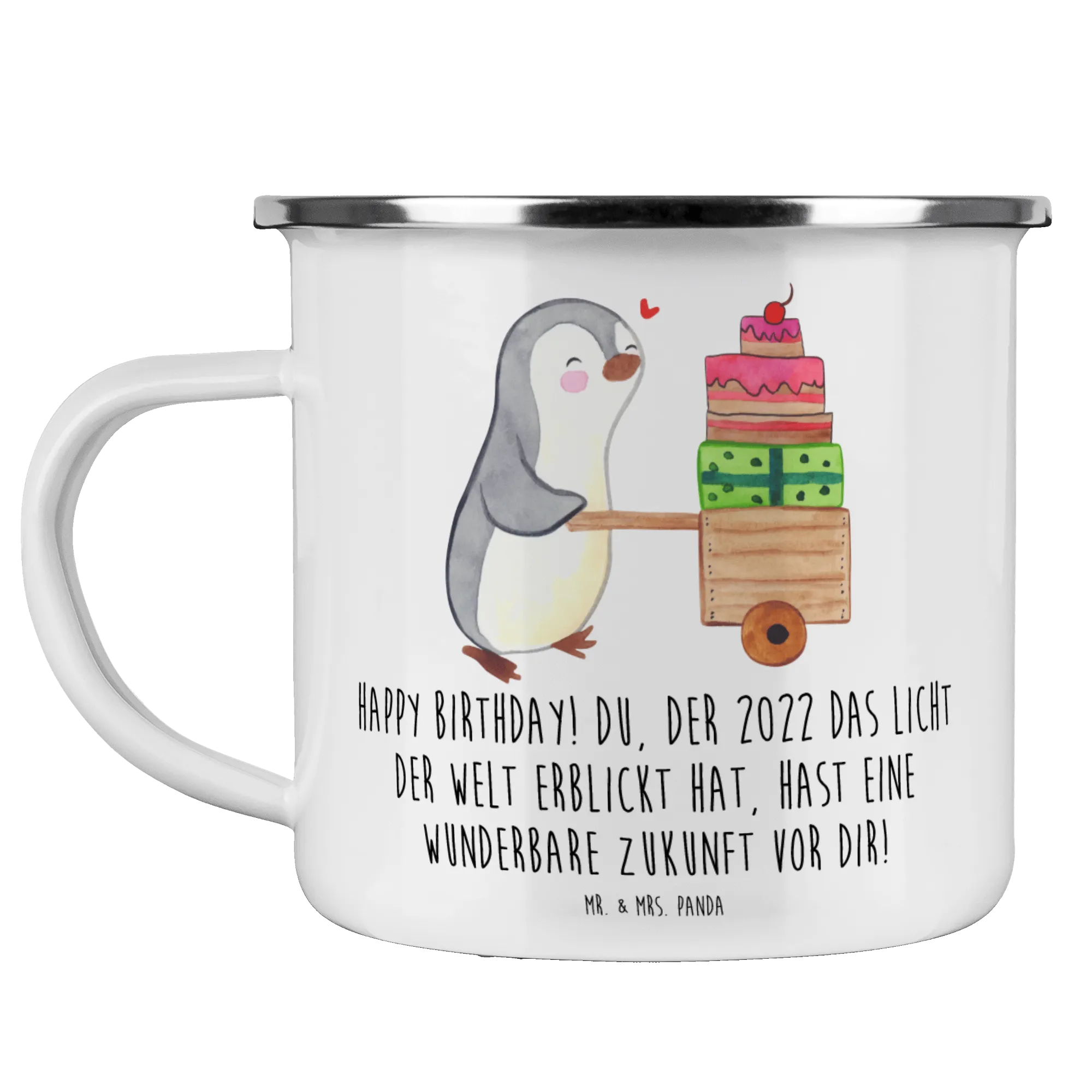 Die Camping Emaille Tasse von Mr. & Mrs. Panda ist das perfekte Geschenk für alle, die die Natur lieben und gerne unterwegs sind. Mit einem atemberaubenden Motiv, das den Geburtstag 2022 feiert, und dem fröhlichen Slogan 'Happy Birthday! Du, der 2022 das Licht der Welt erblickt hat, hast eine wunderbare Zukunft vor dir!' ist diese Tasse nicht nur ein praktischer Begleiter beim Camping oder Wandern, sondern auch ein liebevolles Andenken zum Geburtstag.