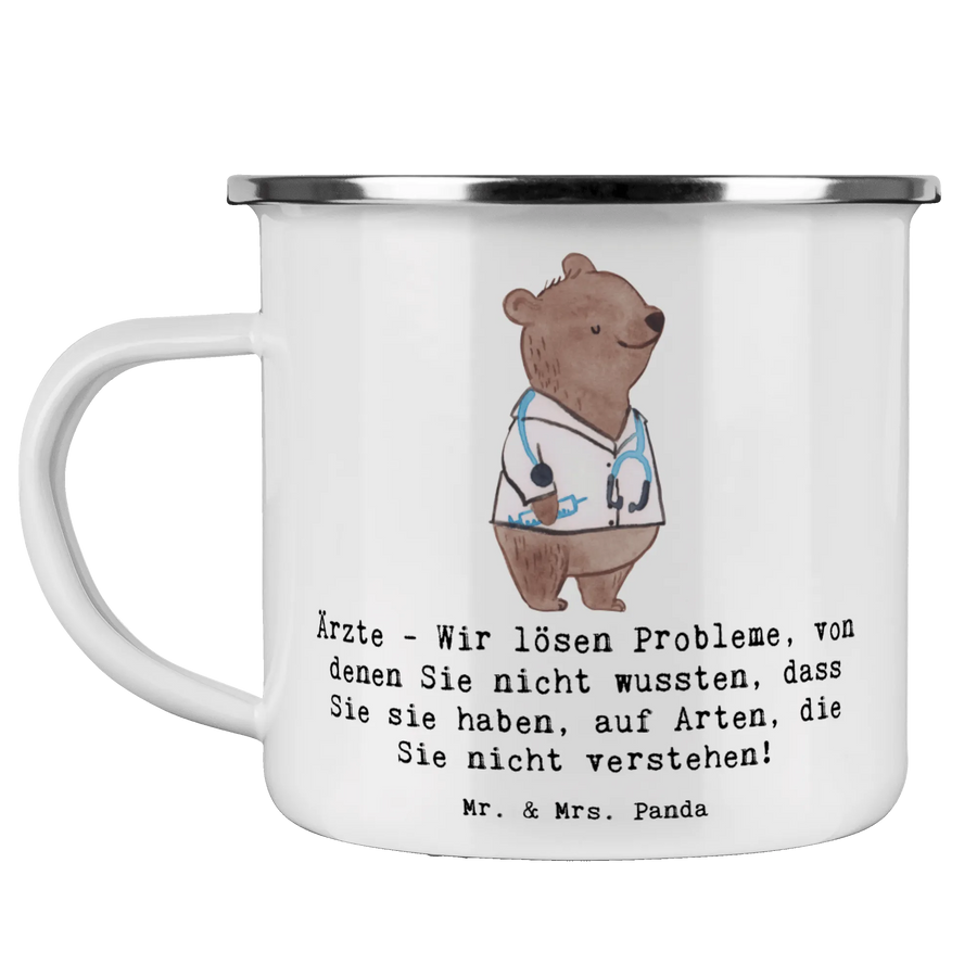 Die Camping Emaille Tasse Arzt von Mr. & Mrs. Panda ist das perfekte Geschenk für alle, die in der medizinischen Branche arbeiten. Mit einem liebevoll gestalteten Motiv und dem witzigen Slogan "Ärzte - Wir lösen Probleme, von denen Sie nicht wussten, dass Sie sie haben, auf Arten, die Sie nicht verstehen!" bringt sie nicht nur Freude, sondern auch ein Lächeln in den Alltag.