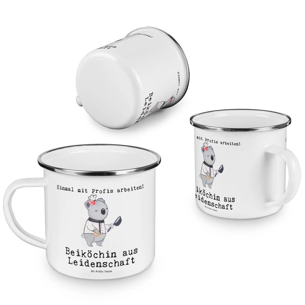Die Camping Emaille Tasse "Beiköchin aus Leidenschaft" von Mr. & Mrs. Panda ist das ideale Geschenk für alle, die gerne in der Küche stehen und ihre Leidenschaft fürs Kochen mit einem Hauch von Abenteuer verbinden.