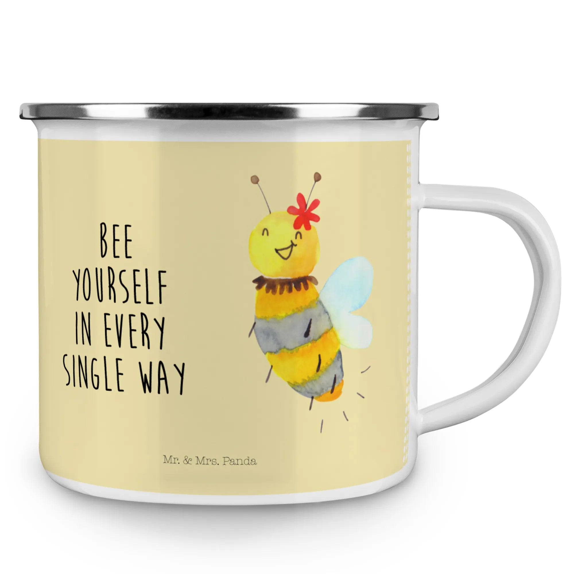 Jedes Stück dieser Kollektion ist mit Liebe von Mr. & Mrs. Panda gestaltet, wobei die süße Biene mit der blühenden Blume auf ihrem Kopf deinem Tag einen fröhlichen Akzent verleiht. Egal ob als Geschenk für einen Freund oder für dich selbst, die Camping Emaille Tasse ist ideal für alle, die die Natur lieben und sich von ihrem bunten Treiben inspirieren lassen möchten.