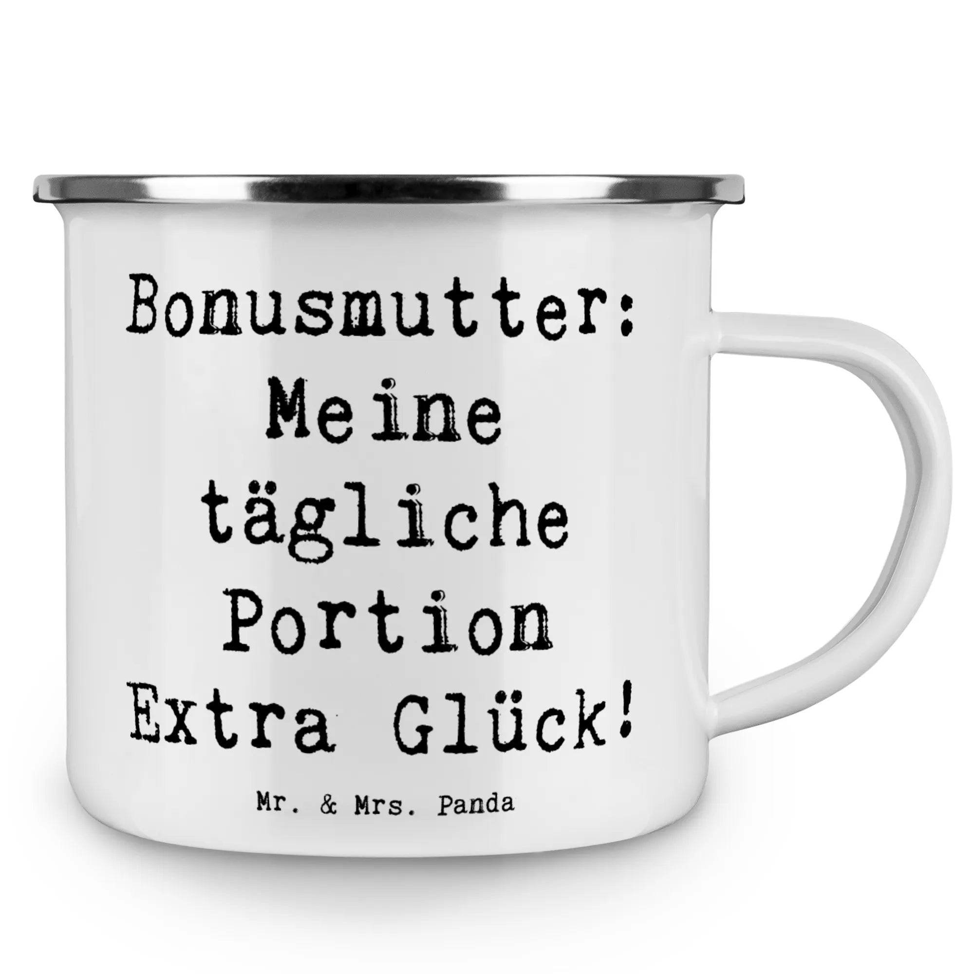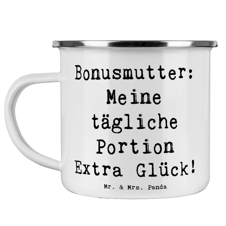 Die Camping Emaille Tasse mit dem liebevollen Motiv "Bonusmutter: Meine tägliche Portion Extra Glück!" von Mr. & Mrs. Panda ist das perfekte Geschenk für alle Bonusmütter, die in der Familie eine besondere Rolle einnehmen. Egal, ob zum Muttertag, Geburtstag oder einfach als Dankeschön - diese Tasse sagt mehr als tausend Worte!