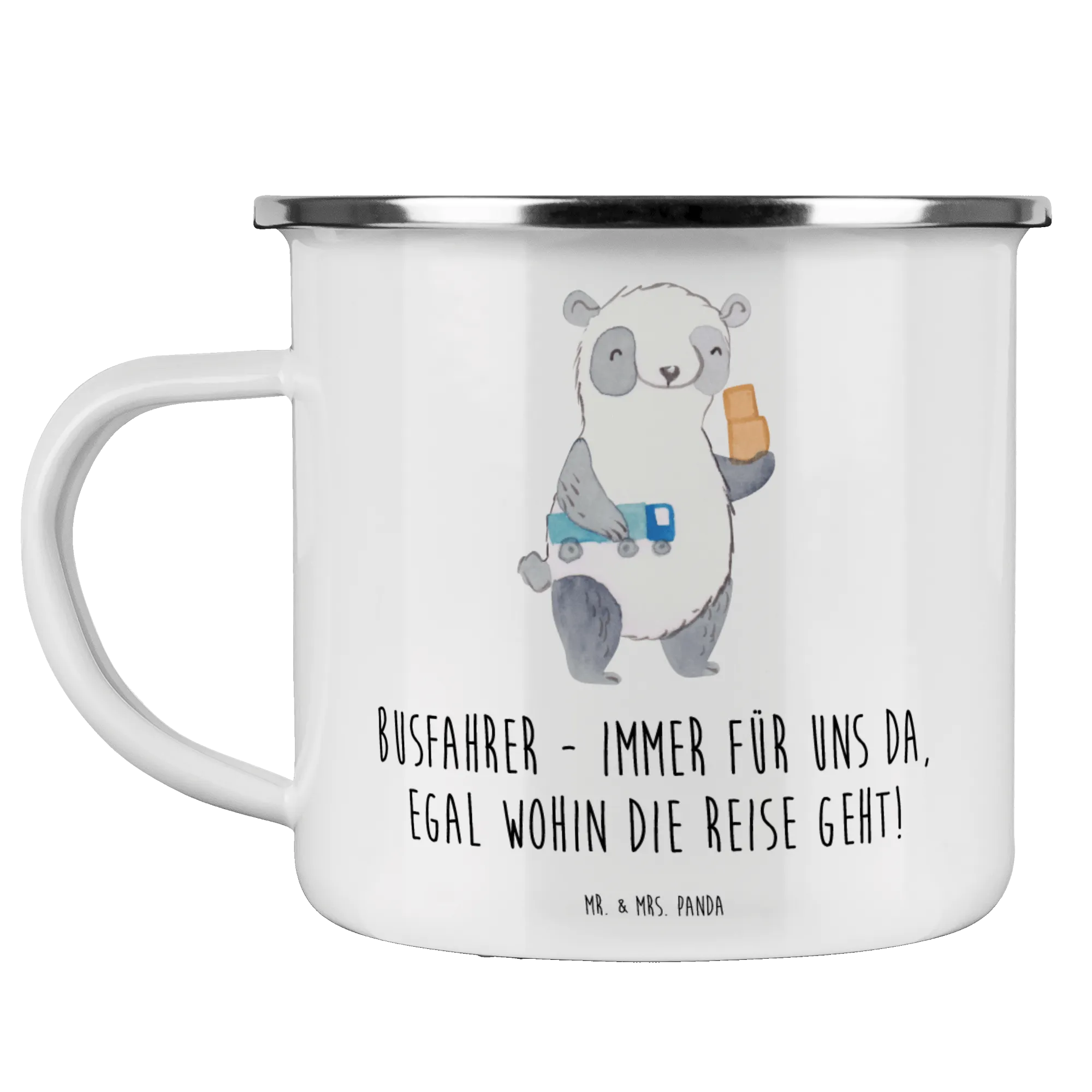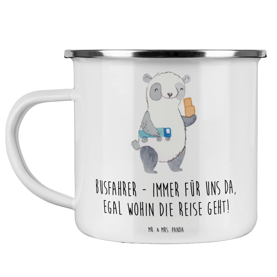 Die Camping Emaille Tasse 'Busfahrer' von Mr. & Mrs. Panda ist das perfekte Geschenk für alle, die gerne unterwegs sind. Ob beim Campen, Wandern oder einfach nur im Garten – diese Tasse ist ein treuer Begleiter für heiße und kalte Getränke.
