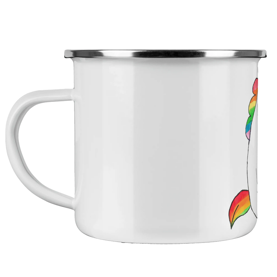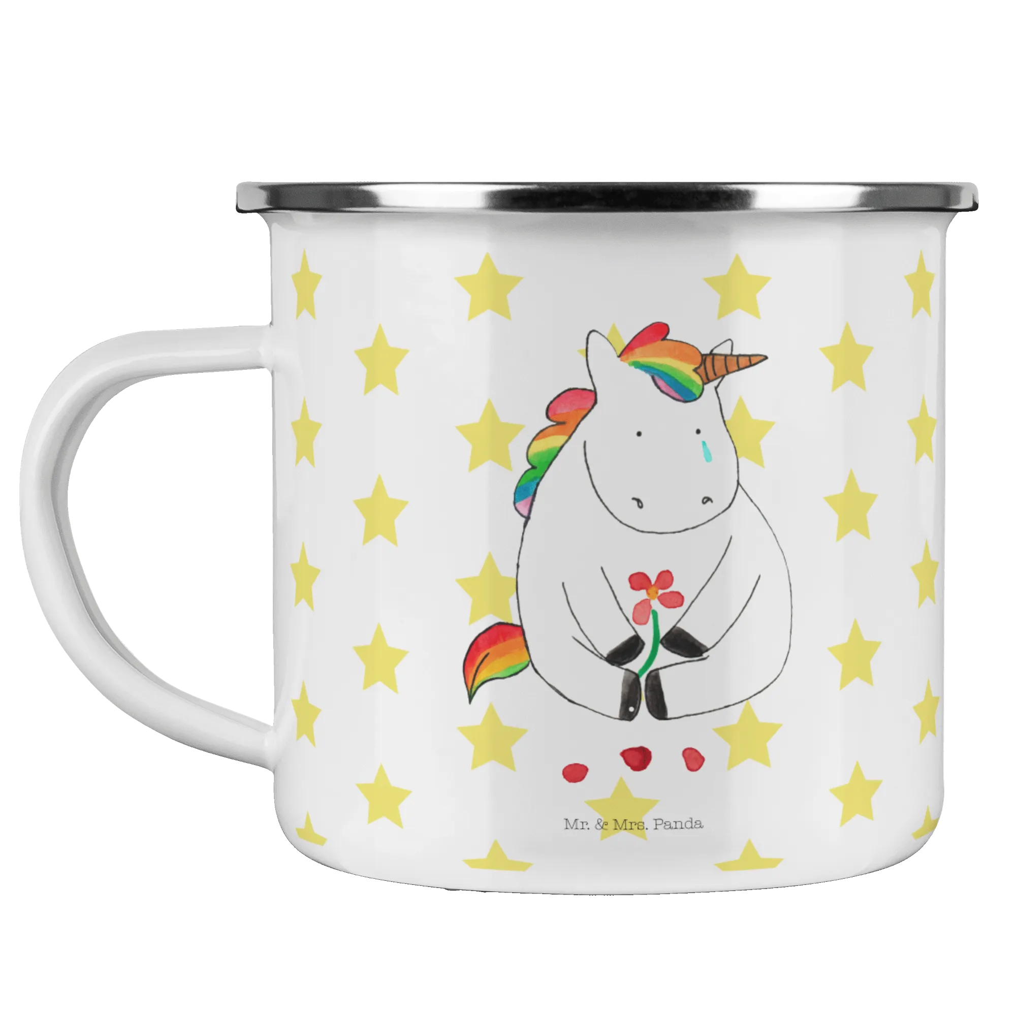 Die Camping Emaille Tasse mit dem zauberhaften Motiv "Einhorn Traurig" von Mr. & Mrs. Panda ist genau das richtige Geschenk für Freunde, die das Besondere lieben! Mit ihren 300 ml Füllmenge aus kratzfester Emaille ist sie ideal für alle Abenteuer in der Natur - sei es beim Camping, Wandern oder einfach im Garten.