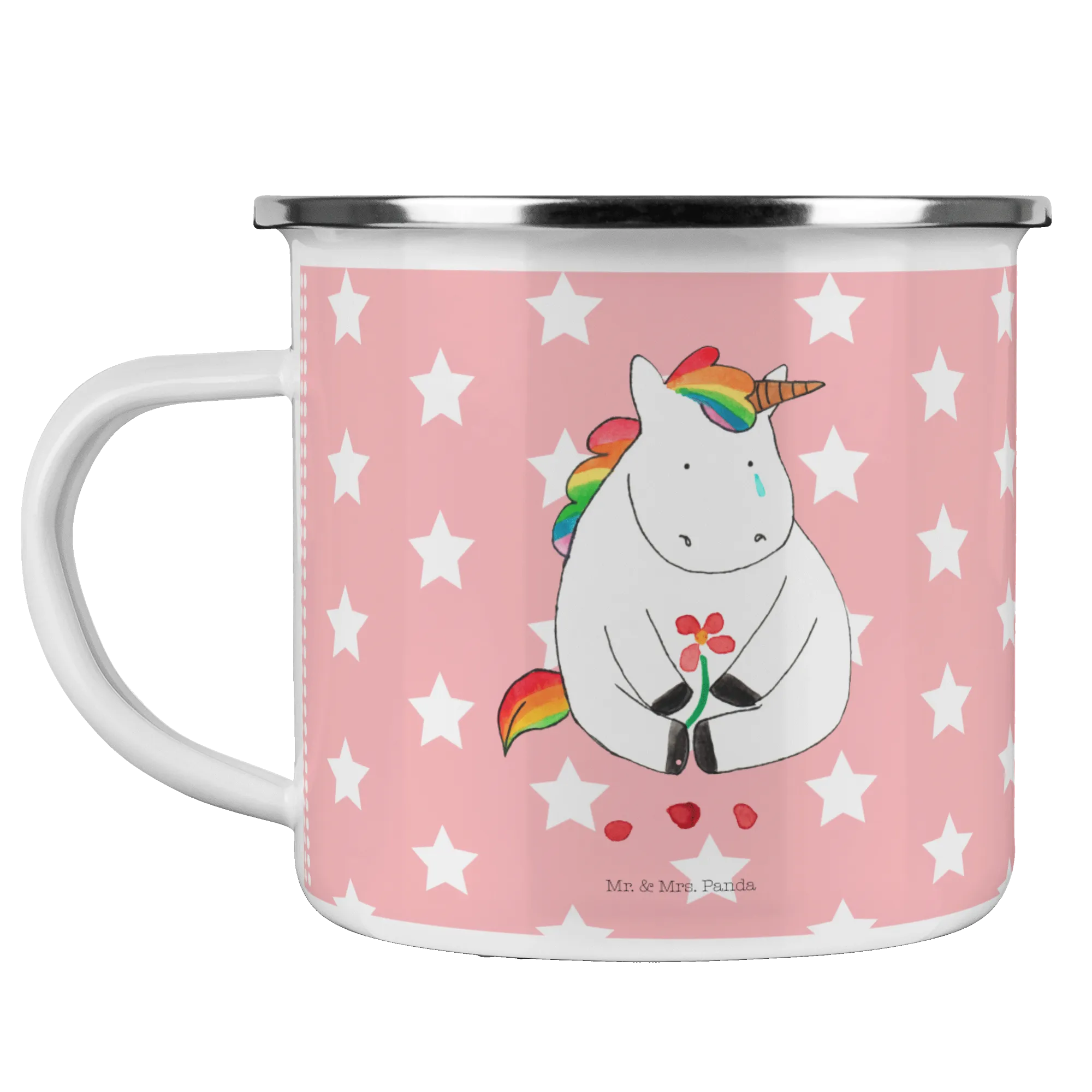 Die wunderschöne Camping Emaille Tasse mit dem niedlichen Motiv eines traurigen Einhorns von Mr. & Mrs. Panda ist das perfekte Geschenk für alle, die in der Natur unterwegs sind und die zauberhafte Welt der Einhörner lieben. Egal ob beim gemütlichen Campingausflug, auf einer Wanderung oder einfach beim Entspannen in der Natur – diese Tasse ist immer dabei und bringt ein Lächeln auf dein Gesicht!