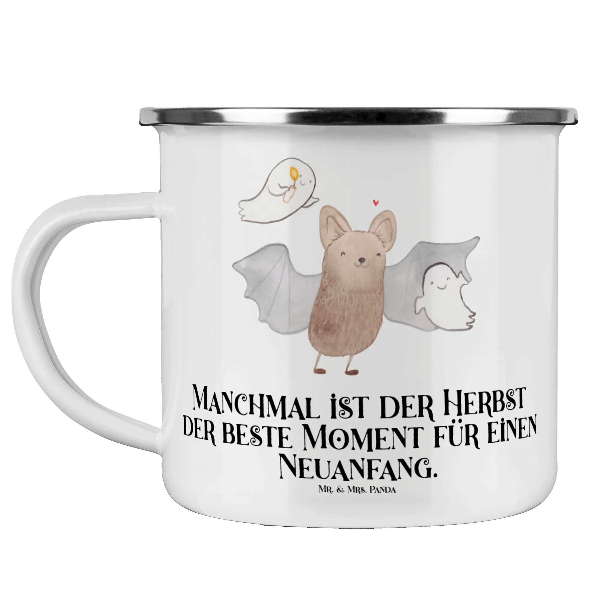 Entdecke die zauberhafte Camping Emaille Tasse «Fledermaus Gespenster» von Mr. & Mrs. Panda! Mit ihrem niedlichen Motiv, das eine fröhliche Fledermaus und zwei verspielte Gespenster zeigt, ist diese Tasse nicht nur ein praktisches Zubehör für dein nächstes Campingabenteuer, sondern auch ein echter Hingucker.