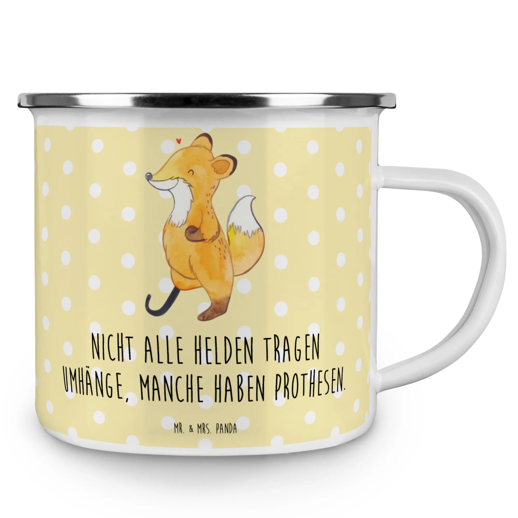 Die Camping Emaille Tasse "Fuchs Beinprothese" von Mr. & Mrs. Panda ist der perfekte Begleiter für alle, die gerne unterwegs sind und gleichzeitig eine Botschaft von Respekt und Inklusion verbreiten möchten. Mit ihrem charmanten Motiv eines Fuchses, der von einer Beinprothese begleitet wird, erinnert diese Tasse daran, dass nicht alle Helden Umhänge tragen – manche tragen Prothesen.