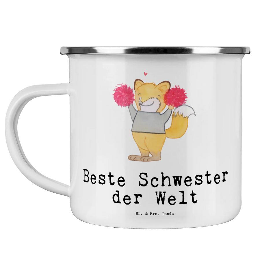 Die wunderschöne Camping Emaille Tasse mit dem Motiv "Fuchs Beste Schwester der Welt" von Mr. & Mrs. Panda ist das ideale Geschenk für deine Schwester oder deine beste Freundin. Egal ob zum Geburtstag, als Dankeschön oder als kleines Mitbringsel, diese Tasse wird mit Sicherheit ein Lächeln auf das Gesicht deines Lieblingsmenschen zaubern. Mit einem fröhlichen Fuchs, der wie eine Cheerleaderin aussieht und zwei Pompons schwingt, bringt die Tasse eine liebevolle Botschaft in dein Outdoor-Abenteuer.