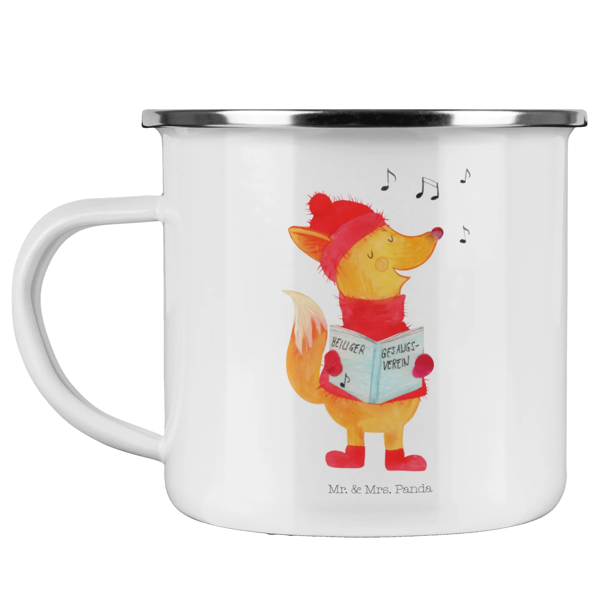 Die wunderschöne Camping Emaille Tasse "Fuchs Sänger" von Mr. & Mrs. Panda ist der perfekte Begleiter für all deine Abenteuer in der Natur! Ob beim gemütlichen Campingausflug, beim Wandern oder einfach beim Entspannen zu Hause – diese Tasse bringt die Magie der Weihnachtszeit direkt zu dir. Bedruckt mit einem fröhlichen Fuchs, der singend in sein Liederbuch schaut und dabei eine warme Mütze und ein passendes Schal trägt, ist sie ein wahrer Blickfang. Der Fuchs umgeben von musikalischen Noten sorgt für eine fröhliche, festliche Stimmung und erinnert uns an die schönen Weihnachtslieder, die uns in der kalten Jahreszeit begleiten.