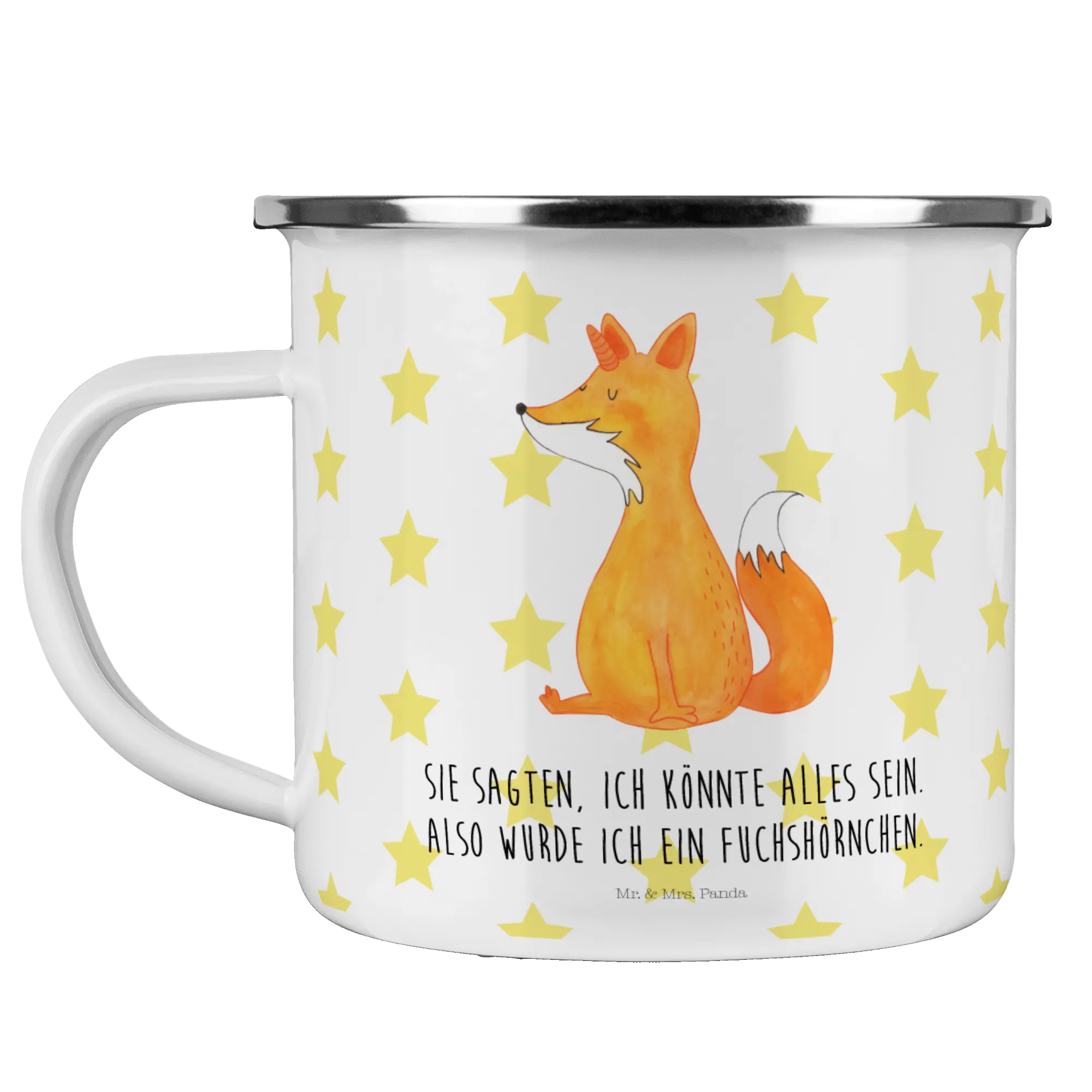Du suchst nach dem perfekten Geschenk für einen Campingliebhaber oder jemanden, der die zauberhafte Welt der Einhörner und Füchse liebt? Dann ist die Camping Emaille Tasse Fuchshörnchen Wunsch aus der speziellen Einhorn-Kollektion von Mr. & Mrs. Panda genau das Richtige!