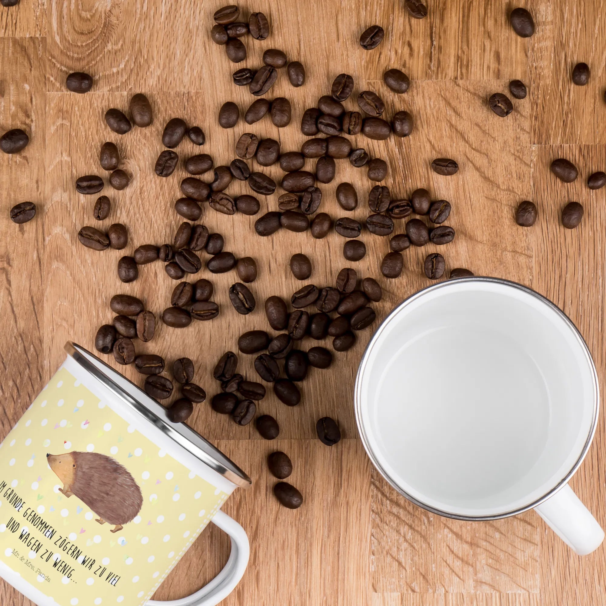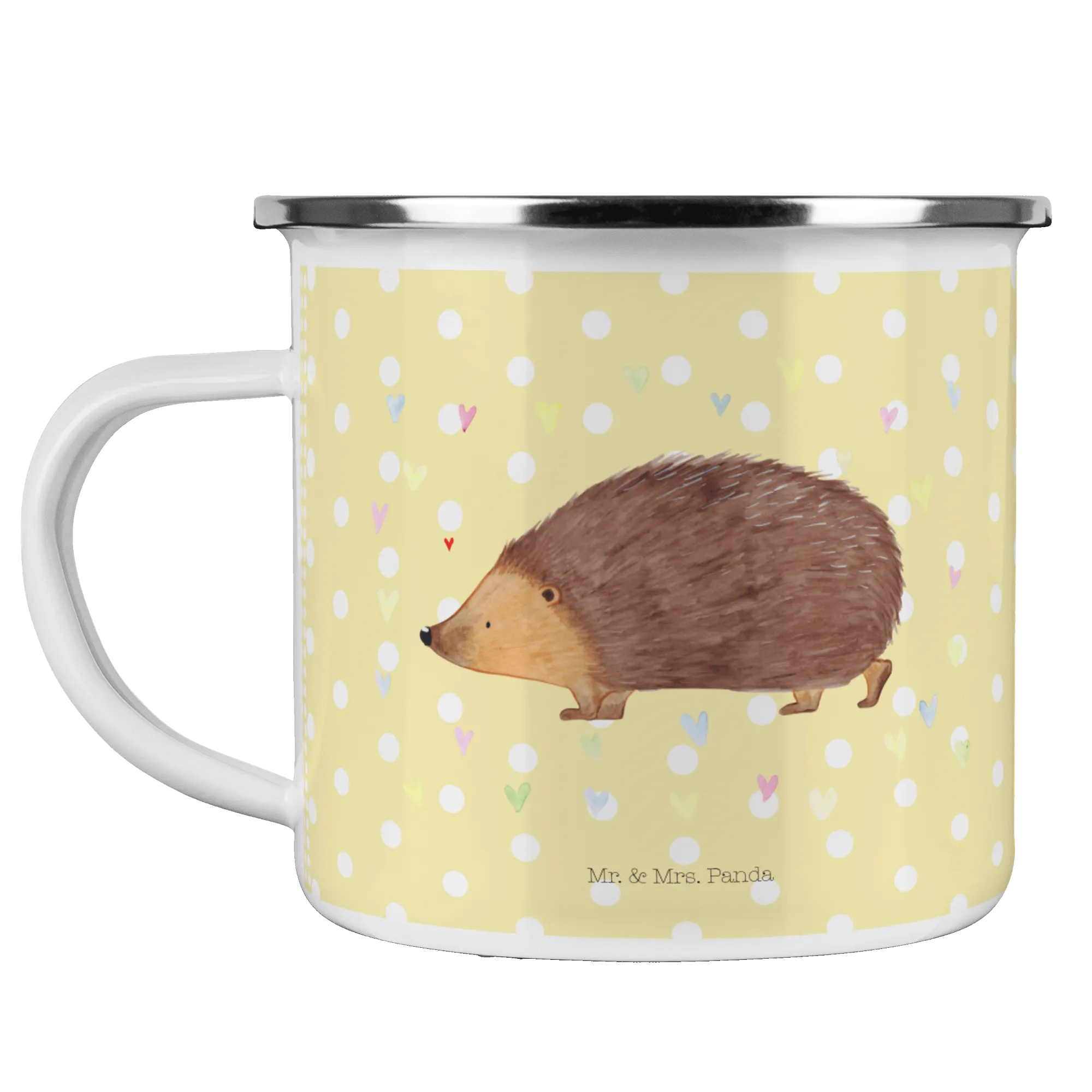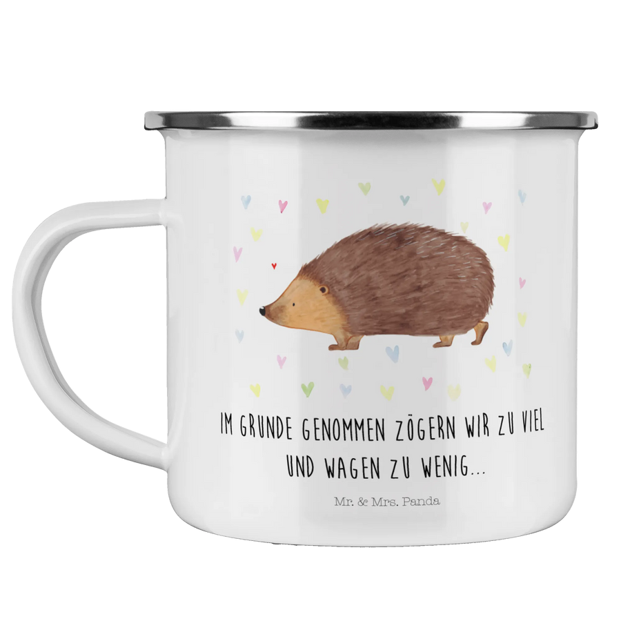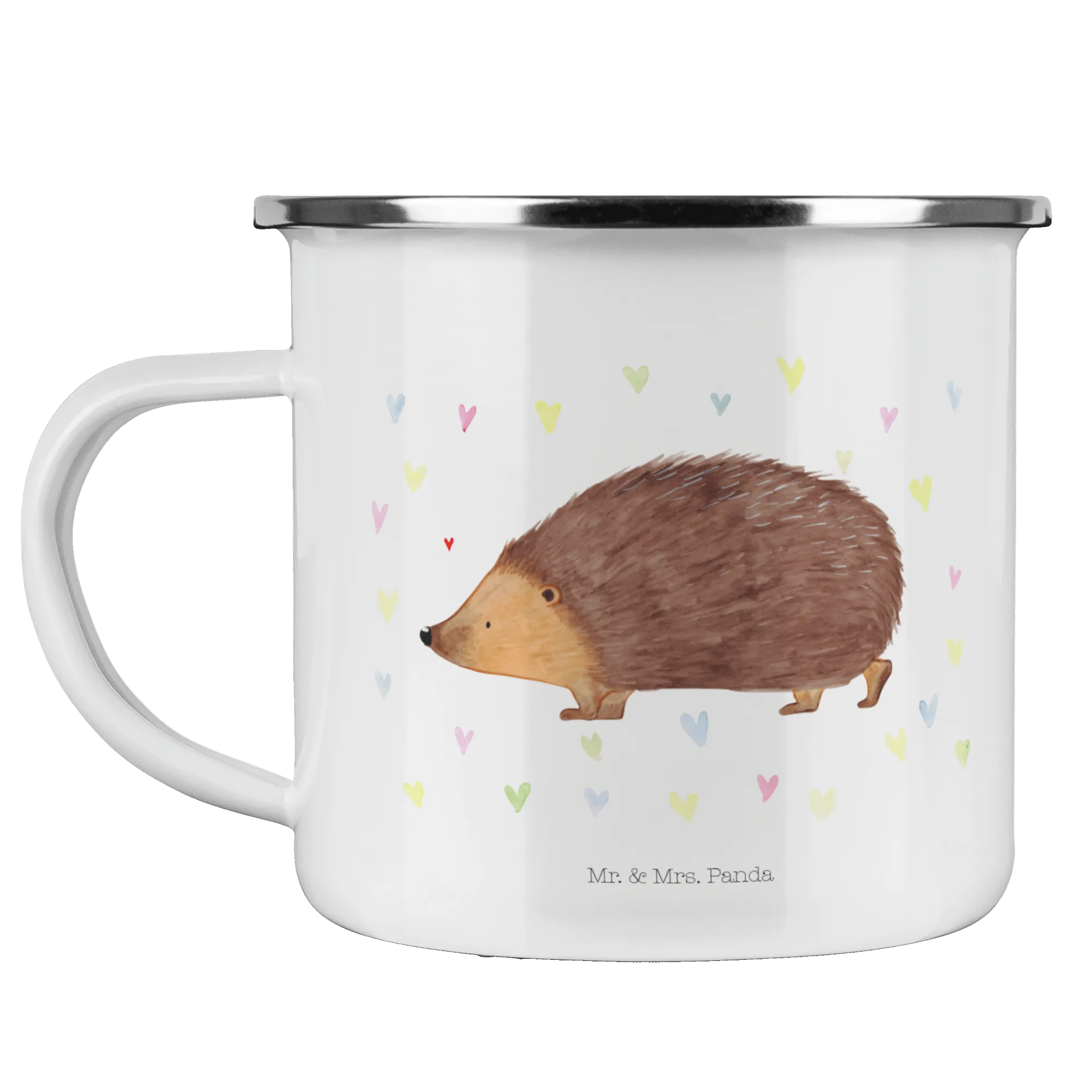 Die Camping Emaille Tasse "Igel Herzen" von Mr. & Mrs. Panda ist ein bezauberndes Geschenk für all jene, die das Abenteuer in der Natur lieben.