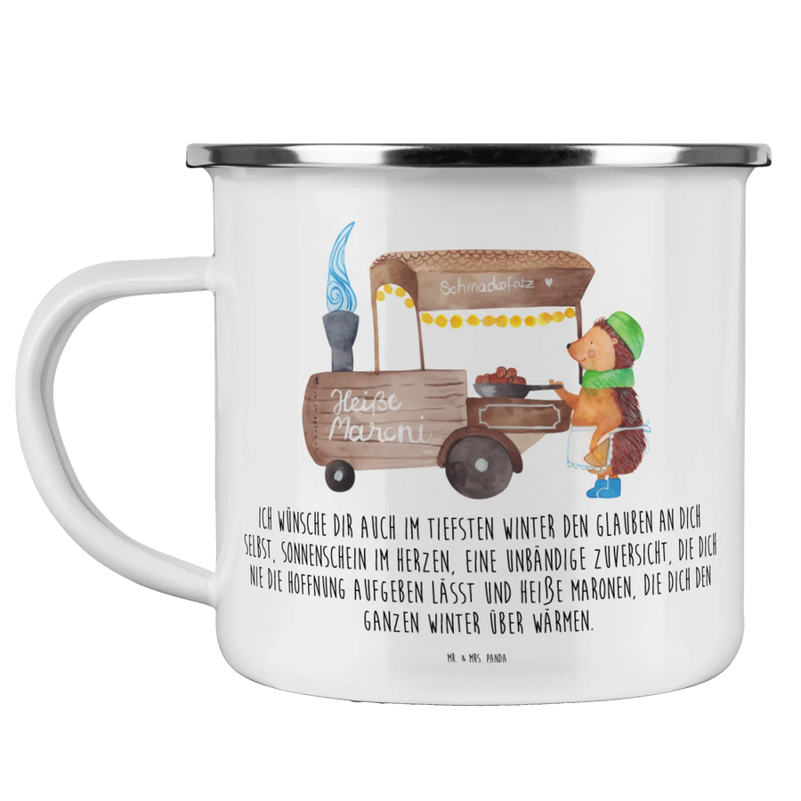 Entdecke die bezaubernde Camping Emaille Tasse "Igel Maronen" aus der Winter Kollektion von Mr. & Mrs. Panda!