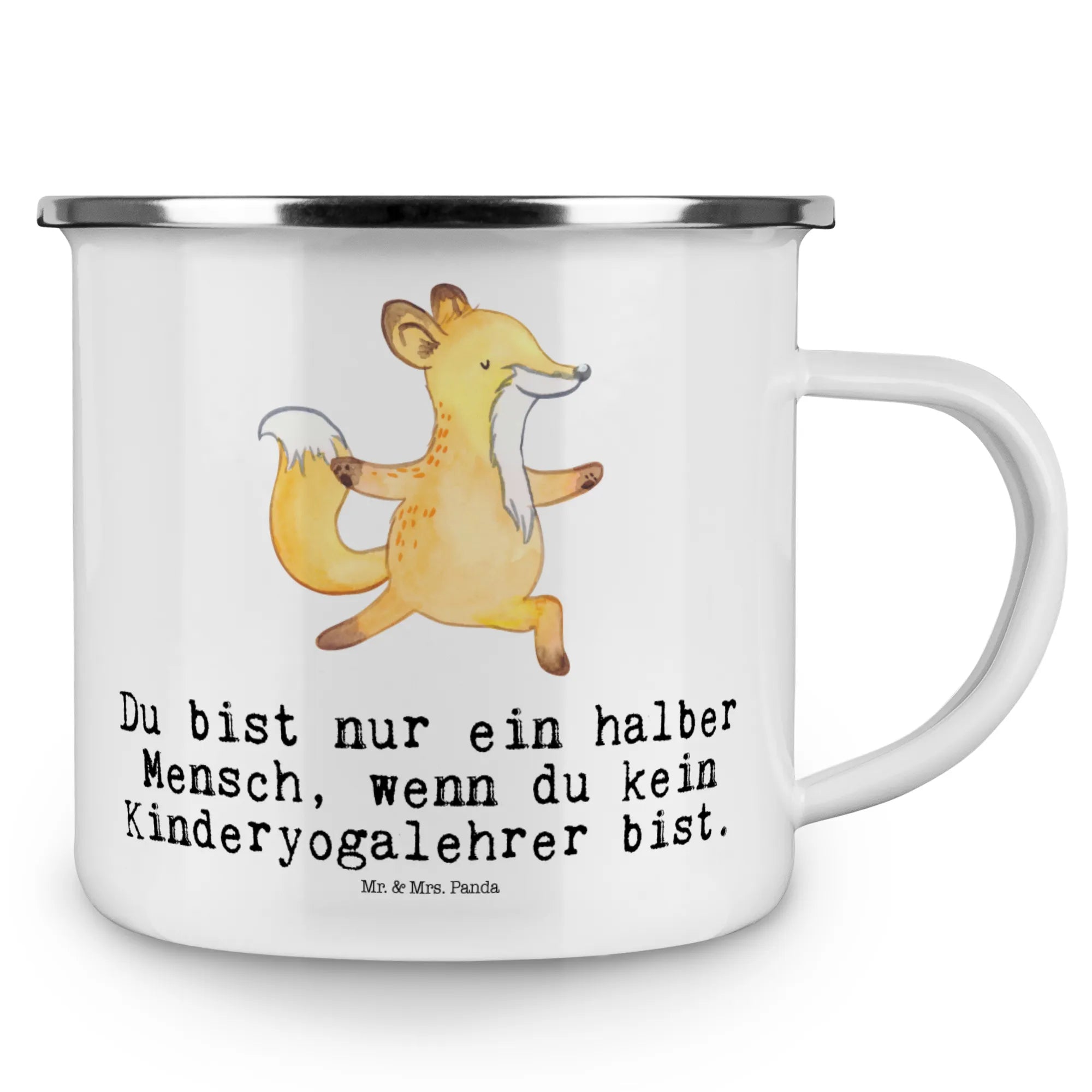 Die Camping Emaille Tasse "Kinderyogalehrer mit Herz" von Mr. & Mrs. Panda ist das perfekte Geschenk für alle, die mit Begeisterung und Hingabe etwas für die nächste Generation tun! Diese tierisch süße Tasse aus kratzfester Emaille kombiniert nicht nur den Charme des handgezeichneten Fuchs-Motivs, sondern auch einen witzigen Slogan: "Du bist nur ein halber Mensch, wenn du kein Kinderyogalehrer bist!"