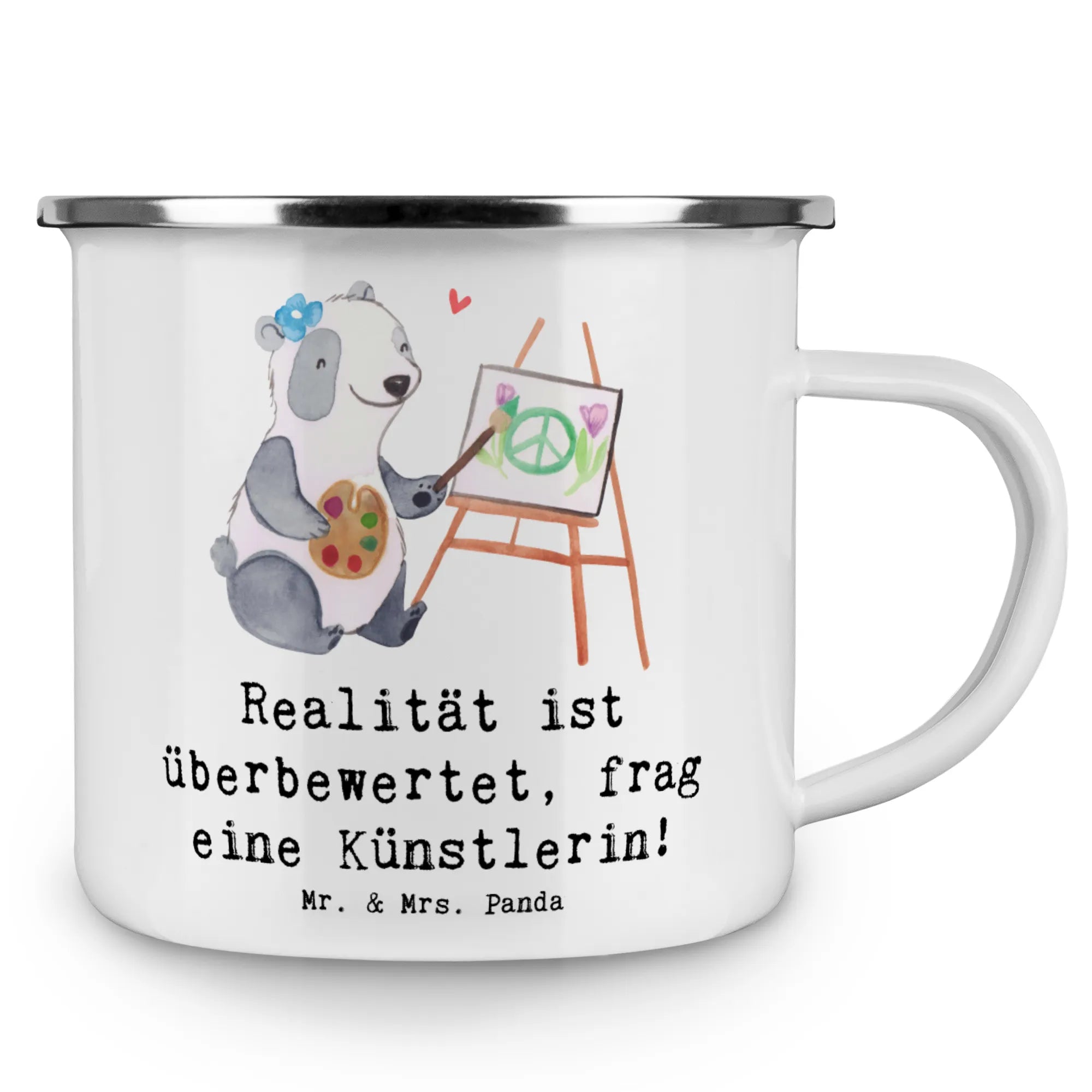 Die Camping Emaille Tasse von Mr. & Mrs. Panda ist der ideale Begleiter für alle kreativen Köpfe und Kunstliebhaber. Ob beim Camping, auf Wanderungen oder einfach im Garten – mit dieser Tasse genießt Du Deine Getränke in stylischem Ambiente. Diese enge Verbindung zur Kunst macht jede Tasse zu einem besonderen Erlebnis, besonders mit dem liebevoll gestalteten Motiv "Künstlerin", das Dich dazu inspiriert, Deine Kreativität auszuleben. Die Tasse trägt den Slogan "Realität ist überbewertet, frag eine Künstlerin!" und bringt eine Portion Witz und Charme in jede Auszeit.