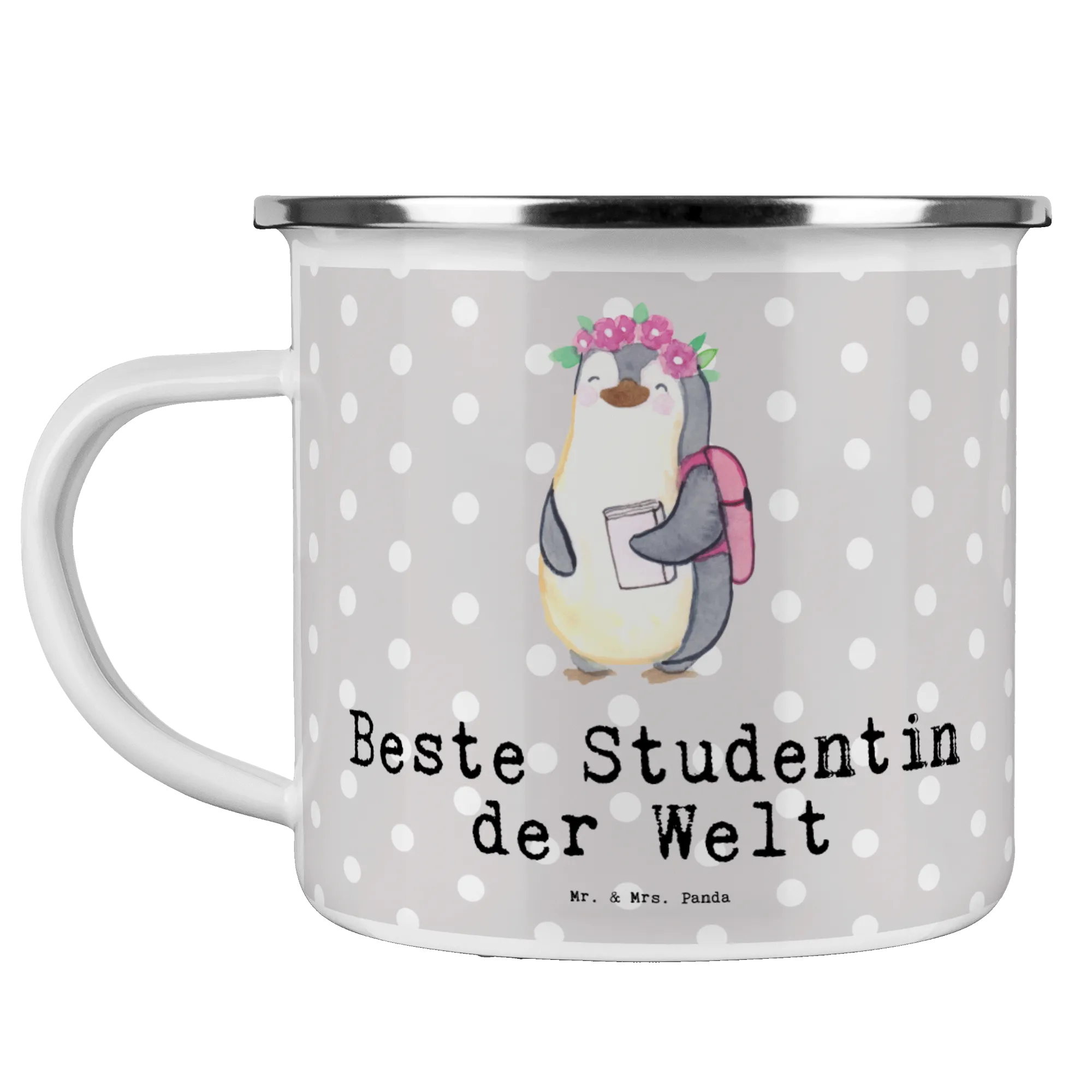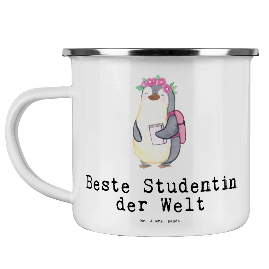 Die Camping Emaille Tasse mit dem süßen Motiv "Pinguin Beste Studentin der Welt" von Mr. & Mrs. Panda ist das perfekte Geschenk für alle Studentinnen, die ihren Abschluss ehren wollen. Sie ist nicht nur optisch ein Highlight, sondern auch äußerst praktisch.