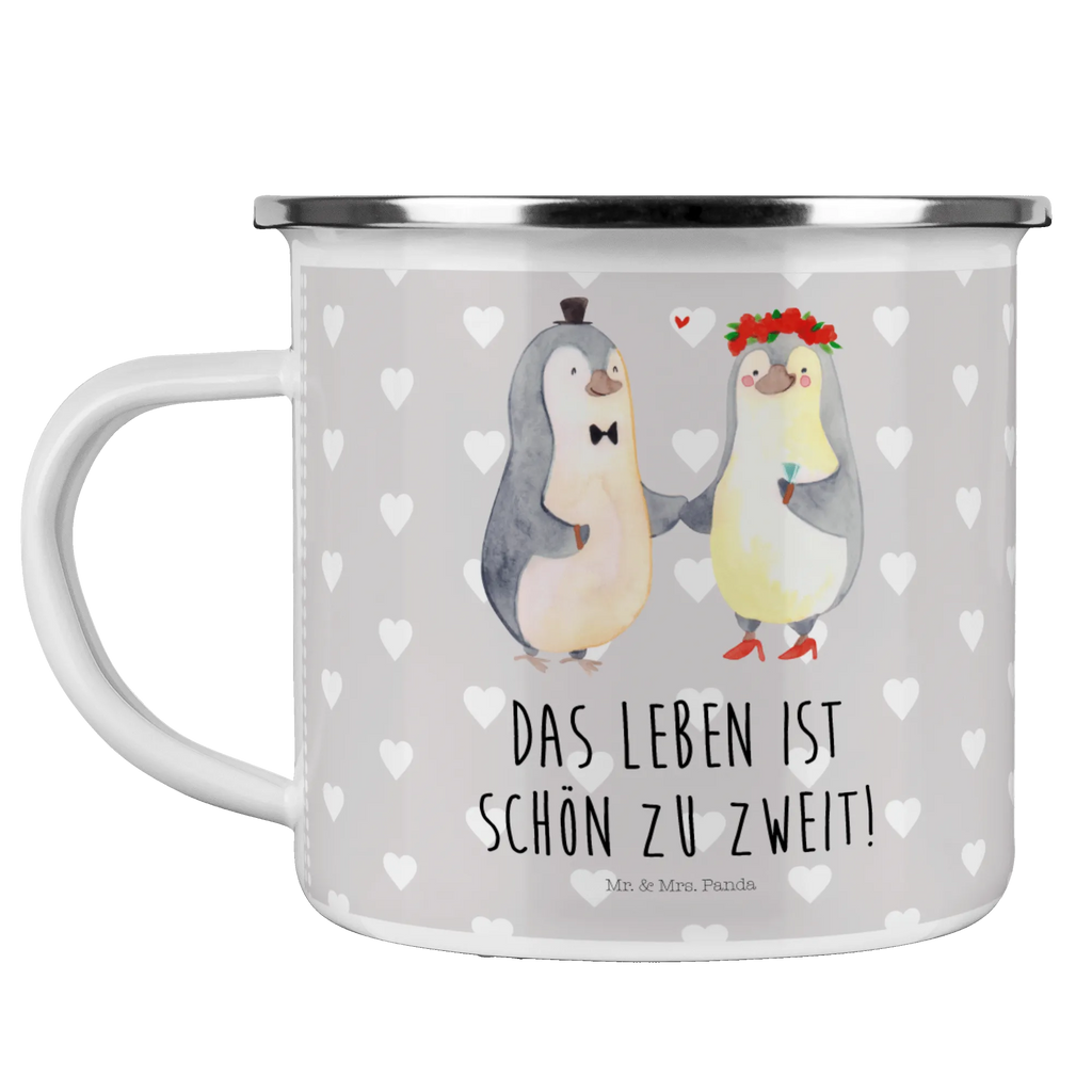 Die Camping Emaille Tasse mit dem zauberhaften Motiv "Pinguin Heirat" aus der Kollektion Liebe von Mr. & Mrs. Panda ist das perfekte Geschenk für Verliebte und Abenteuerlustige. Egal, ob Du sie selbst behalten oder einem besonderen Menschen schenken möchtest – diese Tasse verbindet Funktionalität mit einem liebevollen Design.