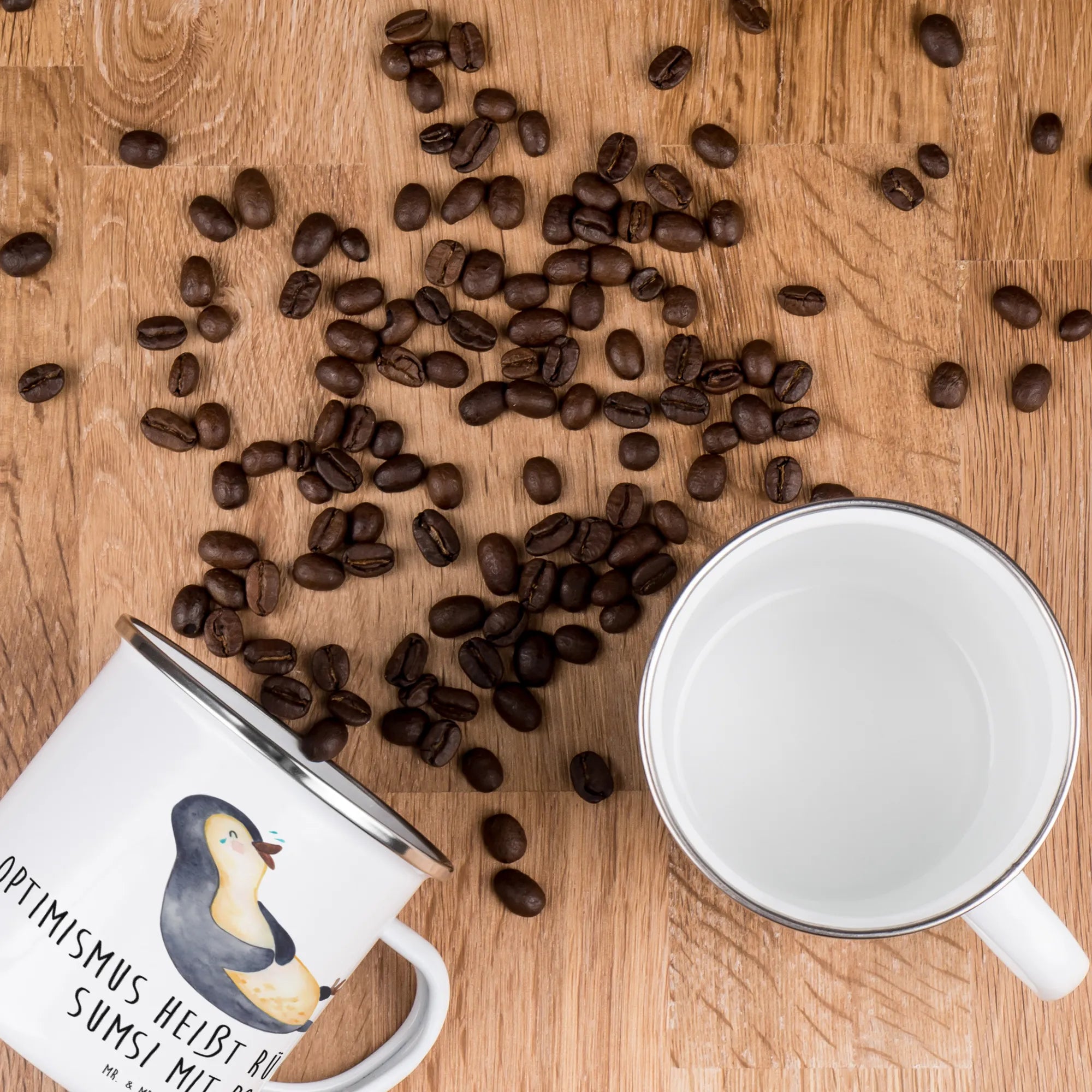 Lass dich von dem fröhlichen Pinguin anstecken und genieße dein Lebensmotto: 'Optimismus heißt rückwärts Sumsi mit Po.' Ob als Geschenk für Freunde und Familie oder als Belohnung für dich selbst – diese Camping Emaille Tasse wird garantiert ein Hit sein!