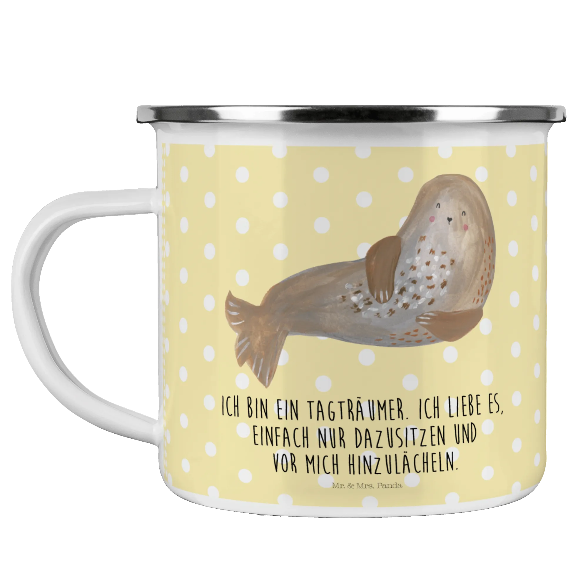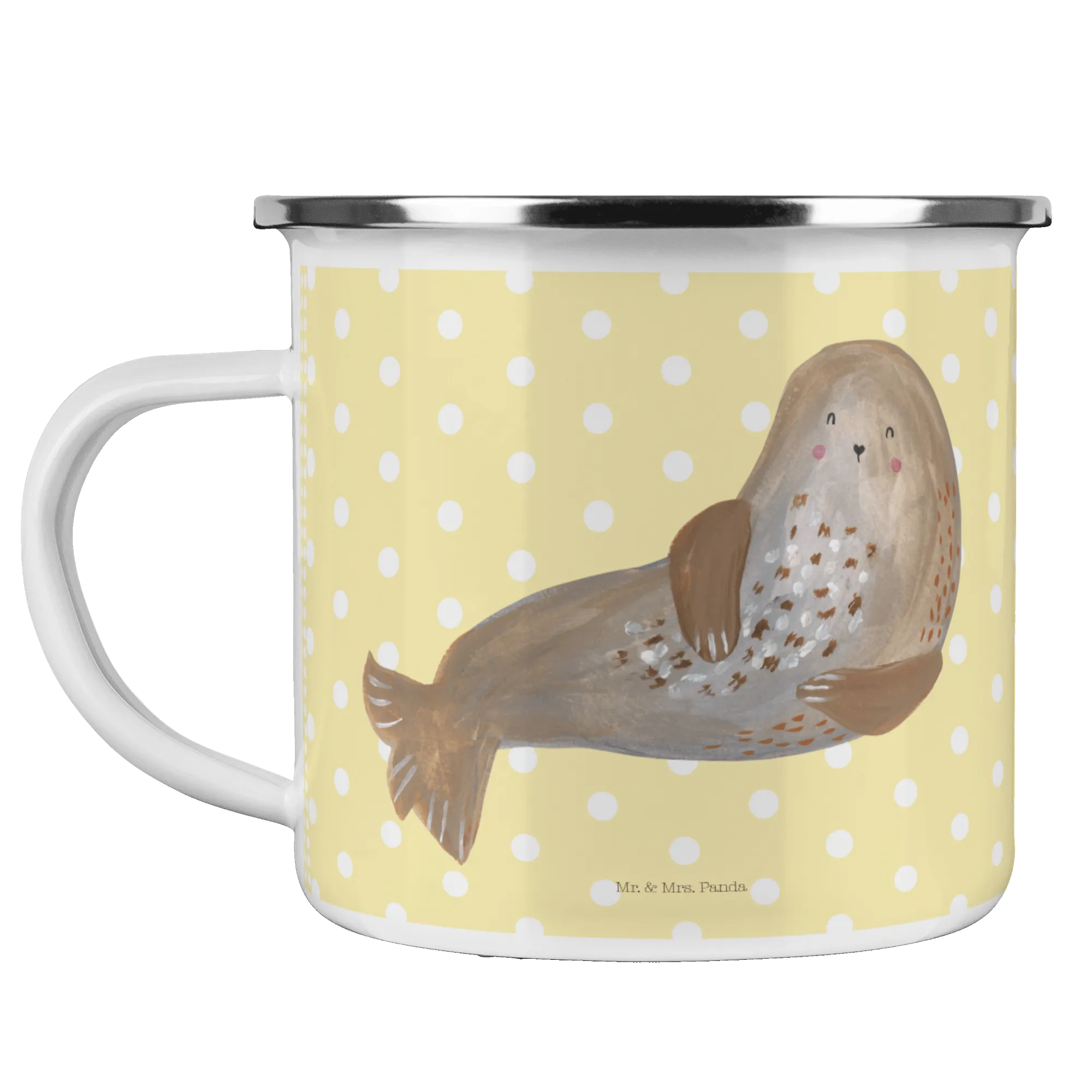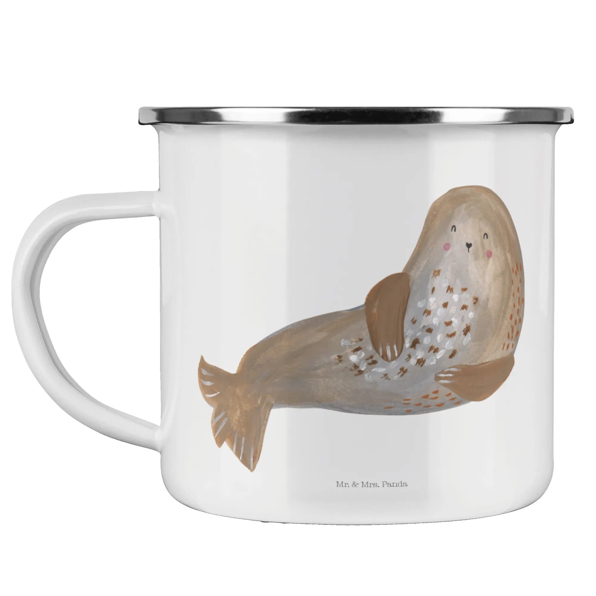 Entdecke die bezaubernde Camping Emaille Tasse mit dem lustigen Motiv der lachenden Robbe aus der Small World Kollektion von Mr. & Mrs. Panda!