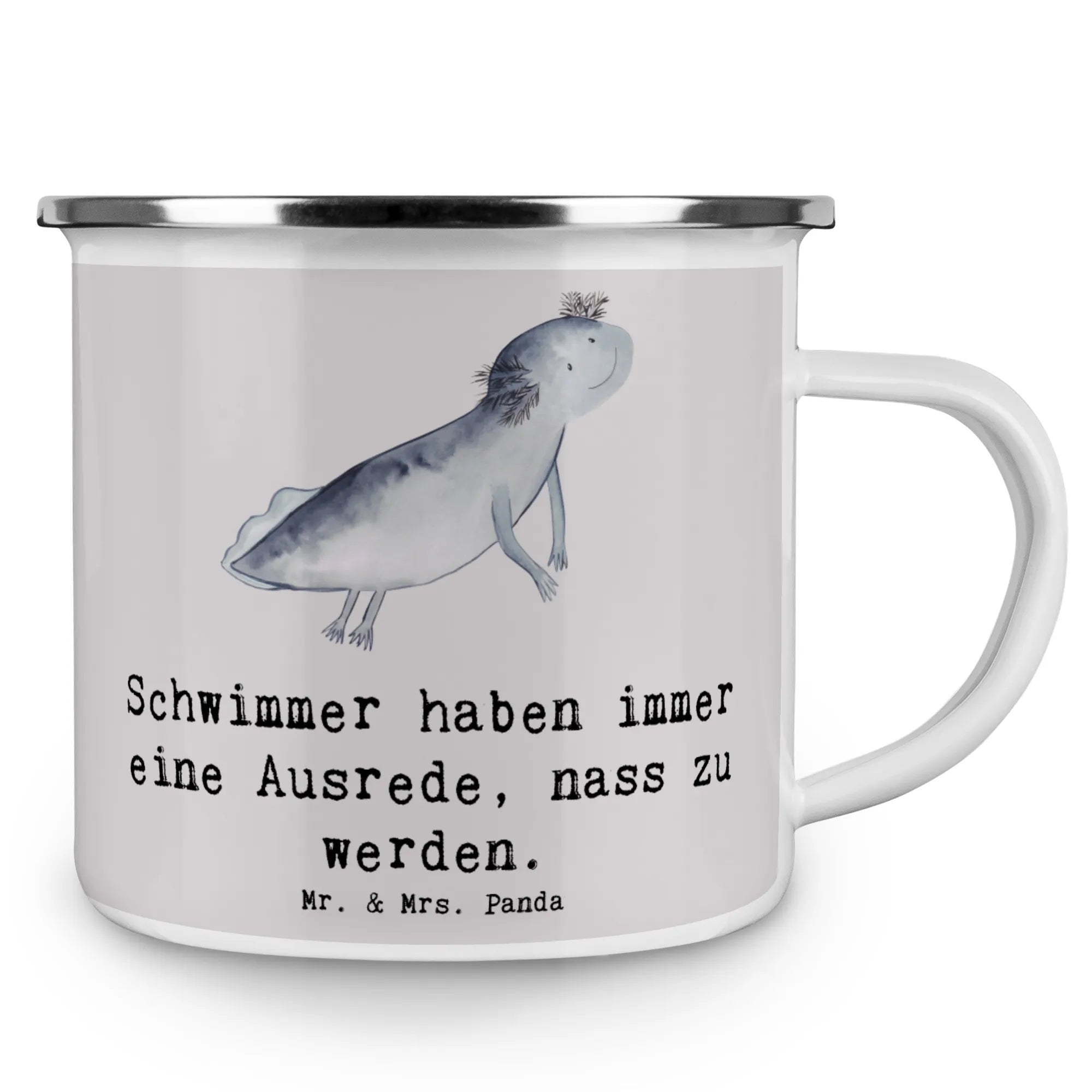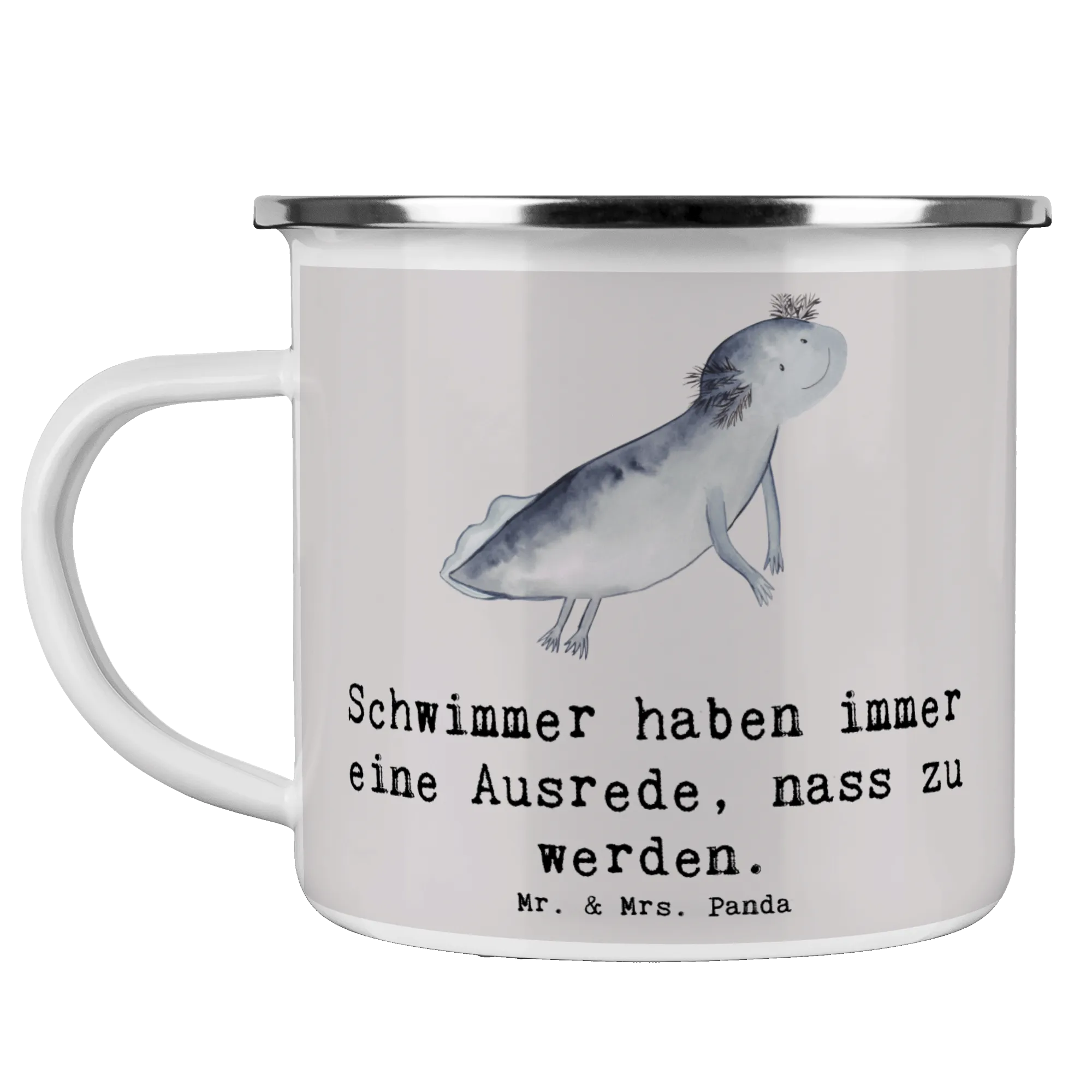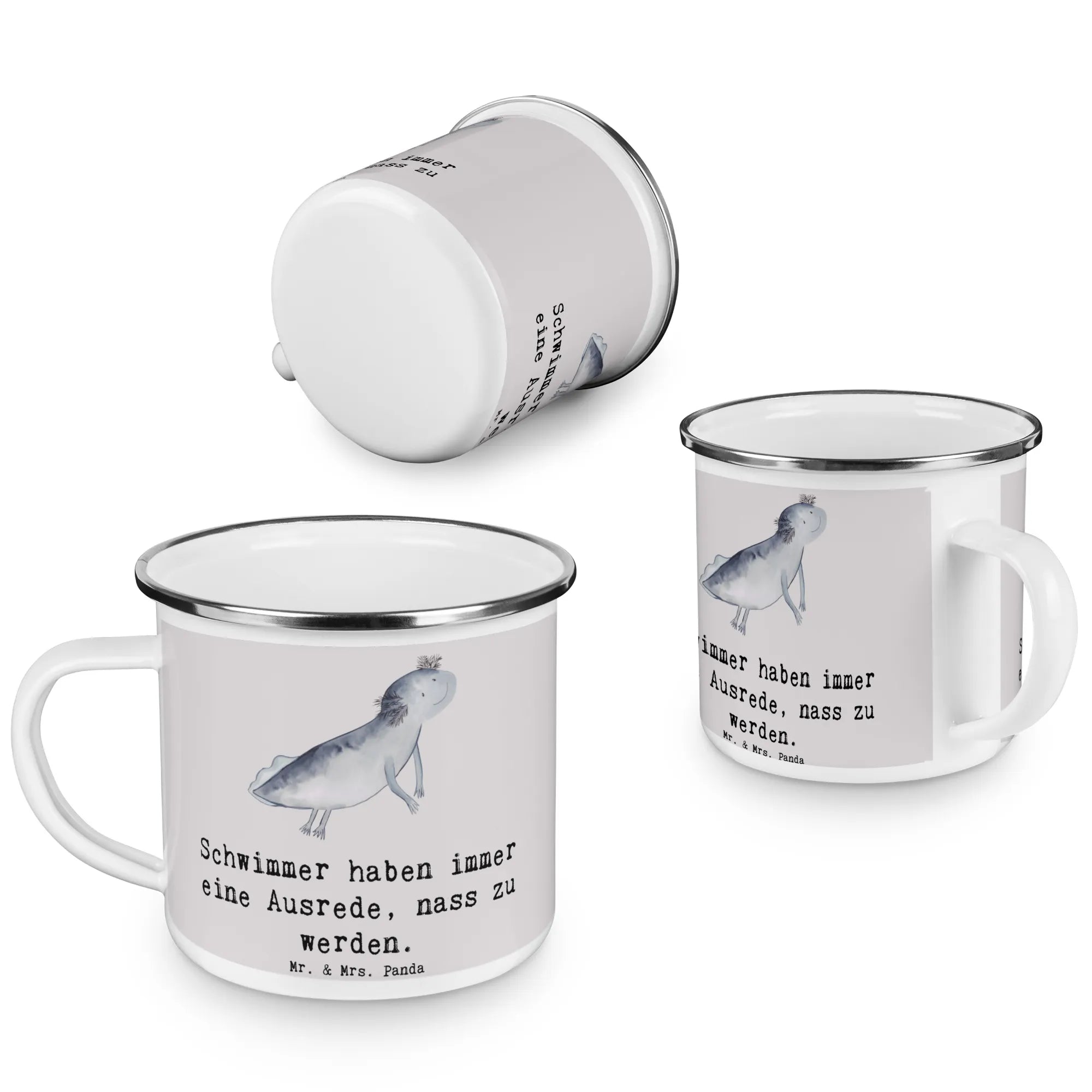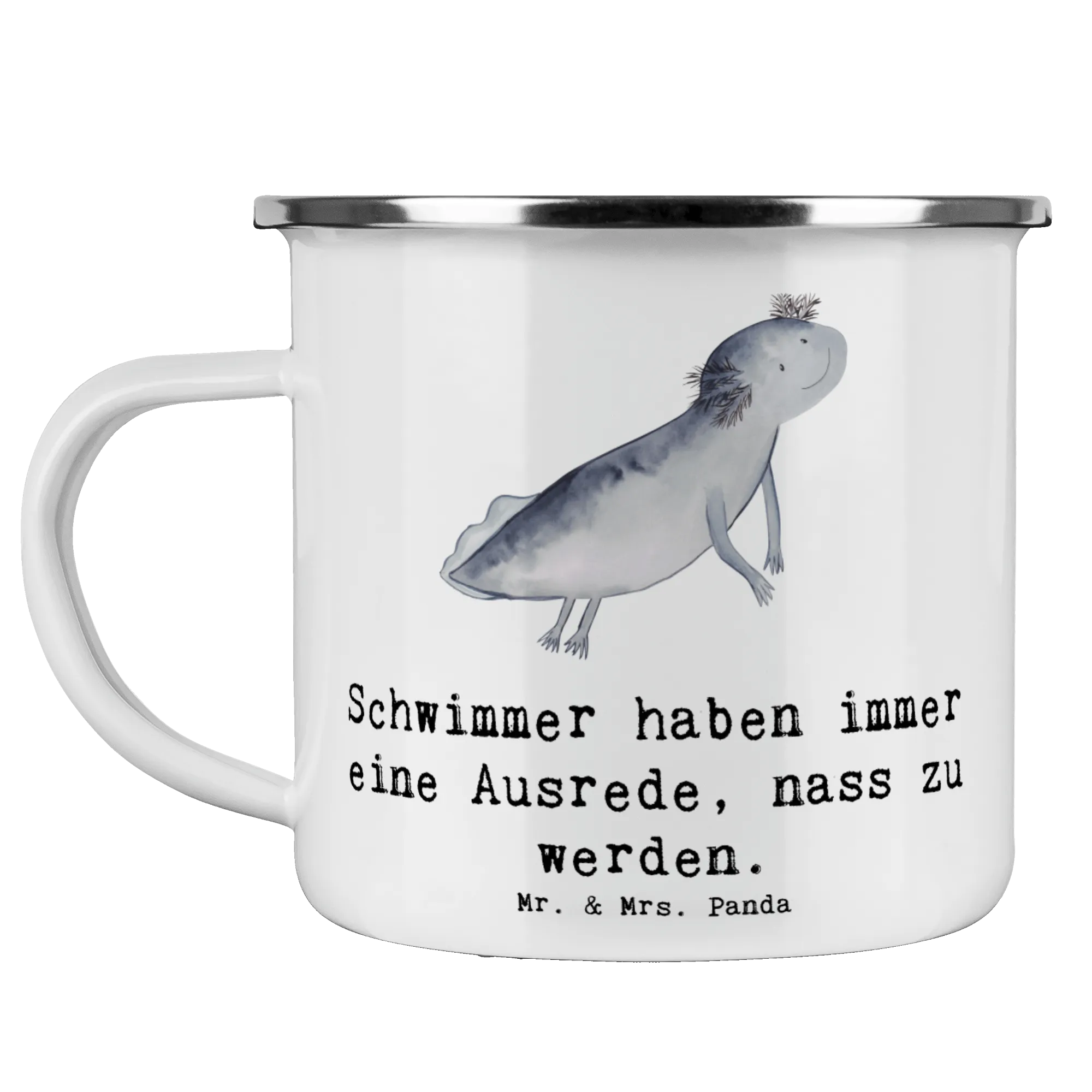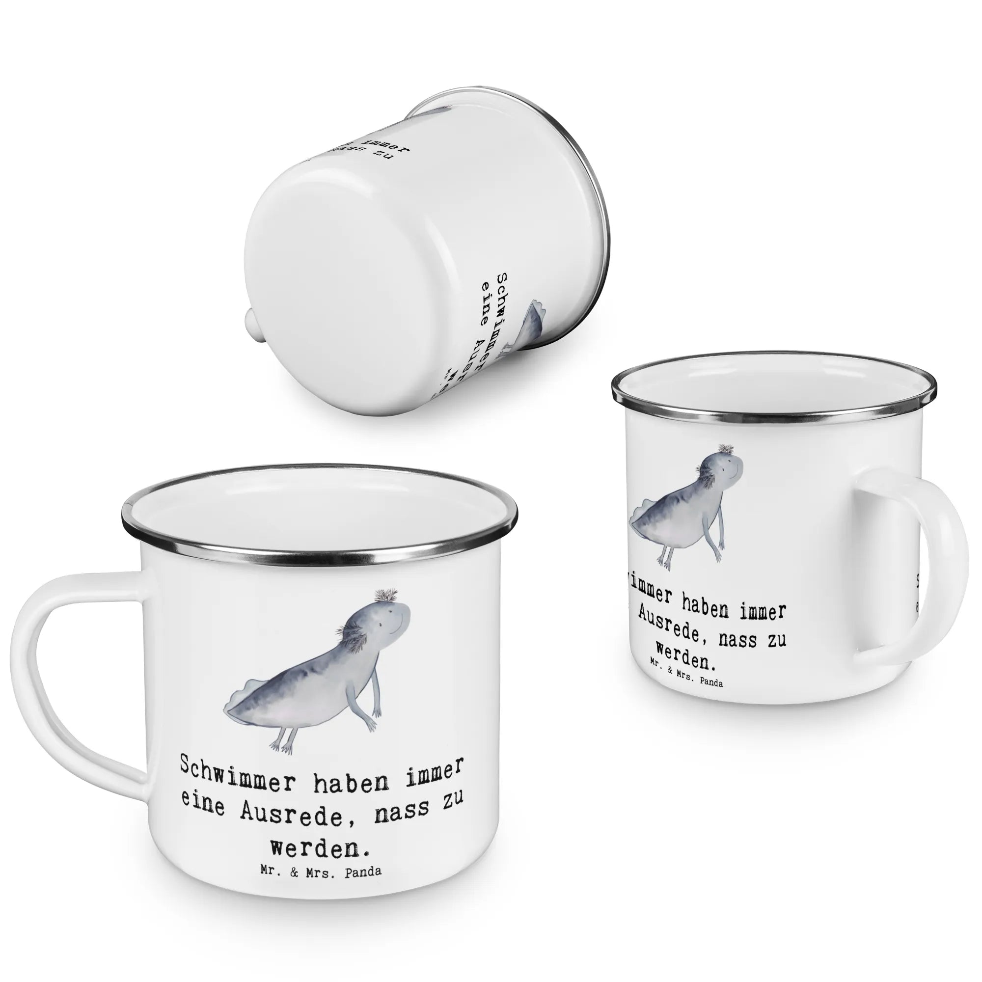 Die Camping Emaille Tasse von Mr. & Mrs. Panda mit dem süßen Motiv "Schwimmen" ist das perfekte Geschenk für Sportbegeisterte und Outdoor-Liebhaber. Mit dem fröhlichen Spruch "Schwimmer haben immer eine Ausrede, nass zu werden" bringt diese Tasse nicht nur Freude, sondern auch eine gute Portion Humor in deinen nächsten Campingausflug oder nach einem anstrengenden Training.