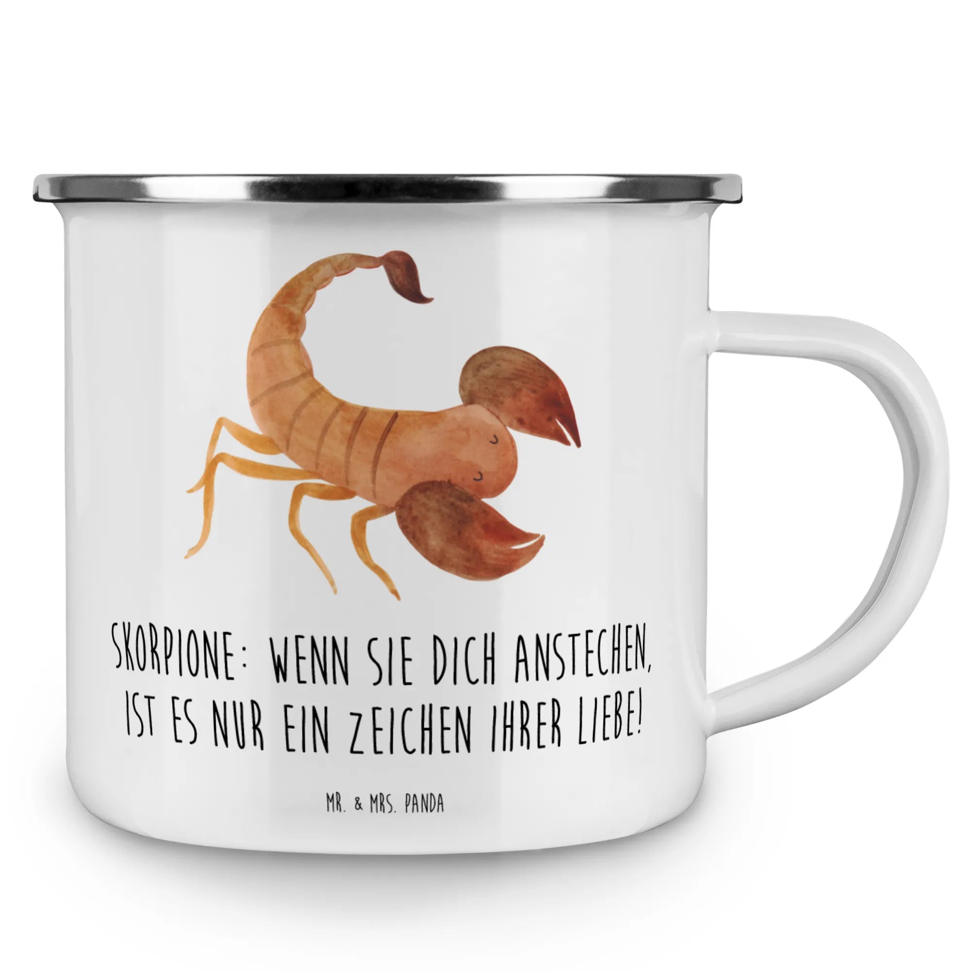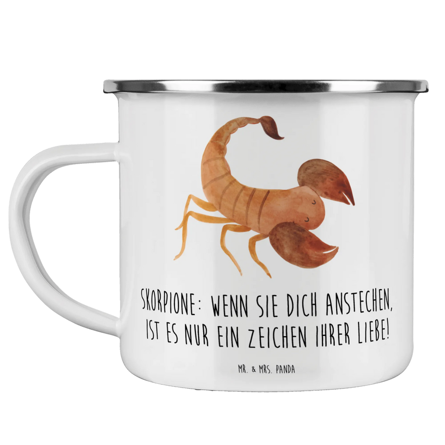 Die Camping Emaille Tasse mit dem Skorpion-Motiv aus der liebevollen Sternzeichen-Kollektion von Mr. & Mrs. Panda ist das perfekte Geschenk für alle Astrologie-Liebhaber und Outdoor-Enthusiasten. Diese schöne und beständige Tasse vereint Funktionalität und Stil und ist ideal für Campingausflüge, Wanderungen oder einfach für den gemütlichen Kaffee am Morgen.