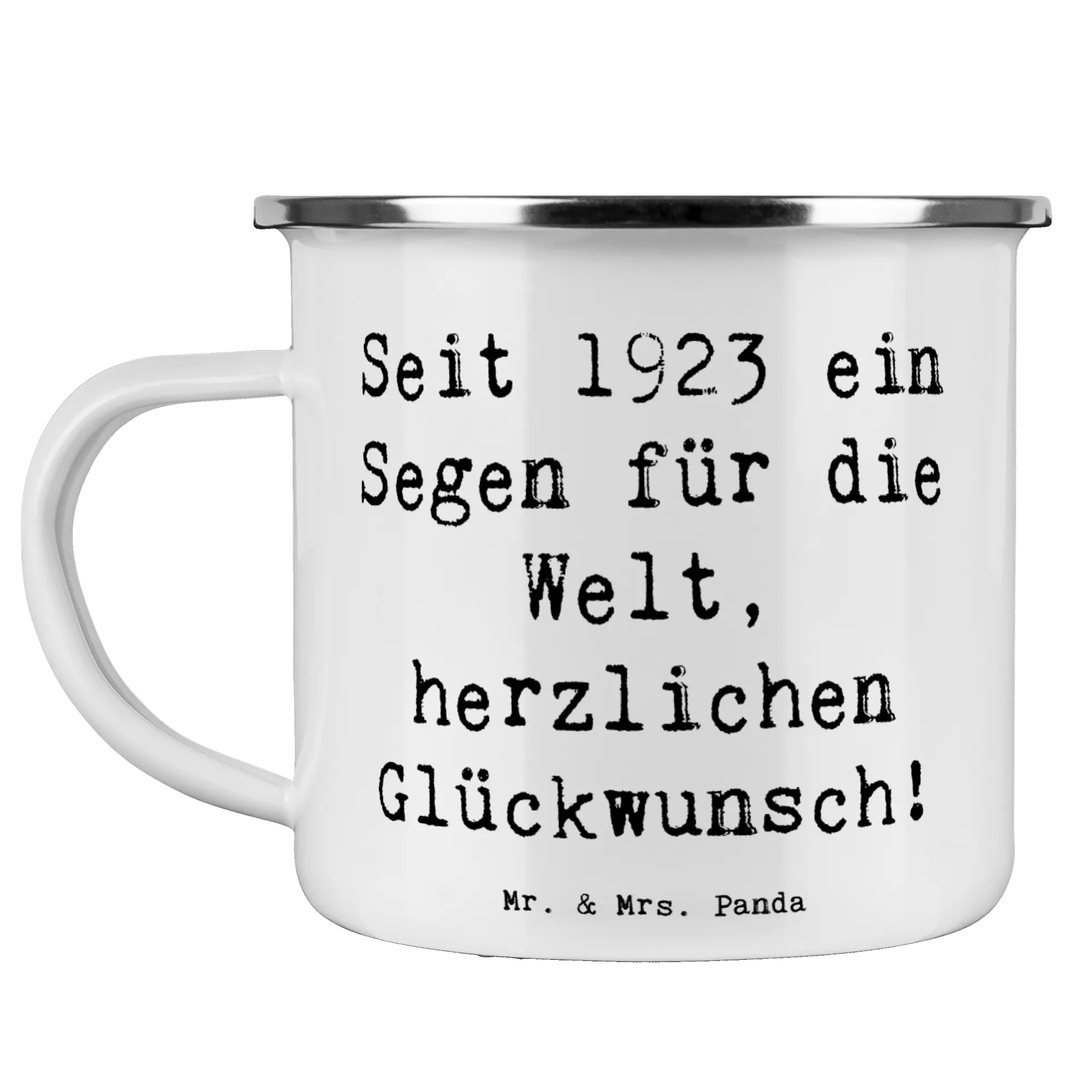 Die Camping Emaille Tasse von Mr. & Mrs. Panda ist nicht nur ein praktisches Utensil für deine nächsten Ausflüge in die Natur, sondern auch ein liebevolles Geschenk für besondere Anlässe. Mit dem charmanten Motiv „Geboren 1923“ und dem Slogan „Seit 1923 ein Segen für die Welt, herzlichen Glückwunsch!“ zauberst du jedem Beschenkten ein Lächeln ins Gesicht.