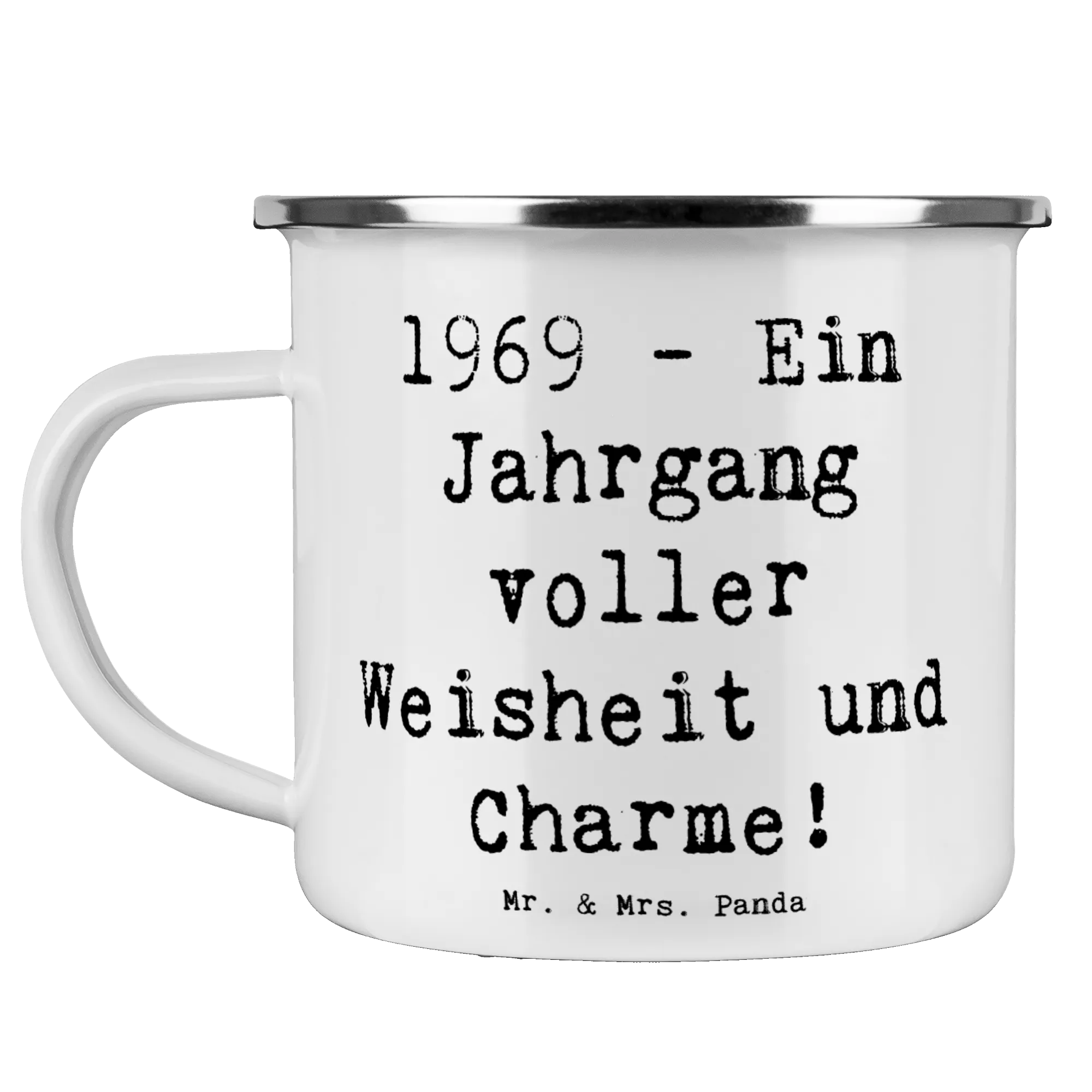 Die Camping Emaille Tasse mit dem Motiv "1969 - Ein Jahrgang voller Weisheit und Charme!" von Mr. & Mrs. Panda ist das perfekte Geschenk für alle, die im Jahr 1969 geboren wurden. Egal ob zum Geburtstag, Jubiläum oder einfach nur, um jemandem eine Freude zu machen – diese Tasse wird garantiert ein Lächeln auf die Gesichter zaubern!