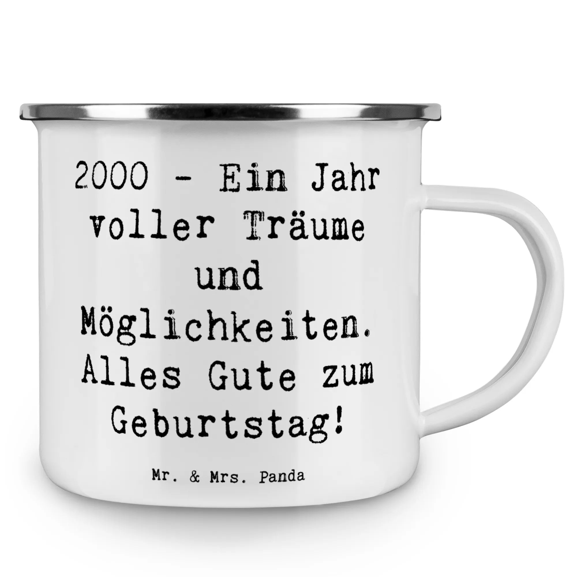 Wenn du auf der Suche nach dem perfekten Geschenk zum Geburtstag bist, dann ist die Camping Emaille Tasse mit dem Motiv "2000 - Ein Jahr voller Träume und Möglichkeiten. Alles Gute zum Geburtstag!" von Mr. & Mrs. Panda genau das Richtige für dich! Diese wunderschöne und beständige Metalltasse ist nicht nur ein echter Hingucker, sondern auch super praktisch für all eure Outdoor-Abenteuer. Egal, ob beim Camping, beim Wandern oder einfach beim Picknick im Park – mit dieser Emaille Tasse hast du immer deinen persönlichen Begleiter dabei, der deine Getränke stilvoll hält.