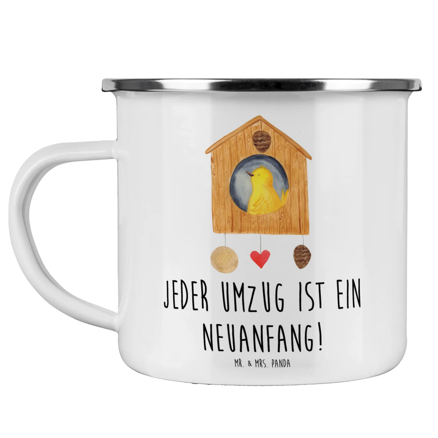Mr. & Mrs. Panda Camping Emaille Tasse – Mutmacher Motiv „Umzug in eine neue Stadt“