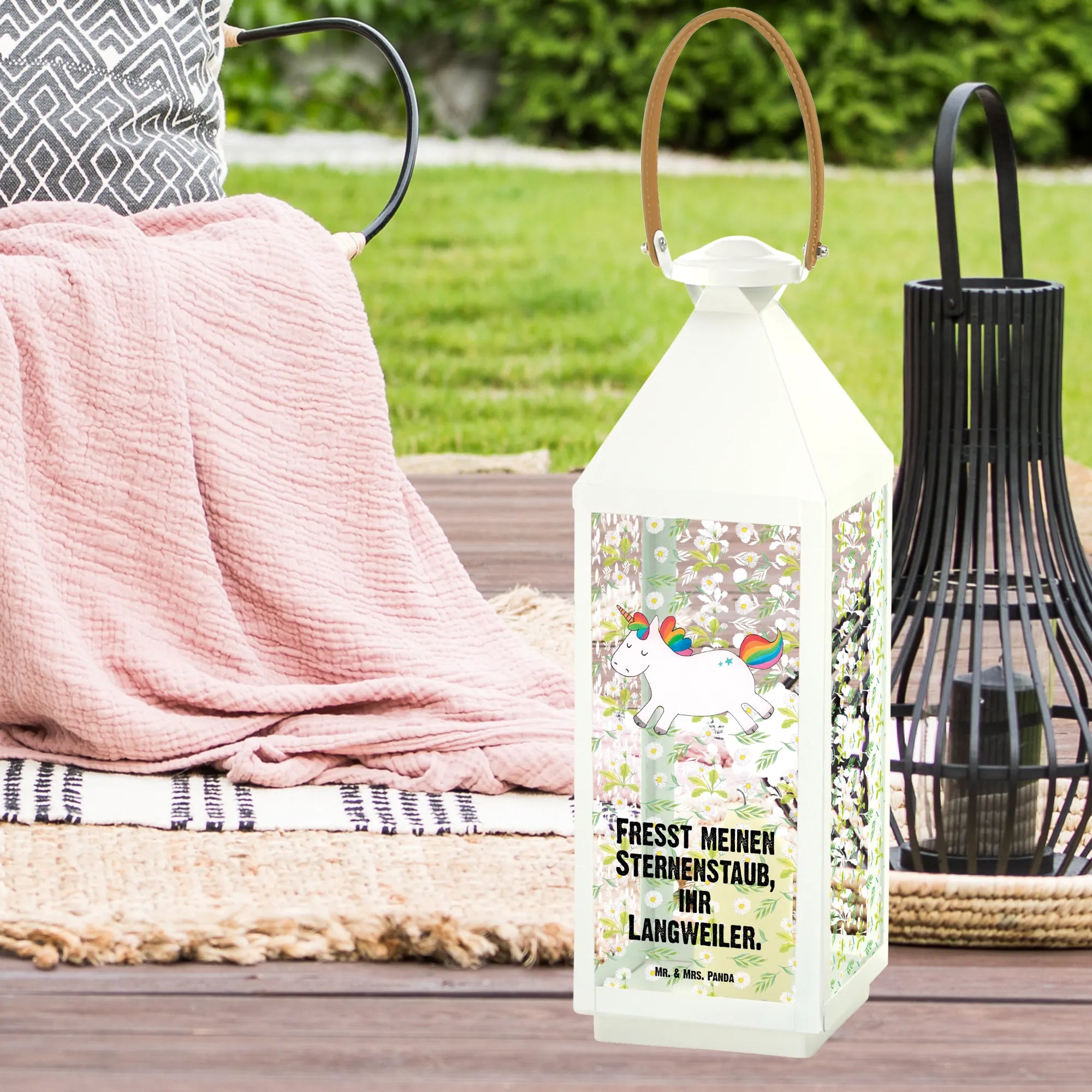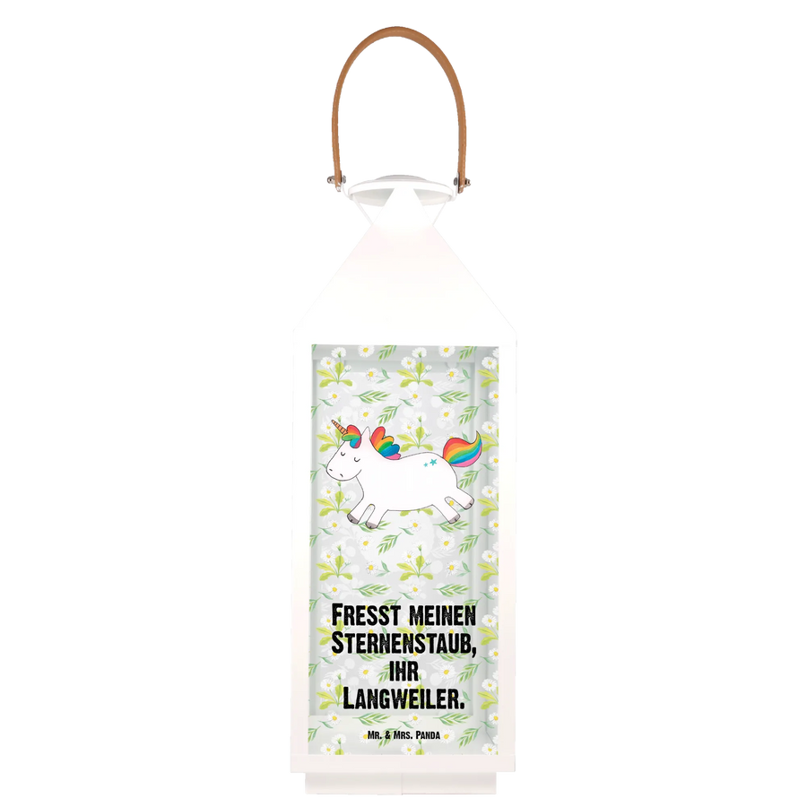 Mit ihrem bezaubernden Einhorn-Motiv und dem witzigen Spruch 'Fresst meinen Sternenstaub, ihr Langweiler.' zaubert sie jedem ein Lächeln ins Gesicht. Die Laterne aus hochwertigem, langlebigem Metall und Glas ist in XL-Größe erhältlich und sorgt für ein gemütliches Ambiente sowohl im Innen- als auch im Außenbereich.