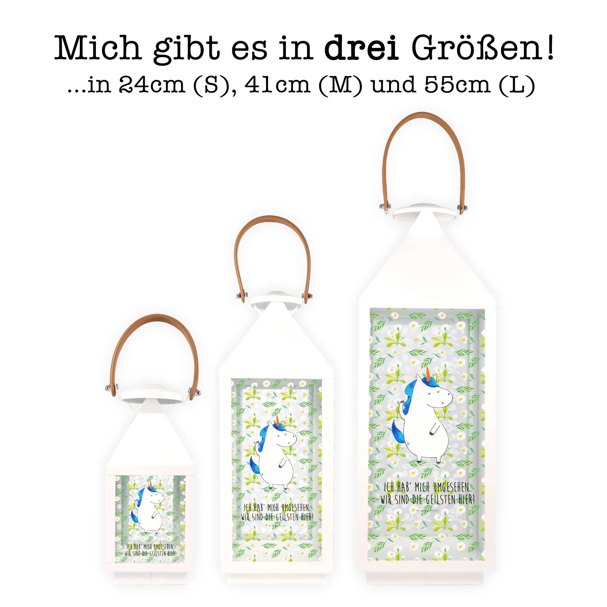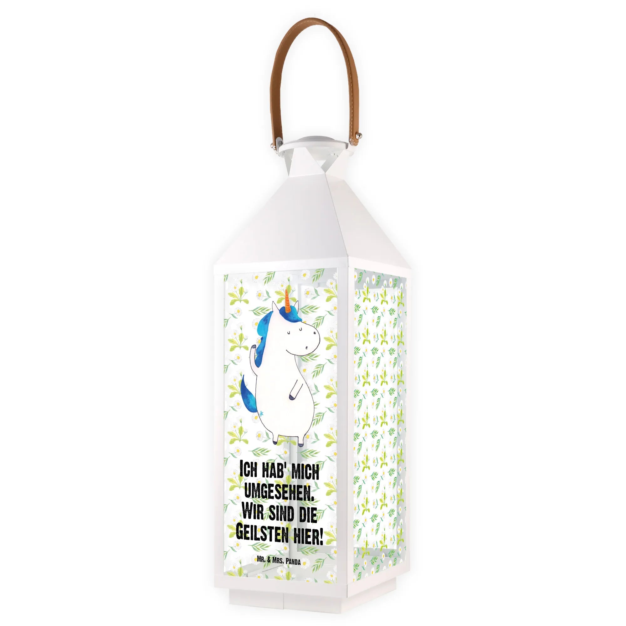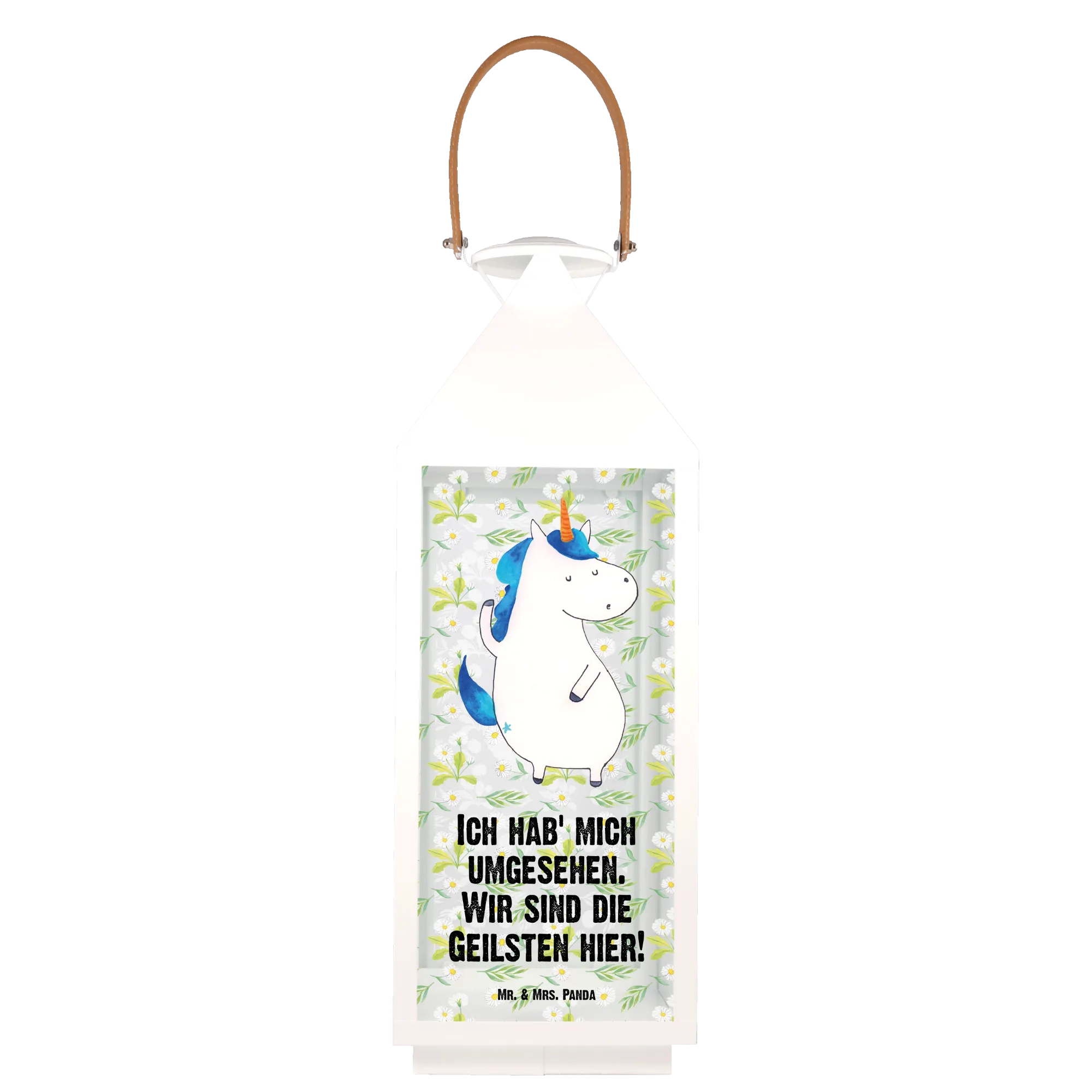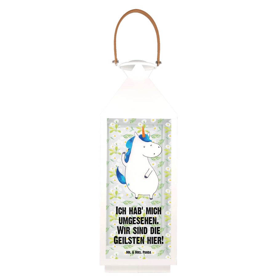 Mit dem Spruch „Ich hab' mich umgesehen. Wir sind die Geilsten hier!“ strahlt diese Laterne Lebensfreude und Selbstbewusstsein aus. Die Einhorn-Kollektion von Mr. & Mrs. Panda bietet eine Vielzahl ähnlicher Produkte, die alle mit Liebe entworfen wurden und die magischen Wesen unserer Kindheit zum Leben erwecken. Hol Dir jetzt die Deko Laterne Einhorn Mann und lass Dein Zuhause erstrahlen.