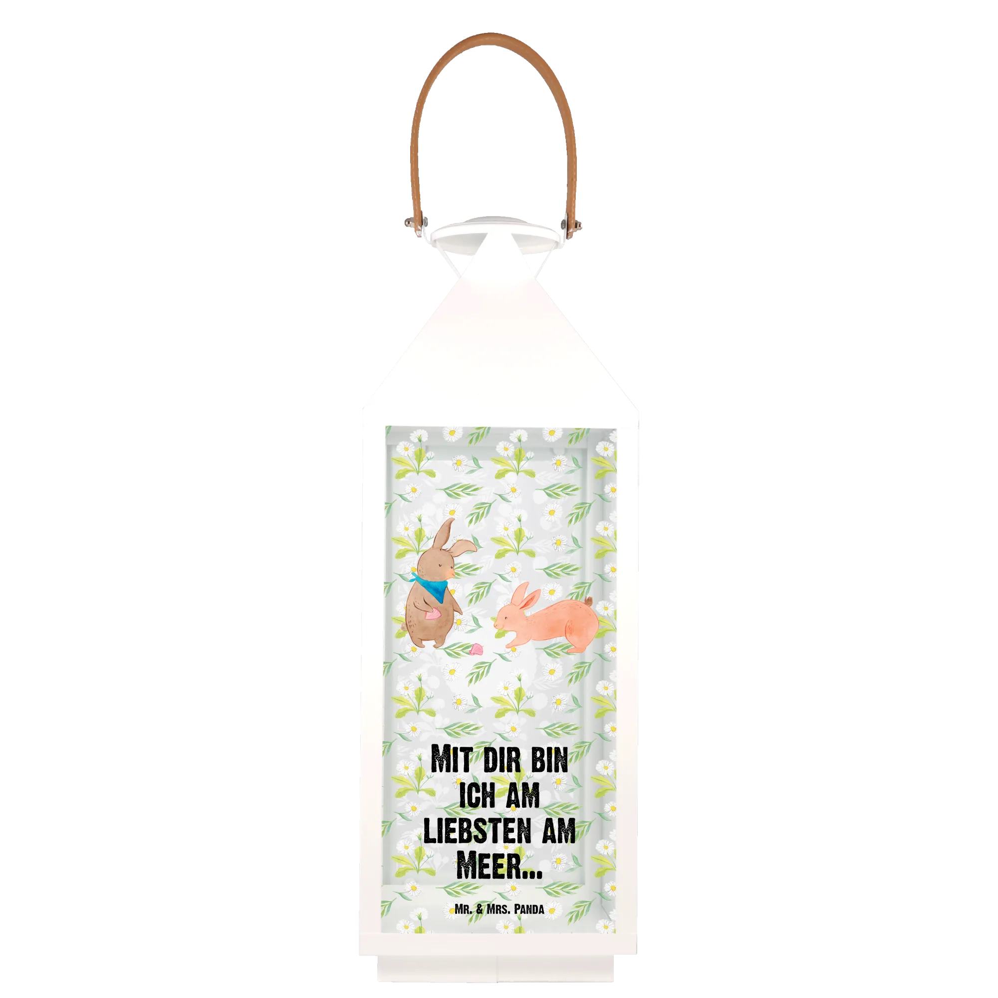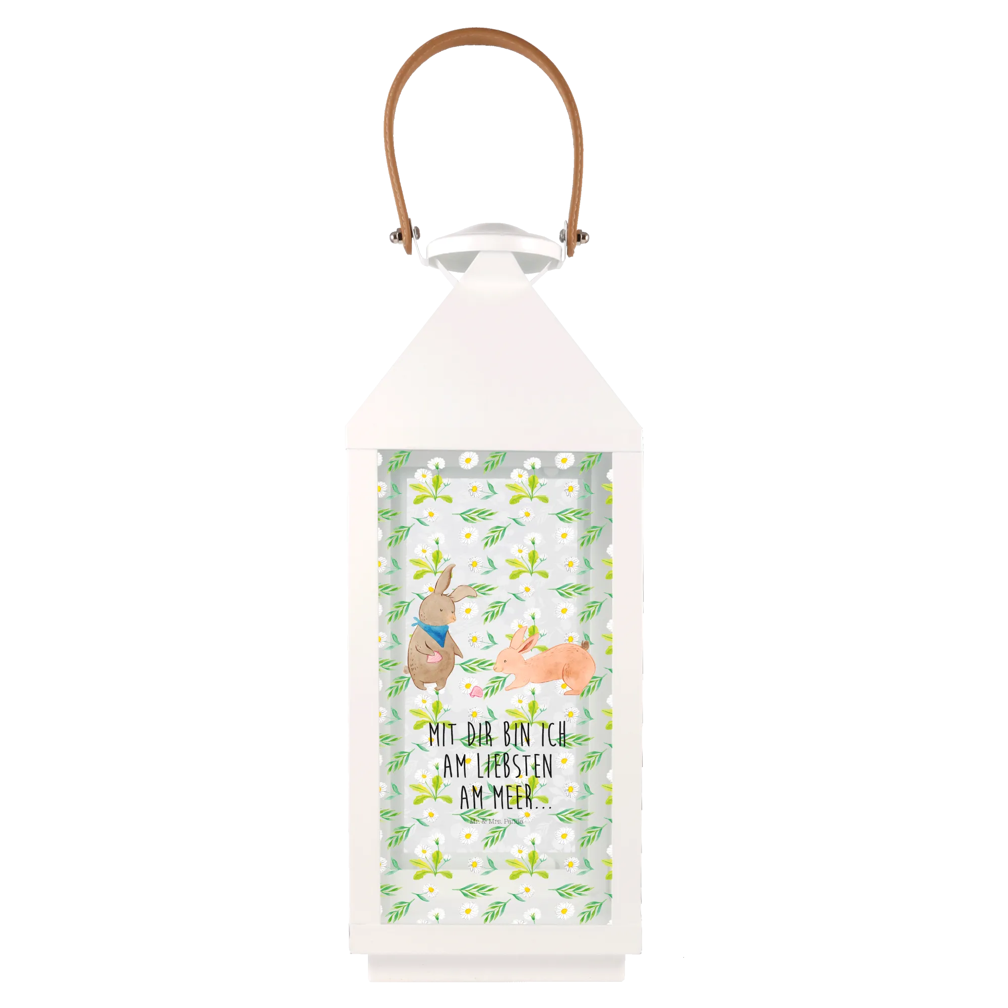 Die Deko Laterne mit dem süßen Hasen Muschel Motiv von Mr. & Mrs. Panda ist die perfekte Geschenkidee für alle, die ihren Garten oder Balkon liebevoll dekorieren möchten. Mit liebevollen Illustrationen, die einen fröhlichen Hasen zeigen, der eine rosafarbene Muschel betrachtet, verleiht diese Laterne deinem Außenbereich eine gemütliche und einladende Atmosphäre.