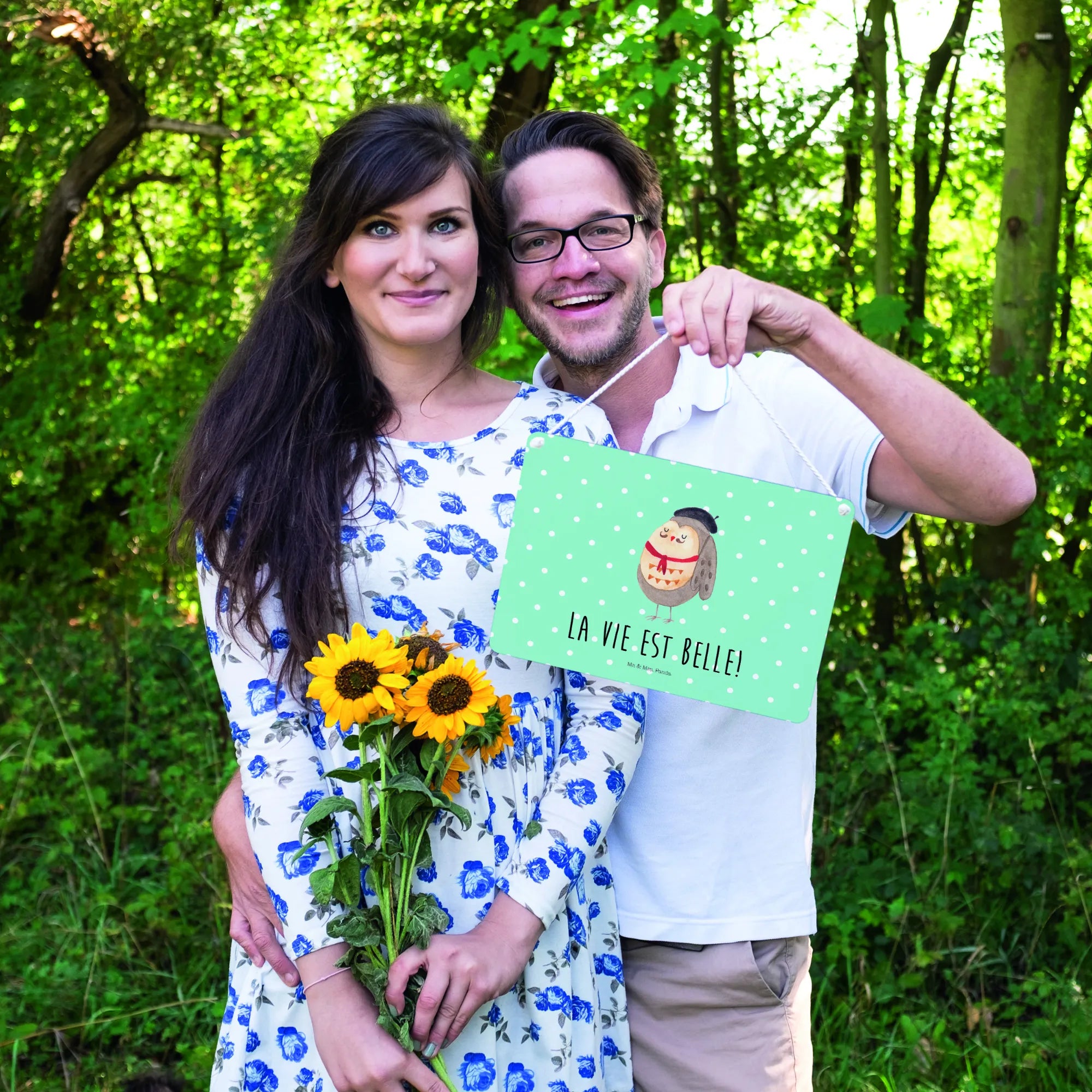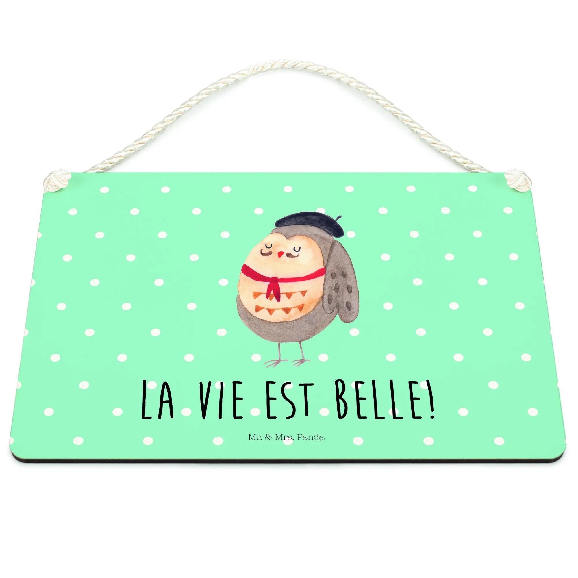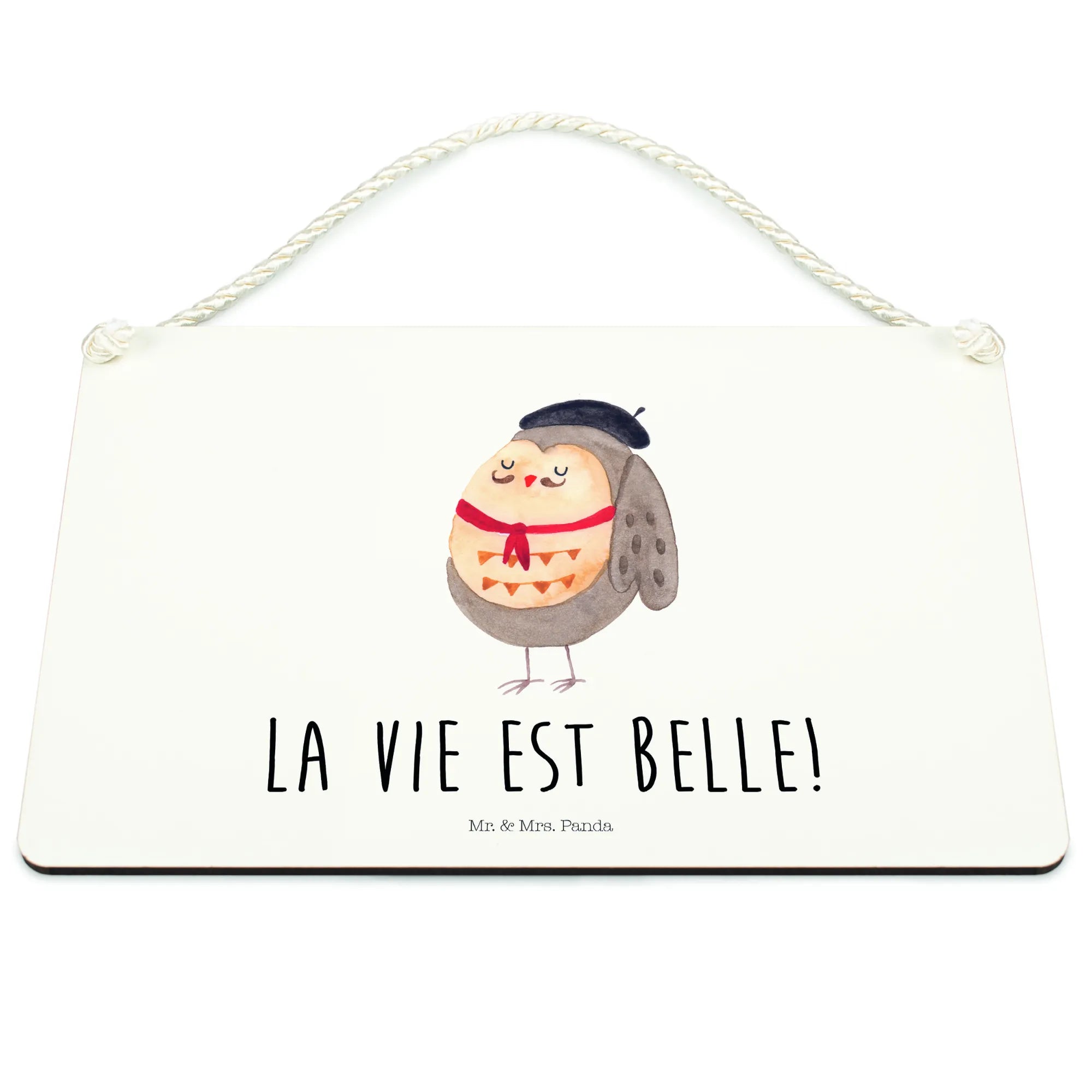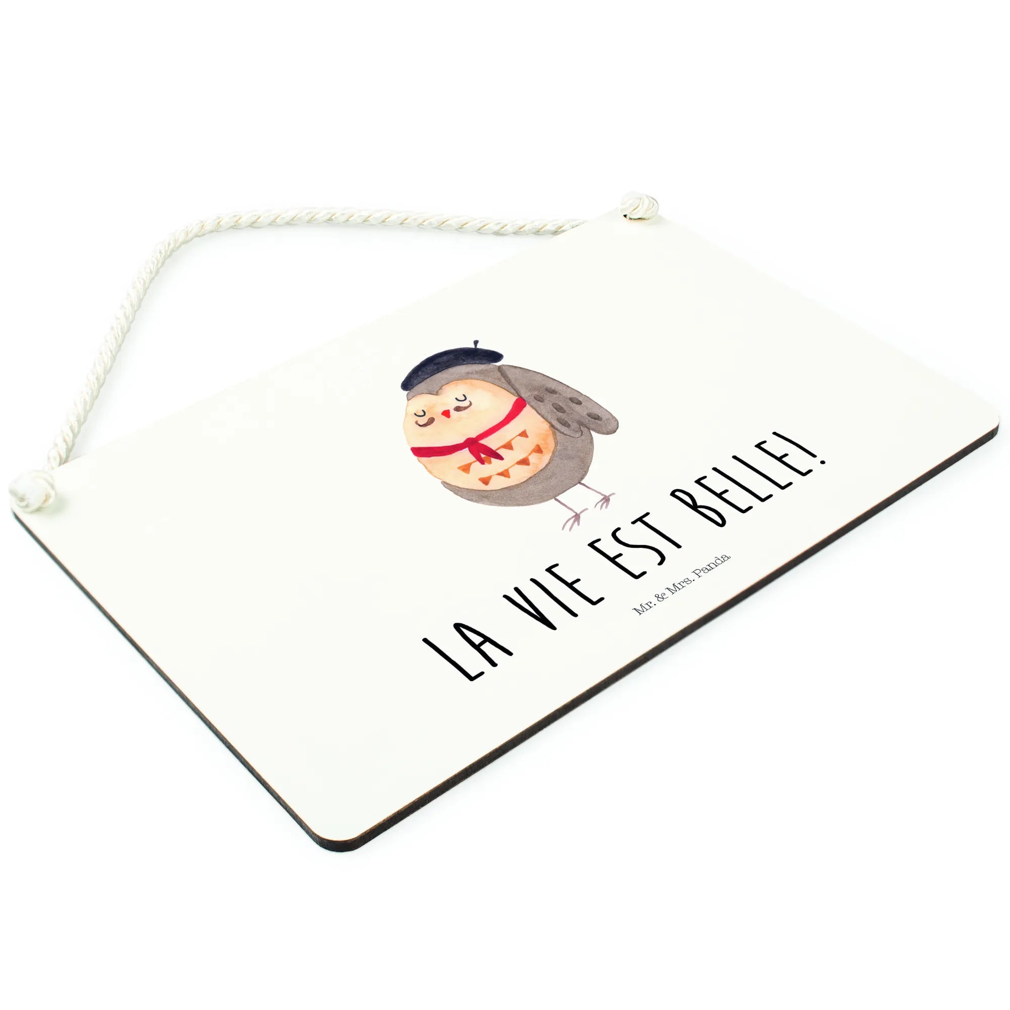 Entdecke unser einzigartiges Deko Schild mit der niedlichen Eule im französischen Look! Das Eulenmotiv von Mr. & Mrs. Panda bringt mit dem charmanten Spruch 'La vie est belle!' ein Stück Lebensfreude und die Schönheit des Lebens in dein Zuhause.