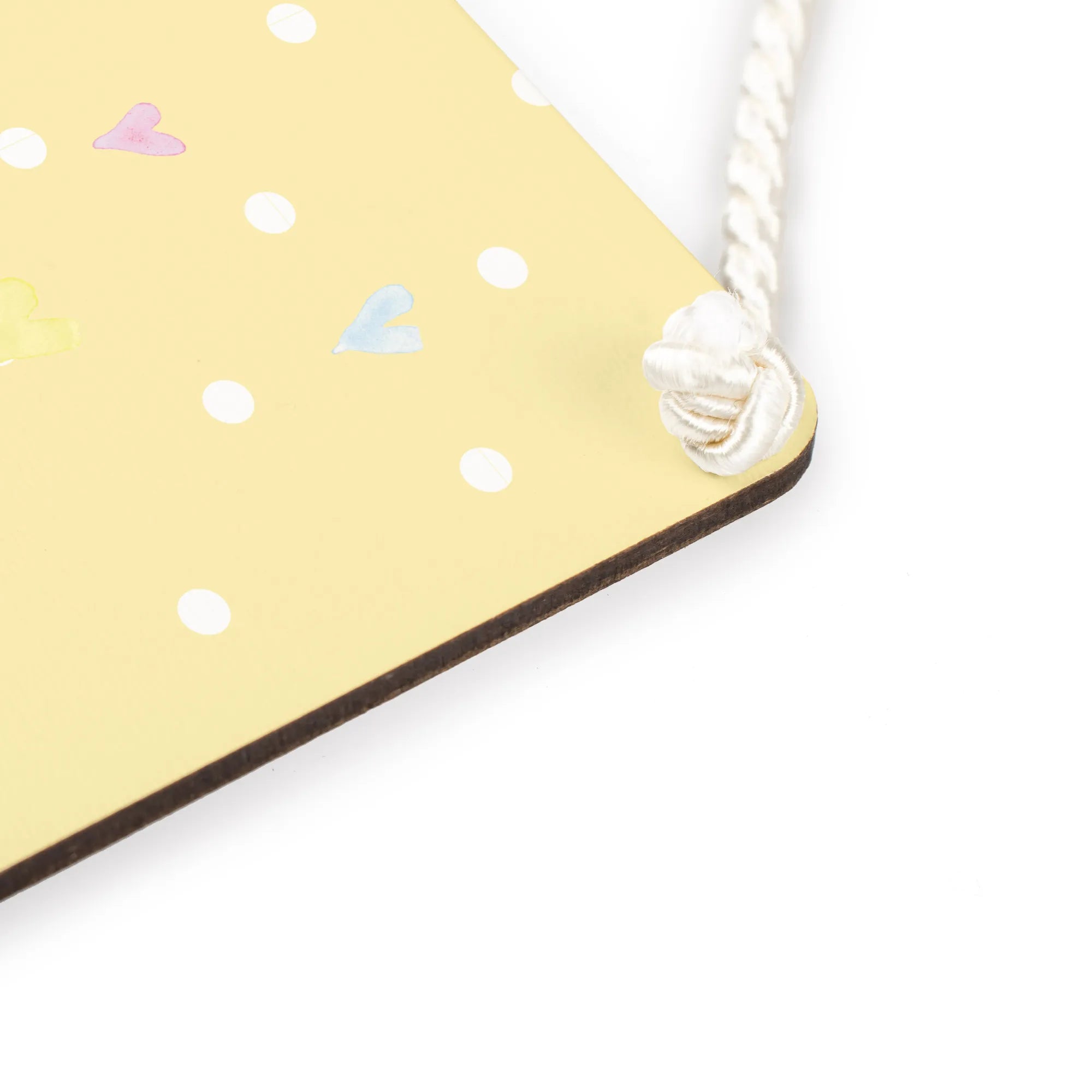 Das Deko Schild ist aus hochwertiger, beschichteter Holzfaser gefertigt, was nicht nur für Langlebigkeit sorgt, sondern auch für ein edles Aussehen. Mit seiner speziellen Aufhängung aus wunderschön gedrehter Kordel lässt es sich einfach und sicher anbringen. Das Schild hat die beliebte DIN A4 Größe und eignet sich perfekt als Dekoration oder als liebevoller Wegweiser.