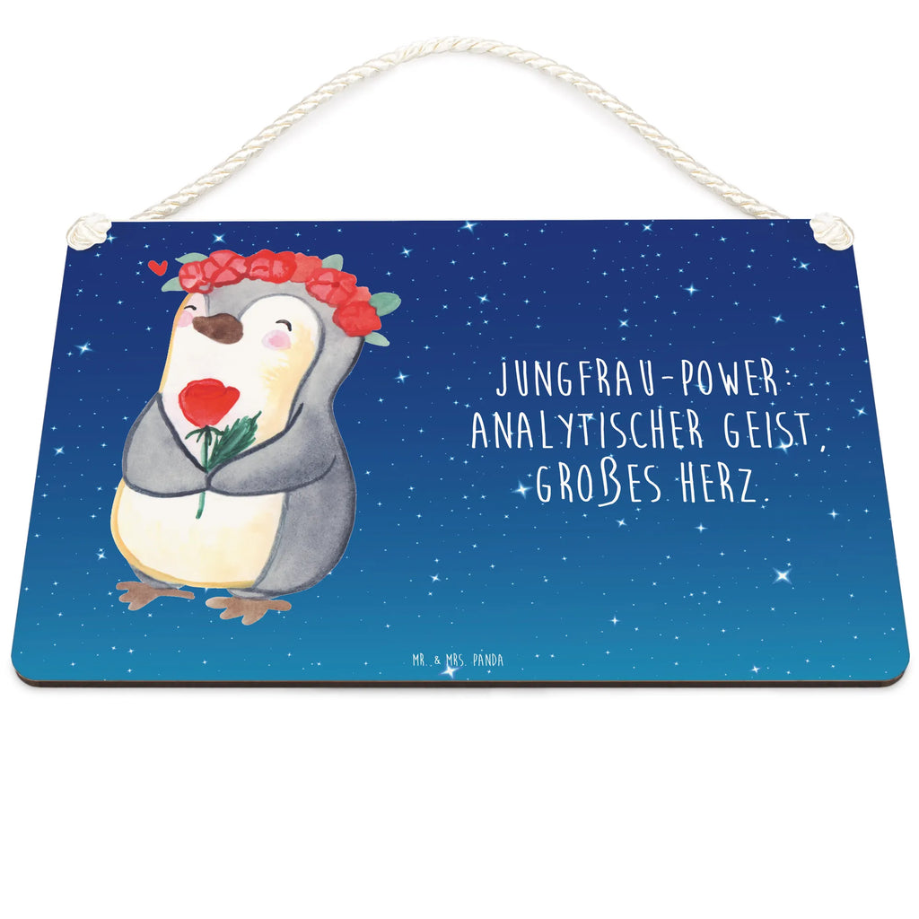 Handgezeichnet von Mrs. Panda, zeigt das Schild einen niedlichen Pinguin mit einem blühenden Blumenkranz und einer wunderschönen Blume in der Flosse. Mit dem Slogan 'Jungfrau-Power: Analytischer Geist, großes Herz.' unterstreicht es die Charakterzüge, die dieses Sternzeichen so besonders machen.