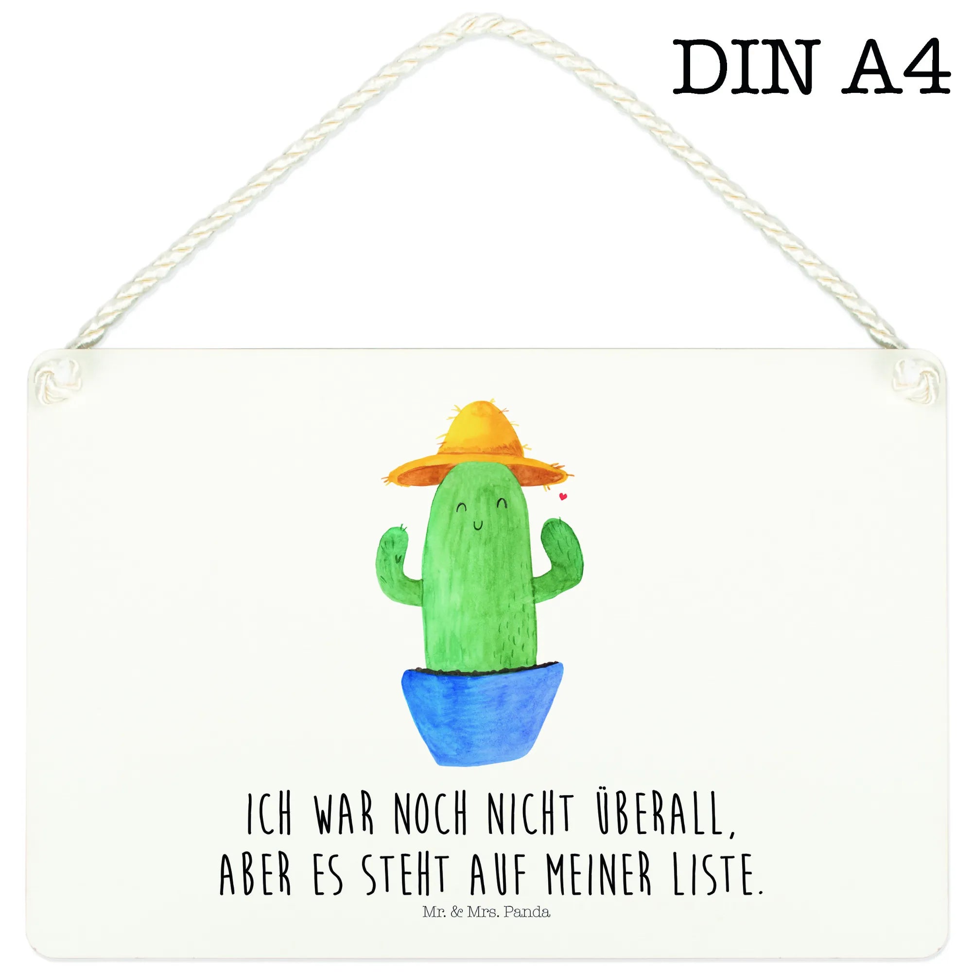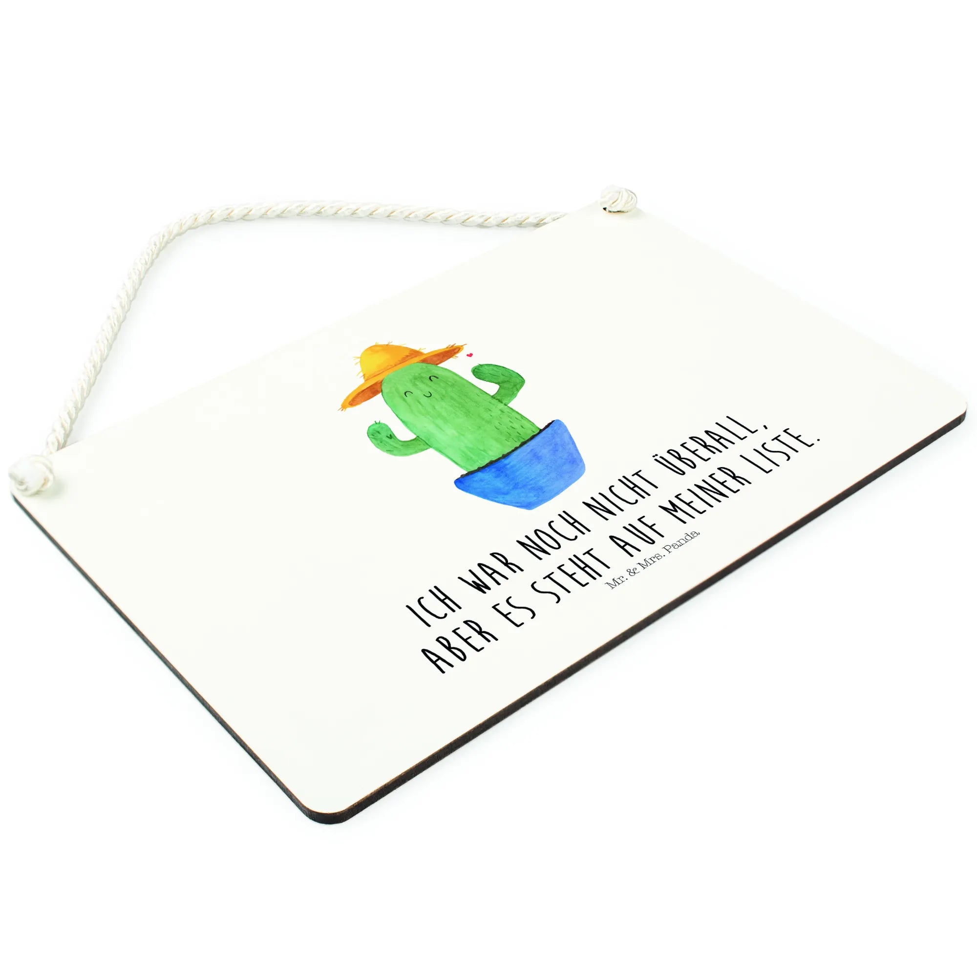 Das Schild zeigt einen süßen, lächelnden Kaktus, der stolz seinen Sonnenhut trägt und in Aquarelltechnik liebevoll von Mrs. Panda gemalt wurde. Der Spruch "Ich war noch nicht überall, aber es steht auf meiner Liste." ist nicht nur motivierend, sondern auch eine wunderbare Erinnerung daran, die Welt zu erkunden und neue Abenteuer zu erleben. Ideal für alle Weltenbummler und Reiseverrückten!