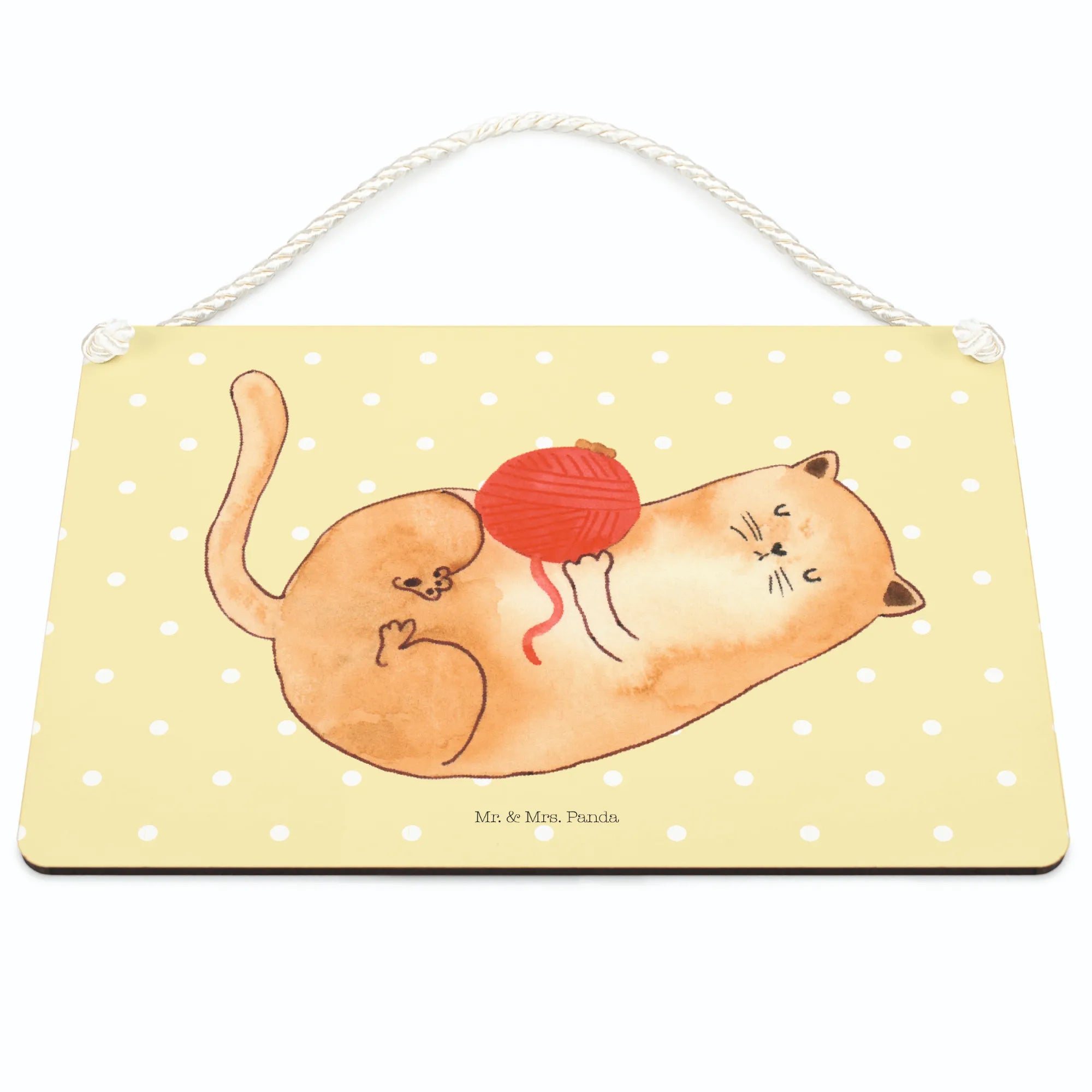 Mit dem niedlichen Motiv einer verspielten Katze, die mit ihrem Wollknäuel spielt, zaubert es jedem ein Lächeln ins Gesicht. Das Schild wird aus hochwertiger MDF-Platte gefertigt und ist langlebig sowie robust. Dank seiner beschichteten Oberfläche ist es optimal vor Witterungseinflüssen geschützt und somit perfekt für die Verwendung im Innen- und Außenbereich geeignet.
