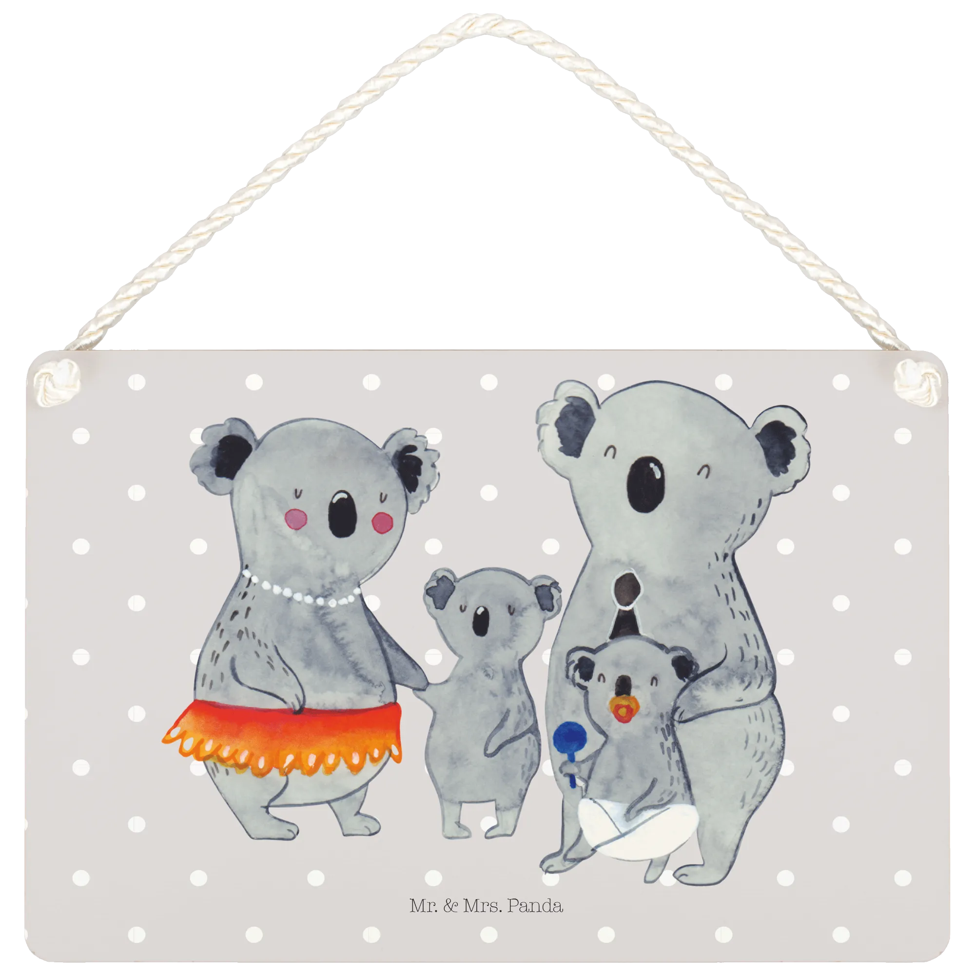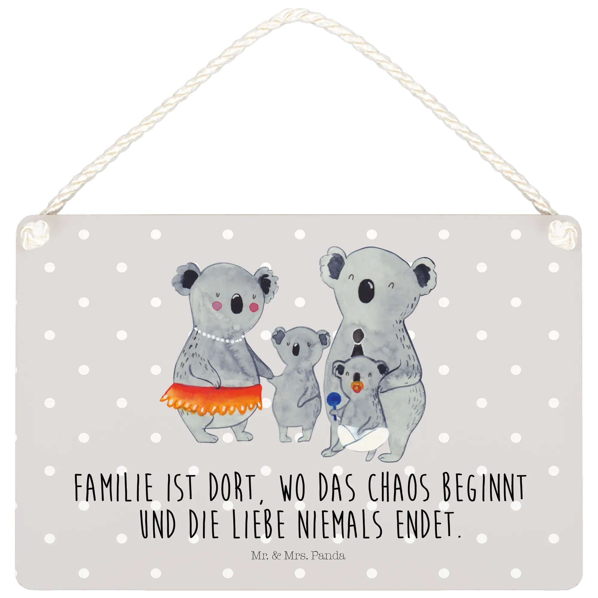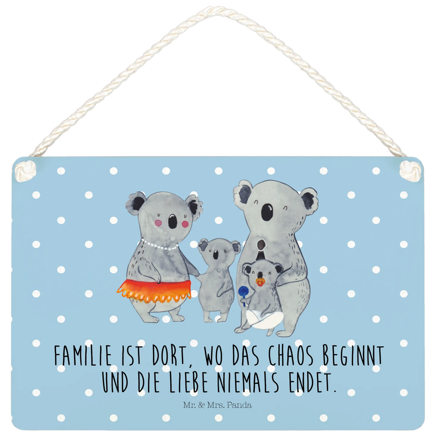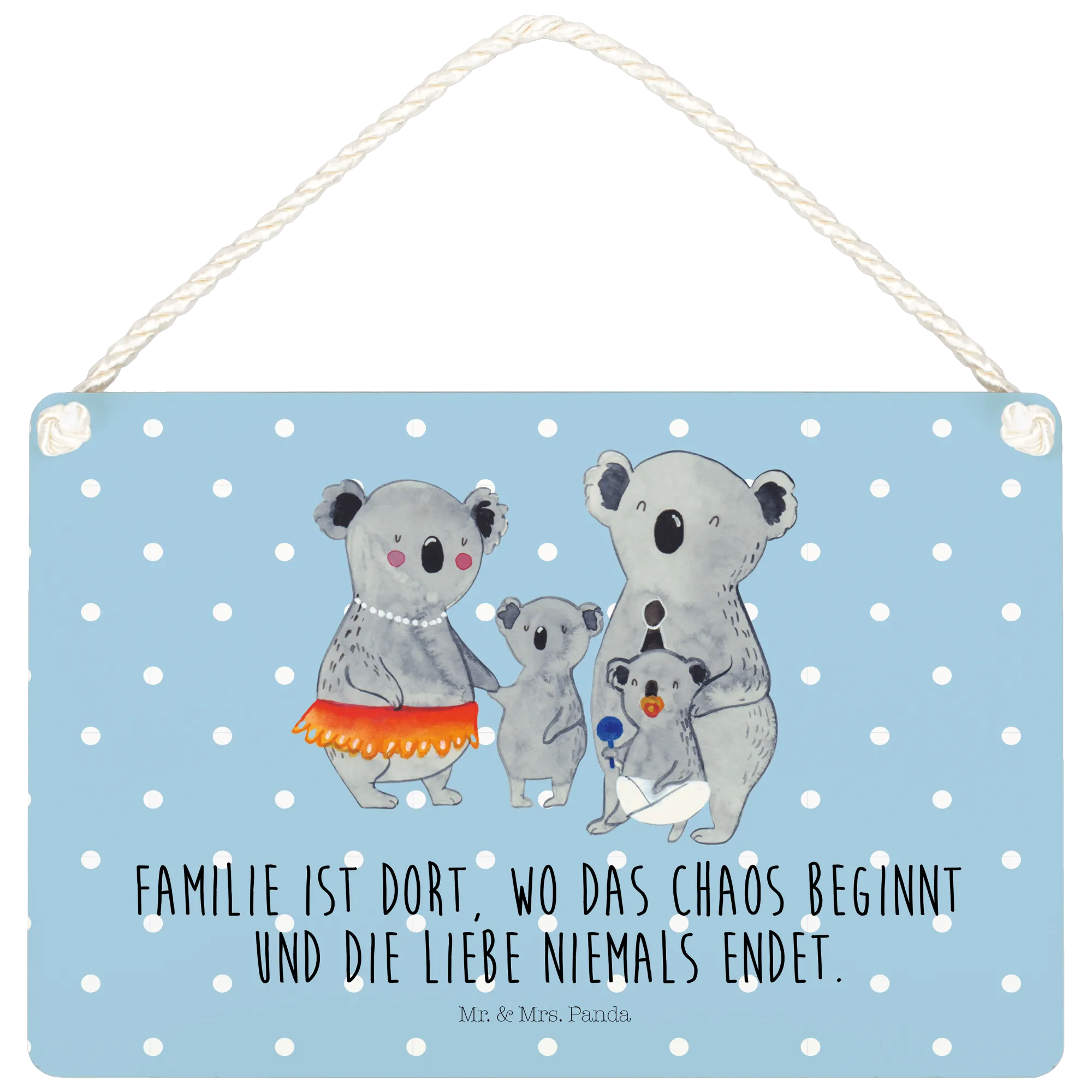 Das süße Deko Schild "Koala Familie" von Mr. & Mrs. Panda ist das perfekte Geschenk für alle, die Liebe und Geborgenheit in ihrer Familie schätzen. Mit dem charmanten Motiv einer fröhlichen Koala Familie, bestehend aus zwei großen und zwei kleinen Koalas, die menschliche Züge und Accessoires tragen, zaubert es jedem ein Lächeln ins Gesicht.