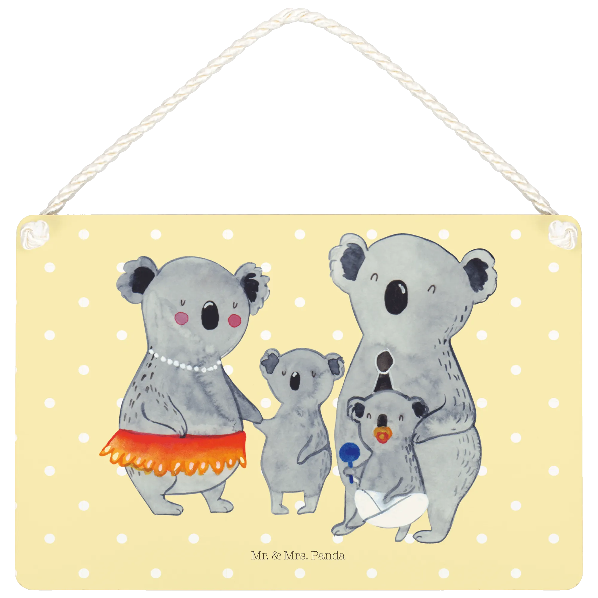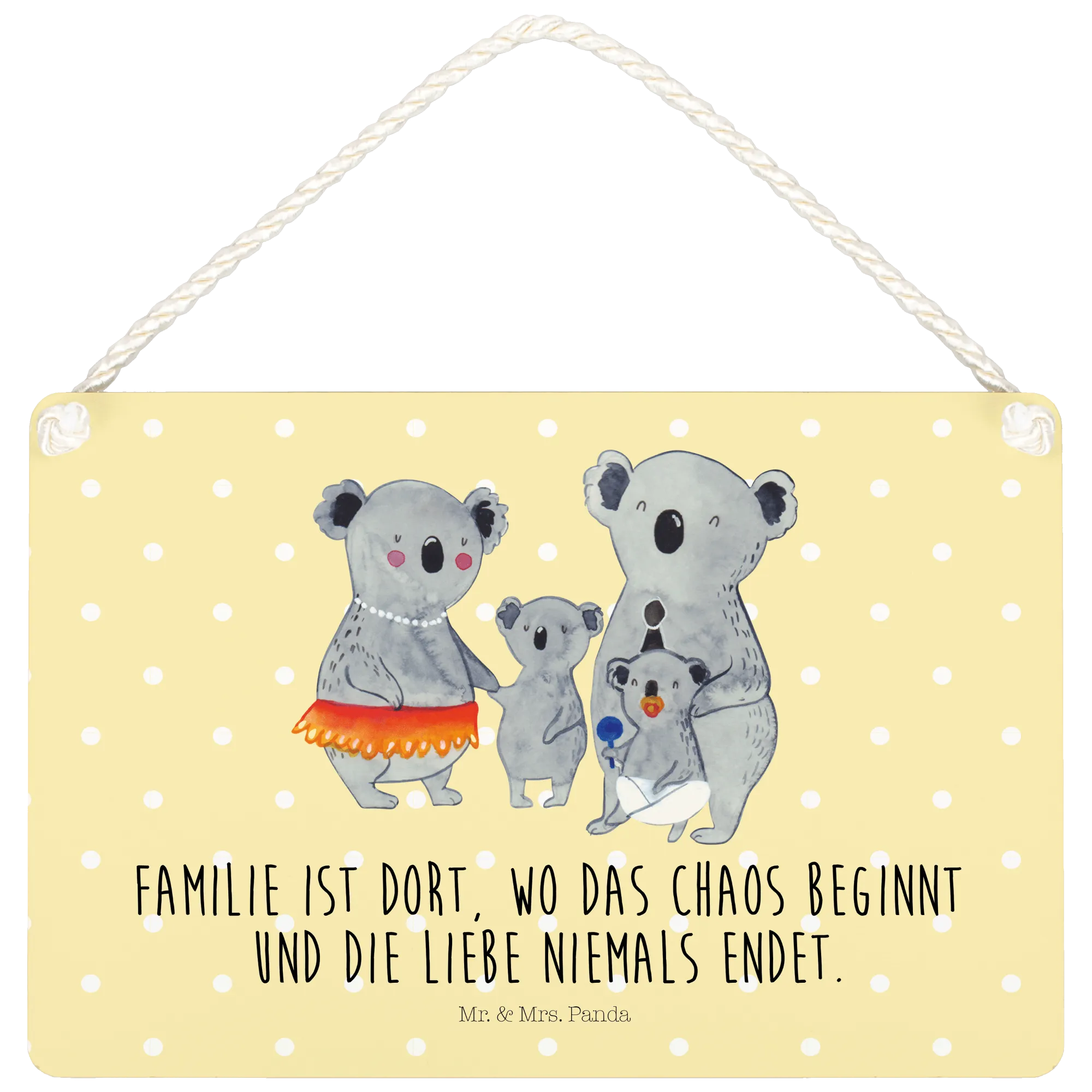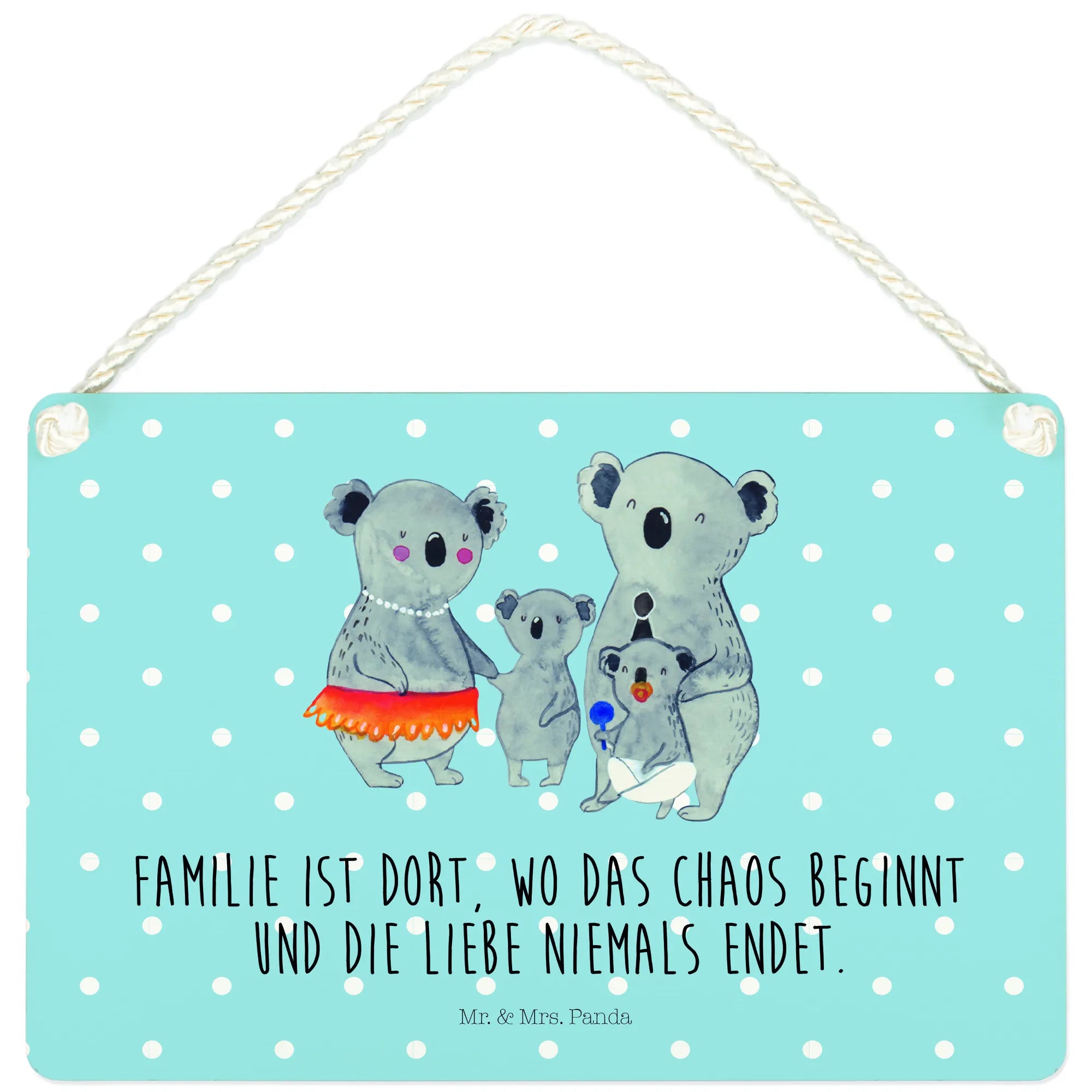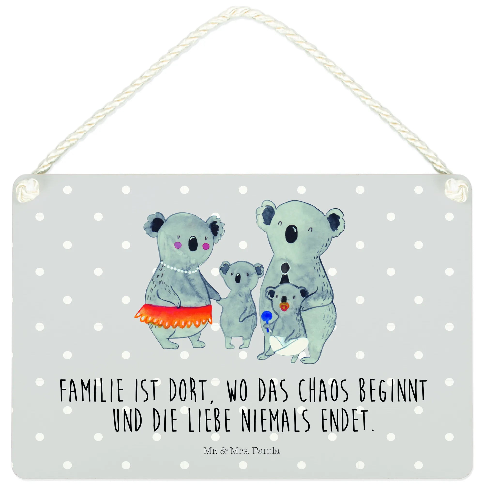 Das süße Deko Schild "Koala Familie" von Mr. & Mrs. Panda ist das perfekte Geschenk für alle, die Liebe und Geborgenheit in ihrer Familie schätzen. Mit dem charmanten Motiv einer fröhlichen Koala Familie, bestehend aus zwei großen und zwei kleinen Koalas, die menschliche Züge und Accessoires tragen, zaubert es jedem ein Lächeln ins Gesicht.